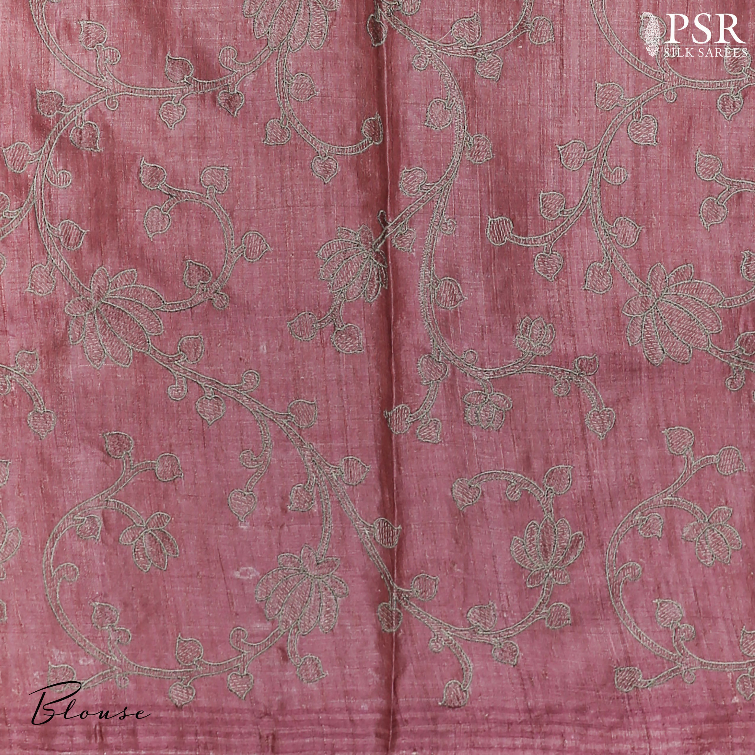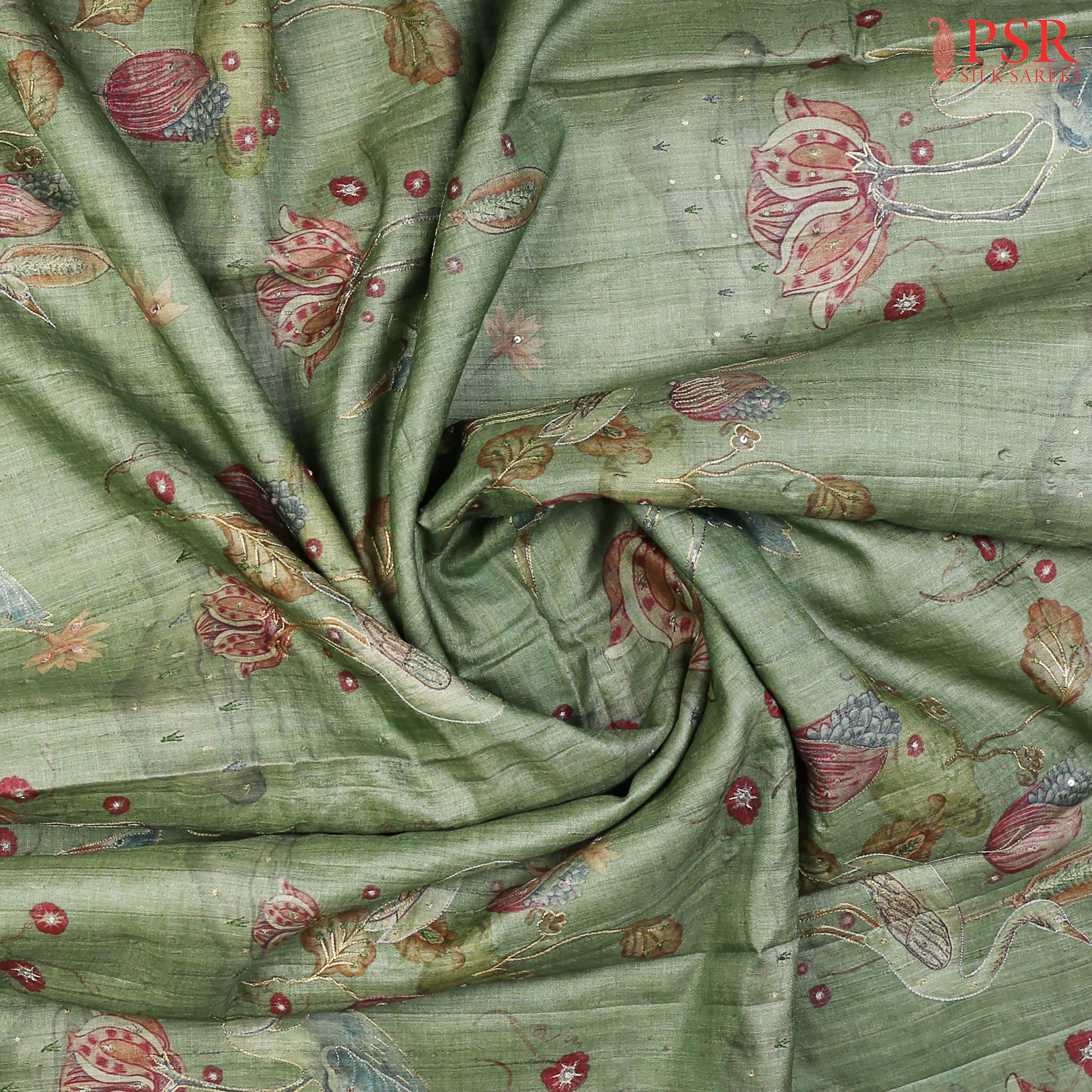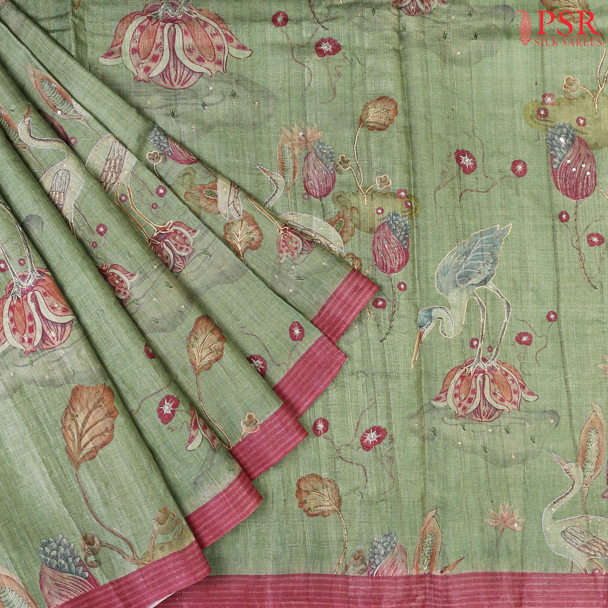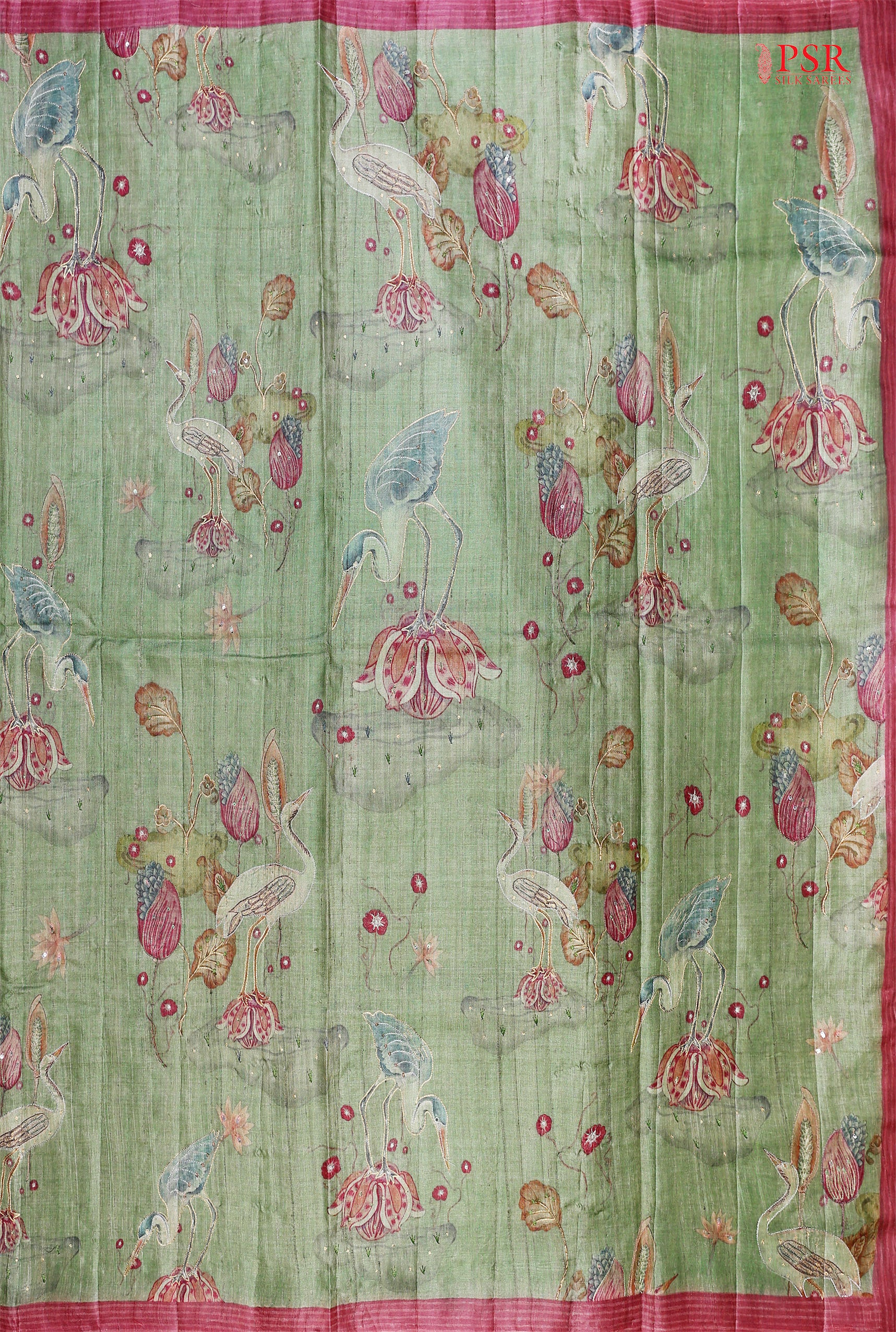 Make a bold yet elegant statement with our Asparagus Green Kadhi Tussar Silk Saree, perfectly paired with the rich tones of Dark Orchid Pink. This stunning drape is adorned with vibrant floral and crane prints, enhanced by intricate aari embroidery for a luxurious finish. The saree features a delicate Dark Orchid Pink border and a matching pallu, completing the look with effortless grace. Paired with a Dark Orchid Pink blouse featuring Asparagus Green scroll floral embroidery, this saree is an exquisite blend of tradition and modern sophistication.