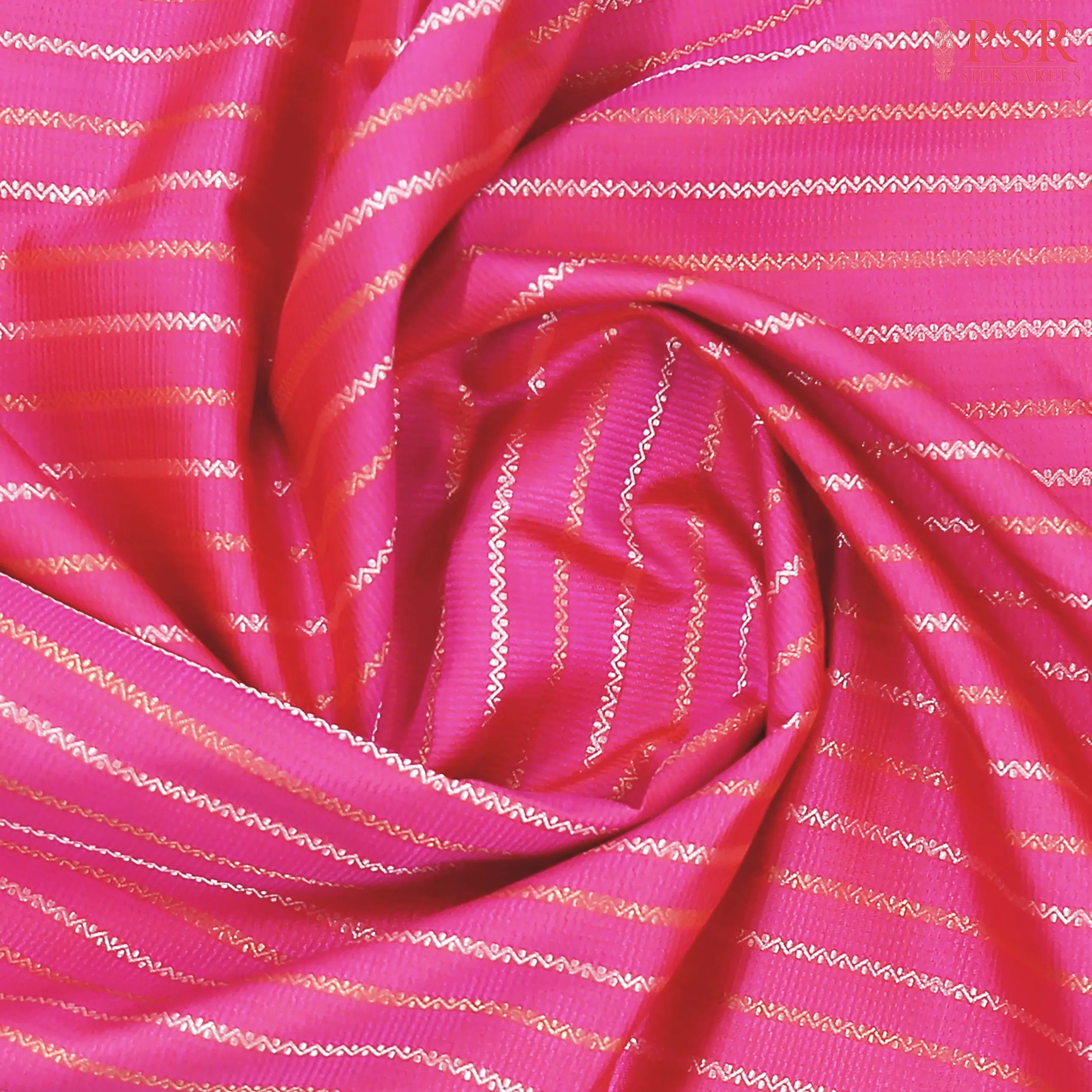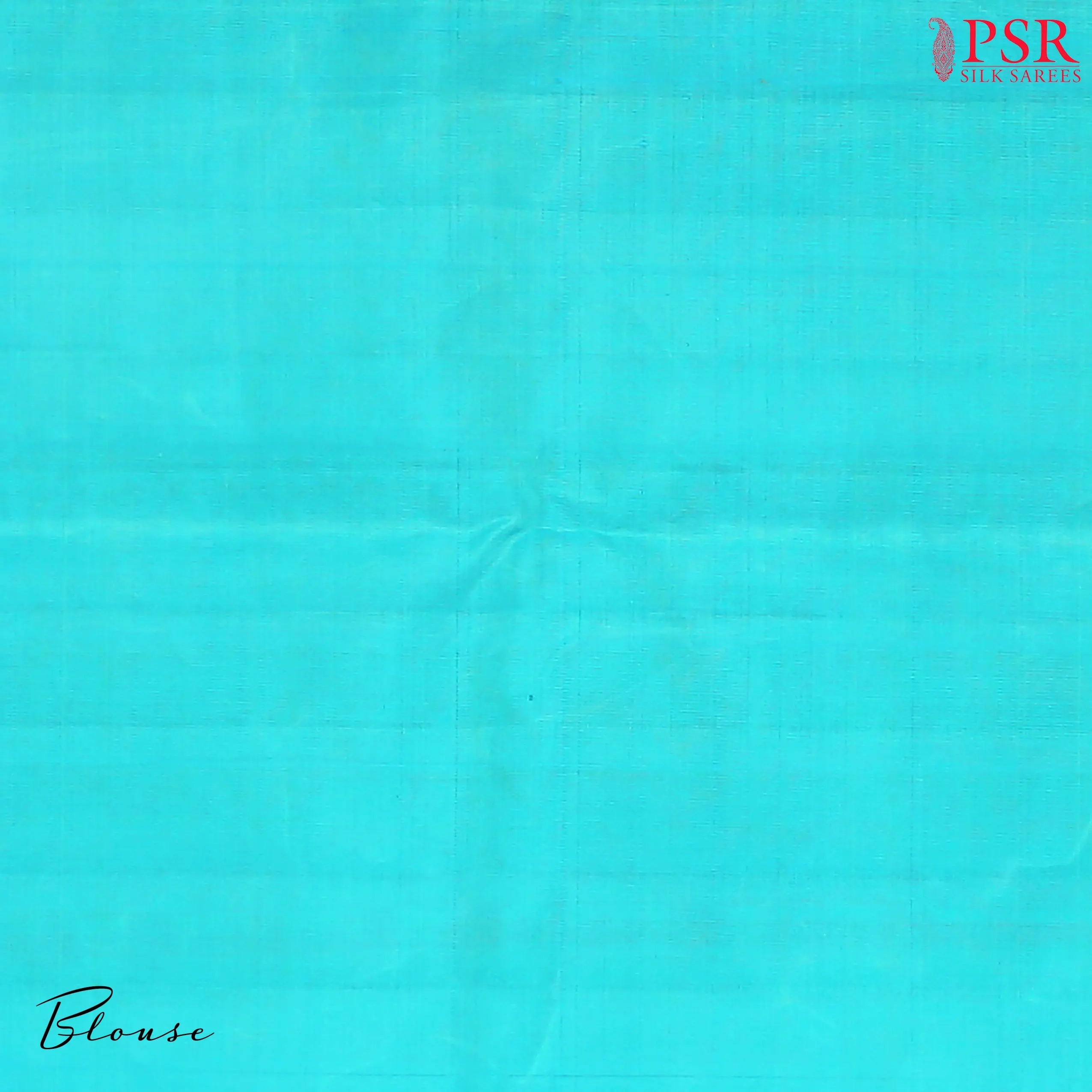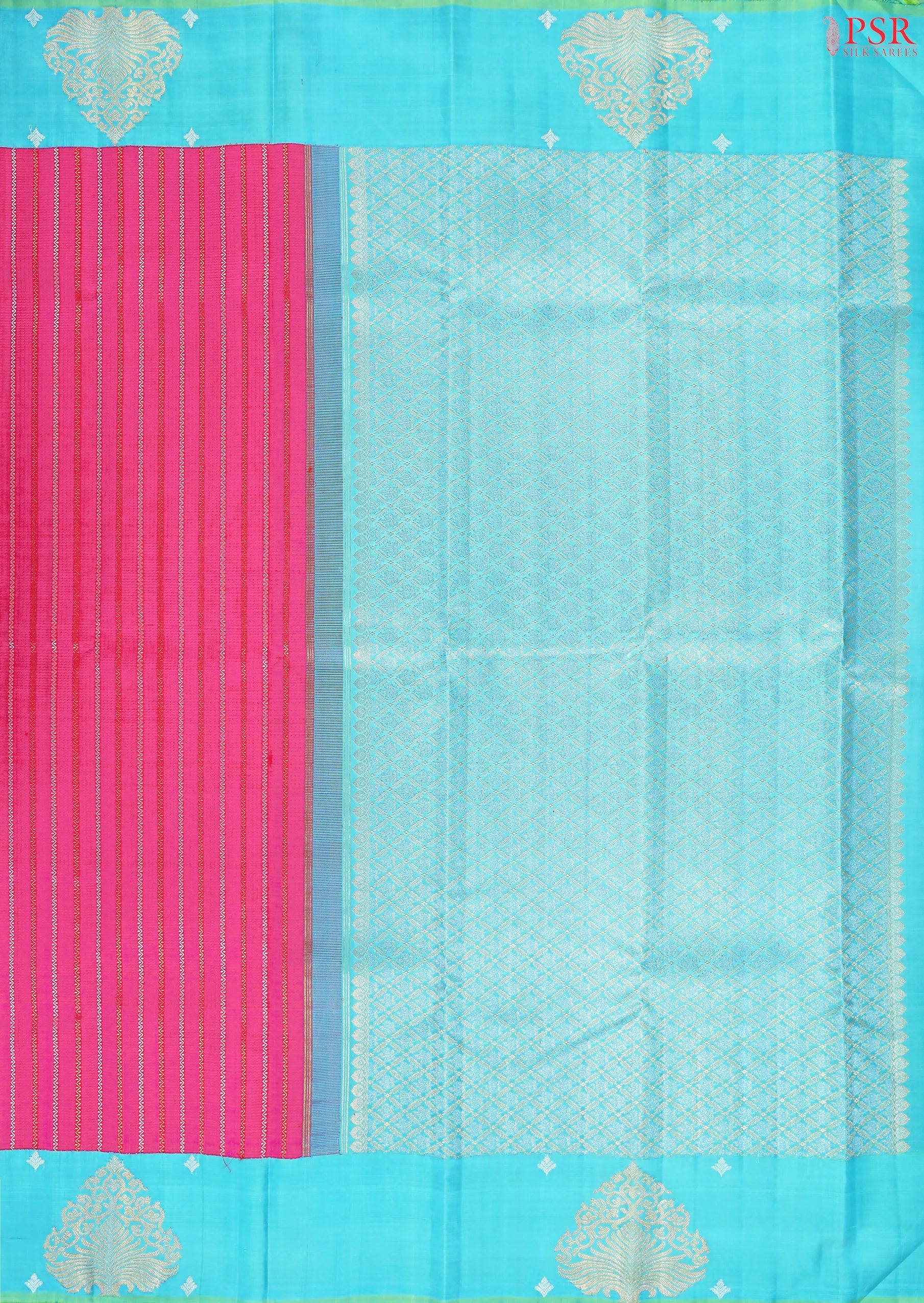 PSR Silk Sarees presents a charming Rani Pink Green Kanchipuram Silk Saree paired with a delightful Aqua Blue combination, radiating youthful elegance and festive grace.