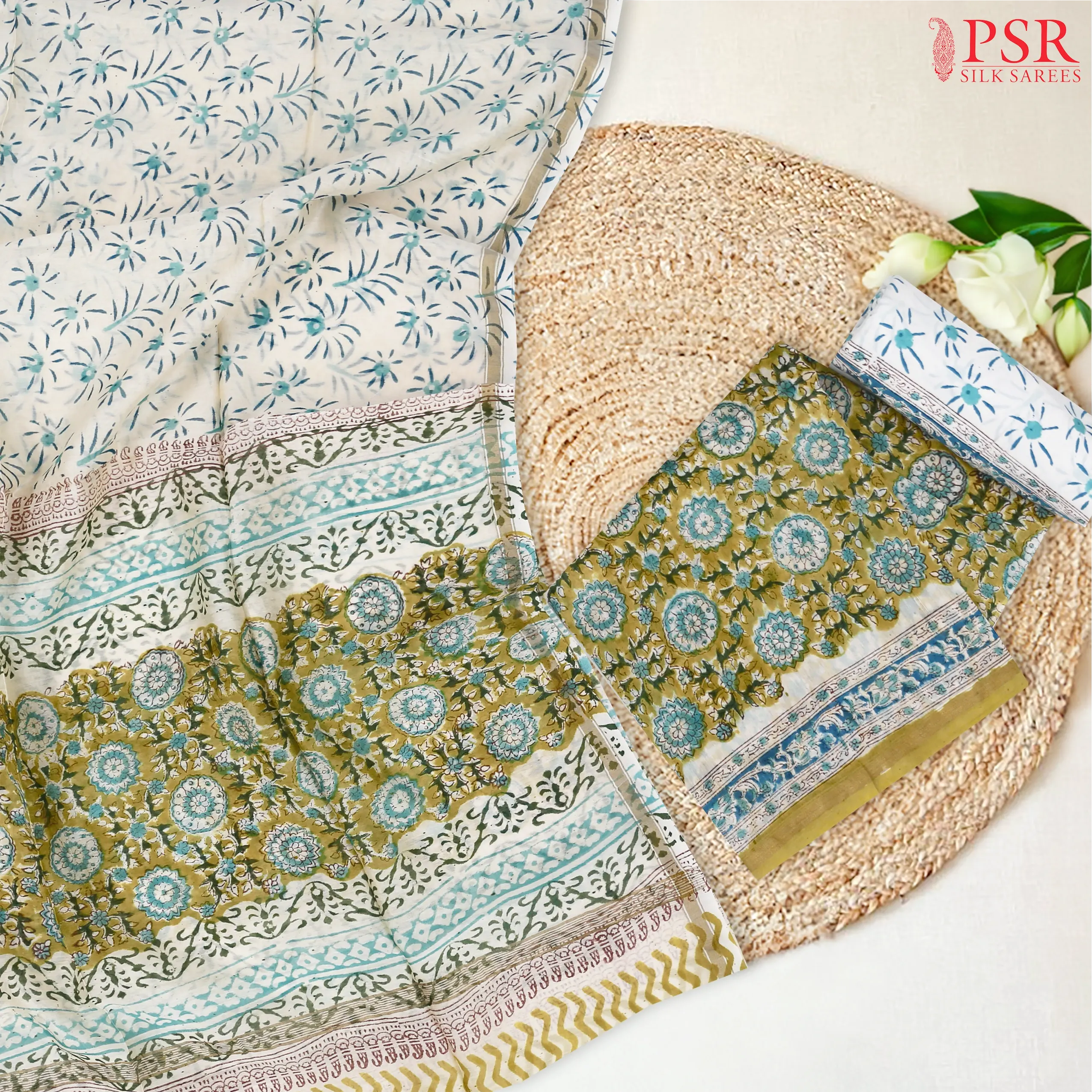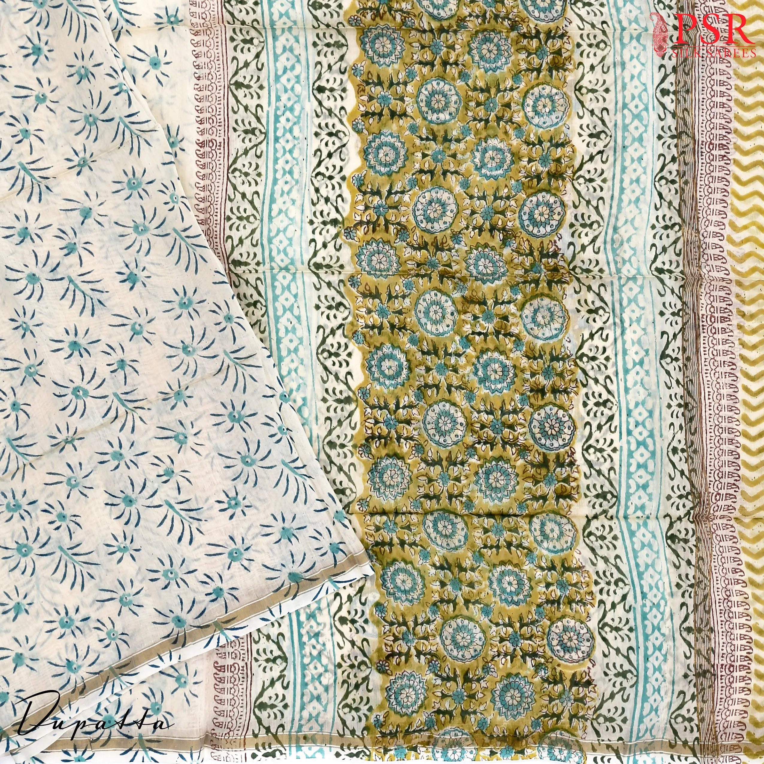 PSR Silks presents Warm Olive Chanderi Silk Cotton Dress Material with combination of White color.