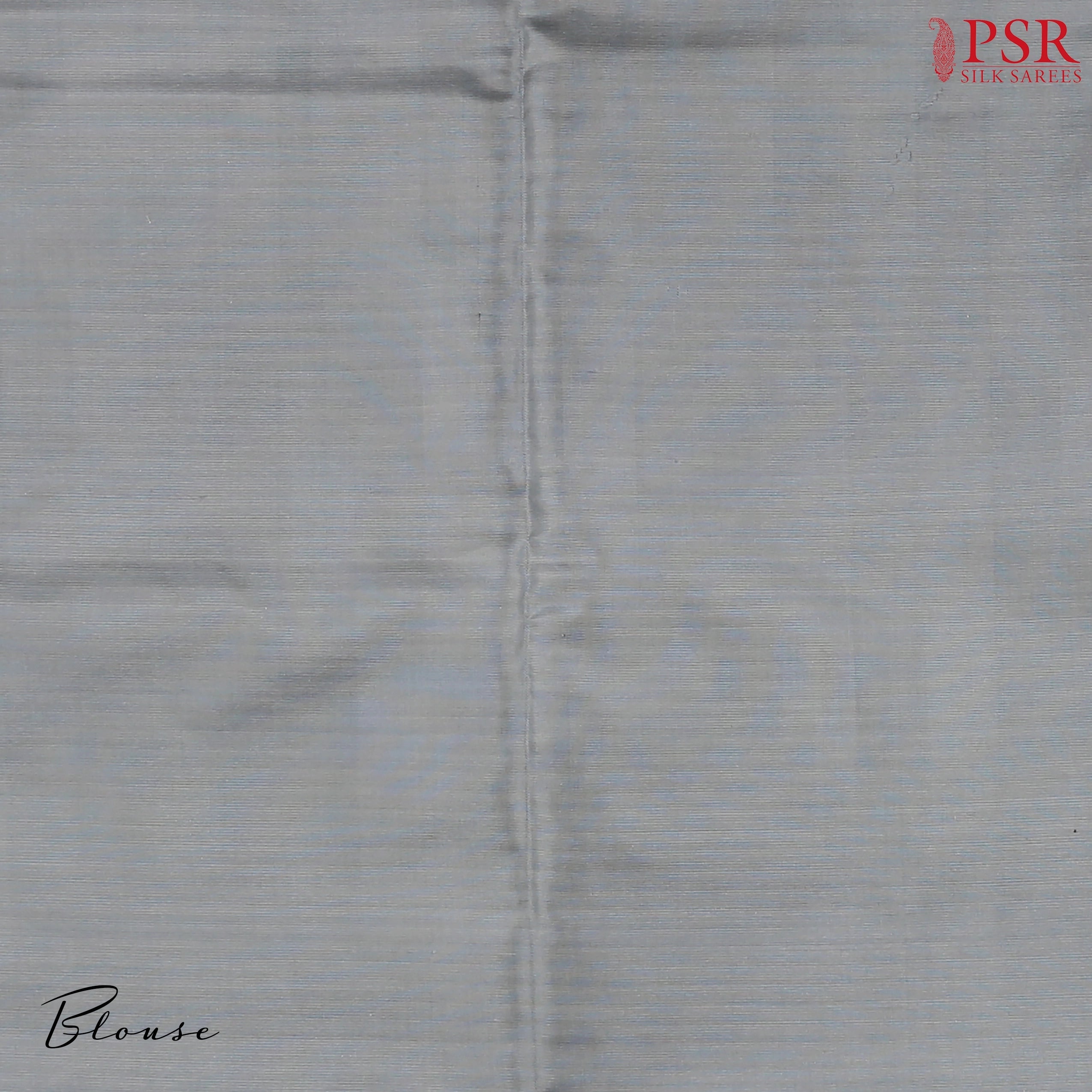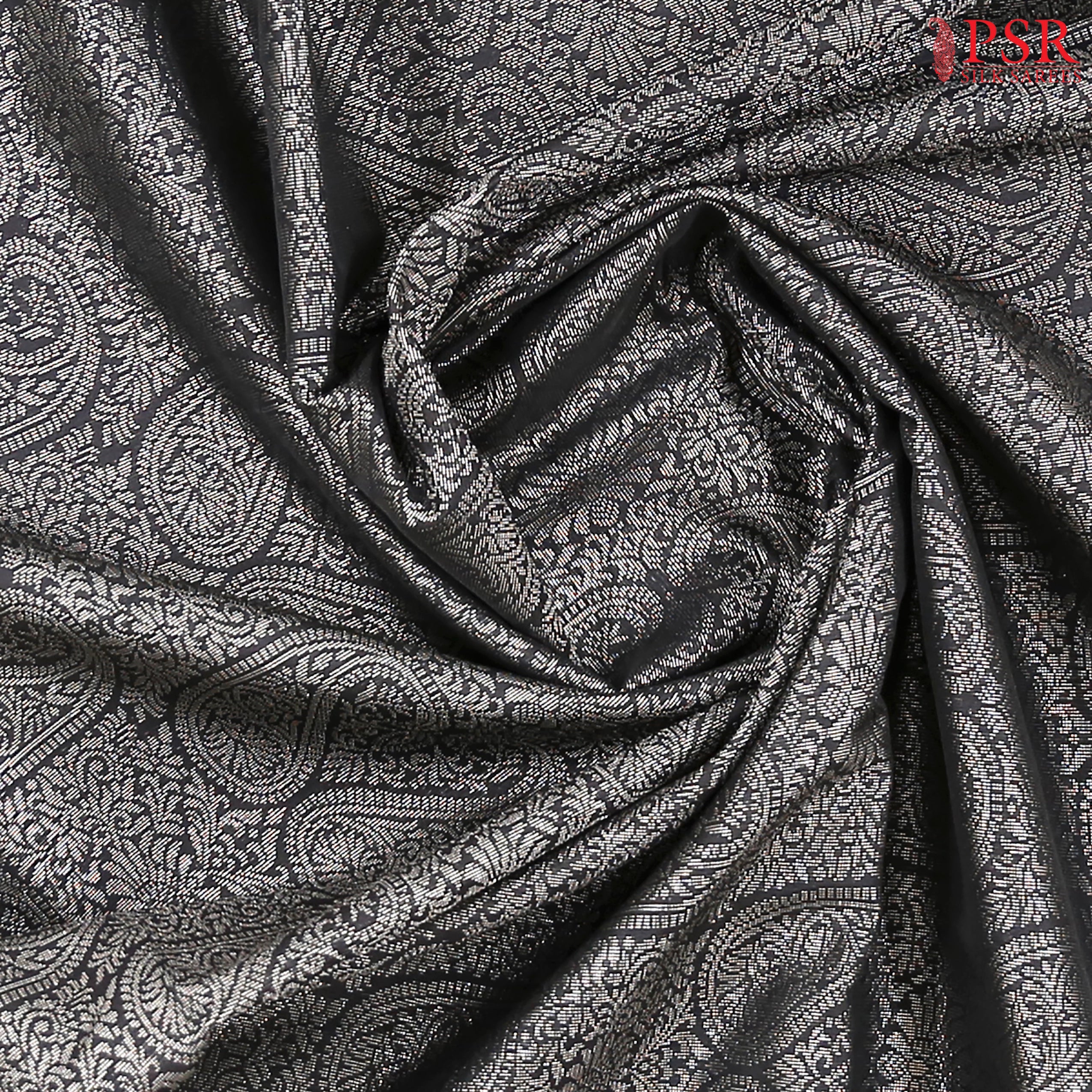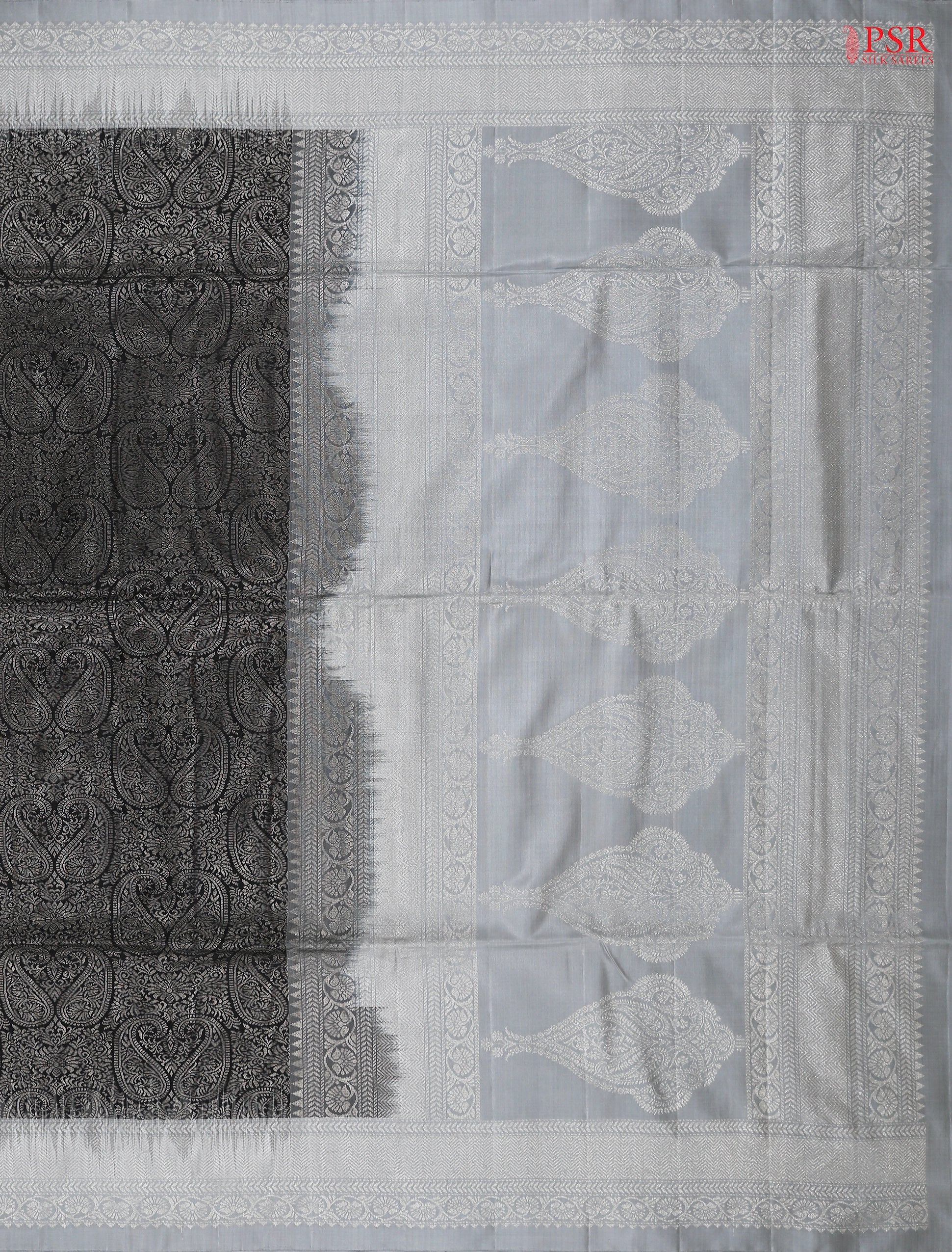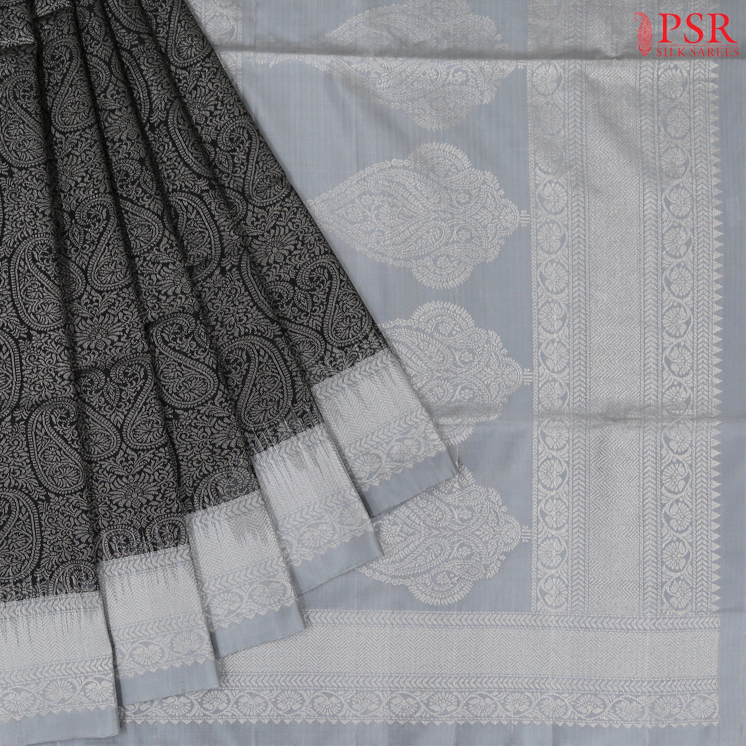 PSR Silk Sarees presents a mesmerizing Black Soft Silk Saree, beautifully paired with a Grey contrast. The saree showcases intricate scroll paisley and floral rich zari jacquard weaves, exuding timeless elegance. It is complemented with a traditional Grey zari work pallu and border, and comes with a plain Grey blouse for a refined finish.