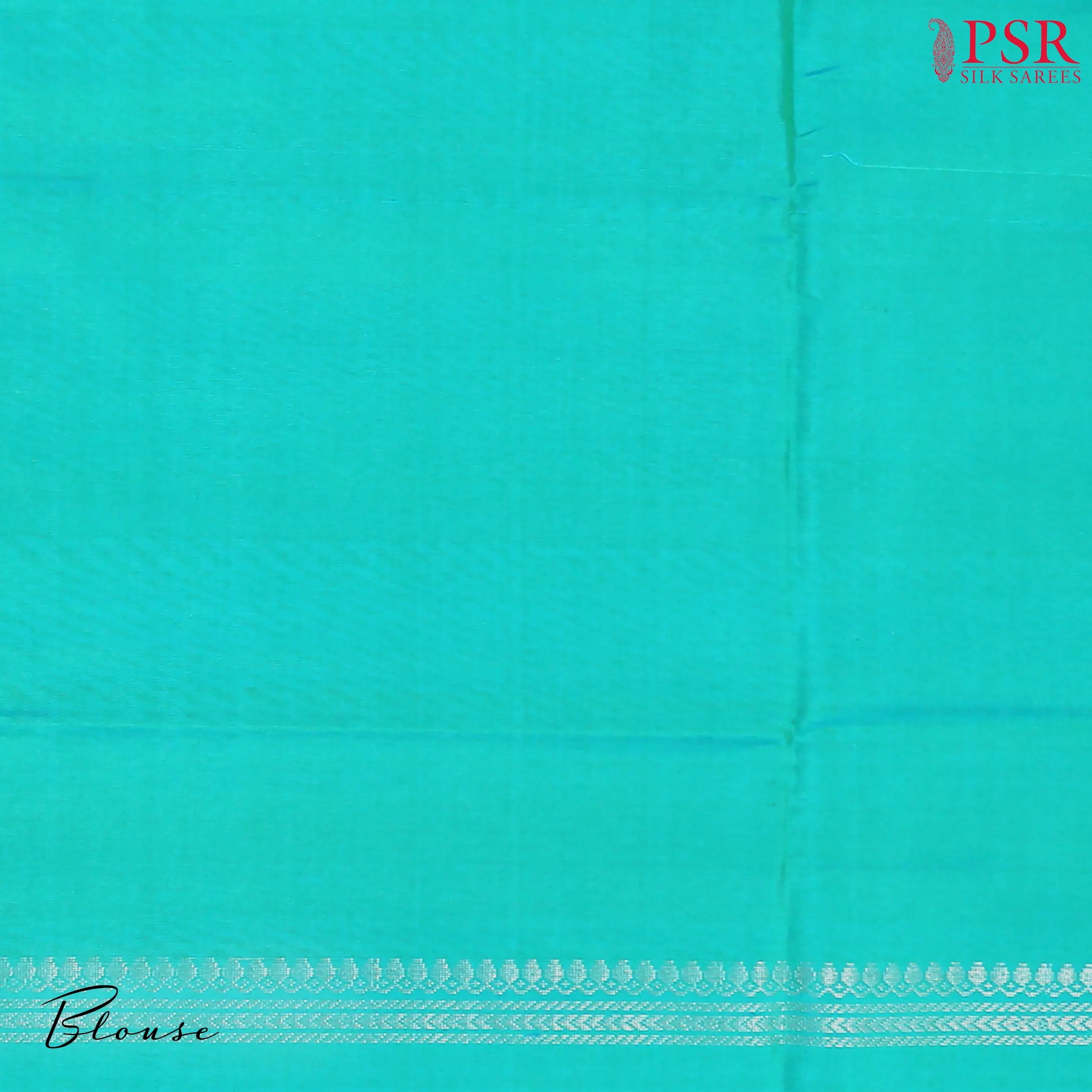 The saree showcases beautifully woven silver & copper zari designer stripes accented adding a modern touch to its timeless silk elegance. The Verdigris BlueĀ pallu shimmers with rich traditional zari work, while the plain Verdigris Blue blouse and border complete its refined appeal.