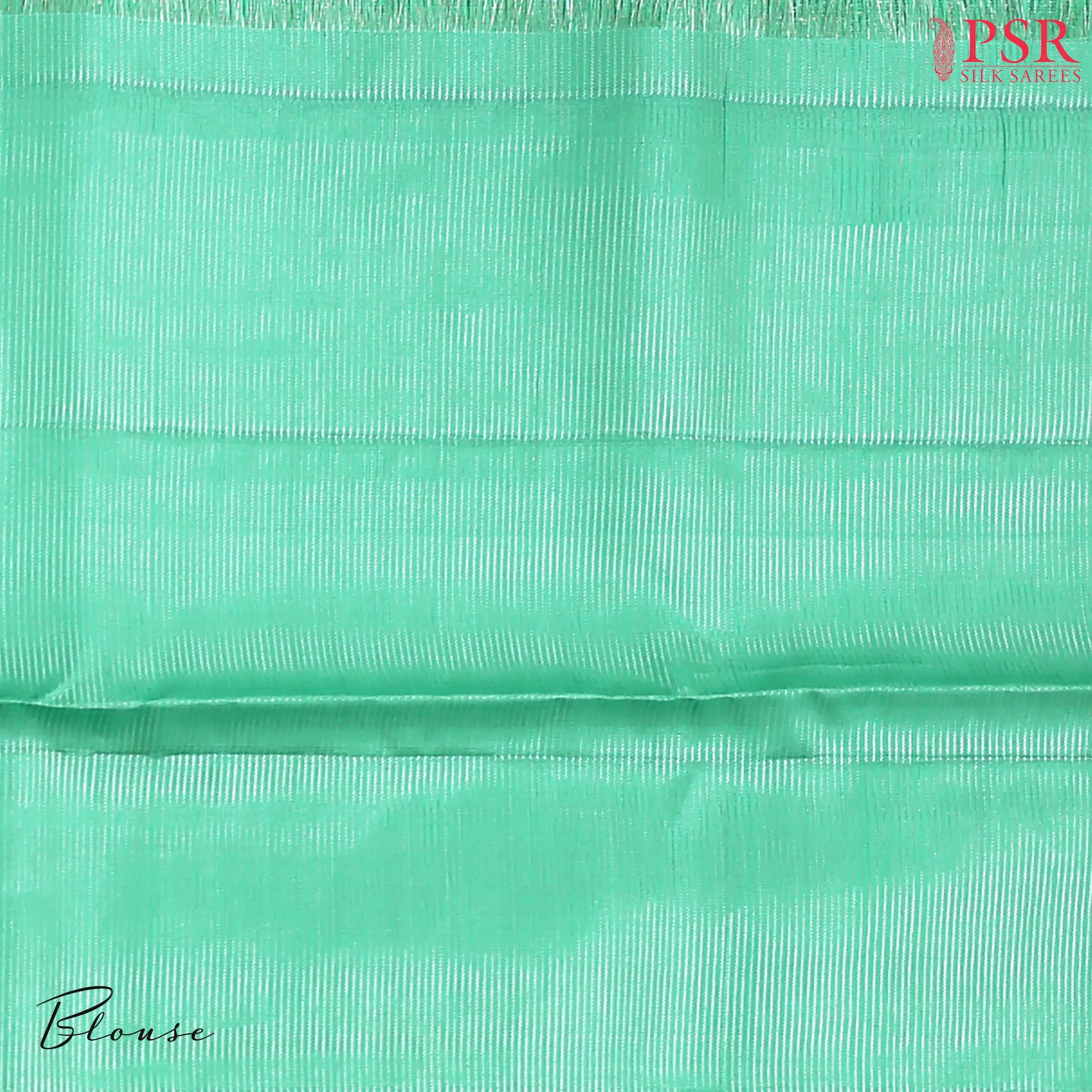 The stylish borderless saree featuresĀ silver zari plaid weaves enriched with designer zari weaves, adding a regal charm to its appearance. The look is elevated with a contrasting Sea Green pallu adorned with rich and traditional zari work. Completing the ensemble is a Sea Green blouse with zari stripes, harmonizing beautifully with the sareeās design.