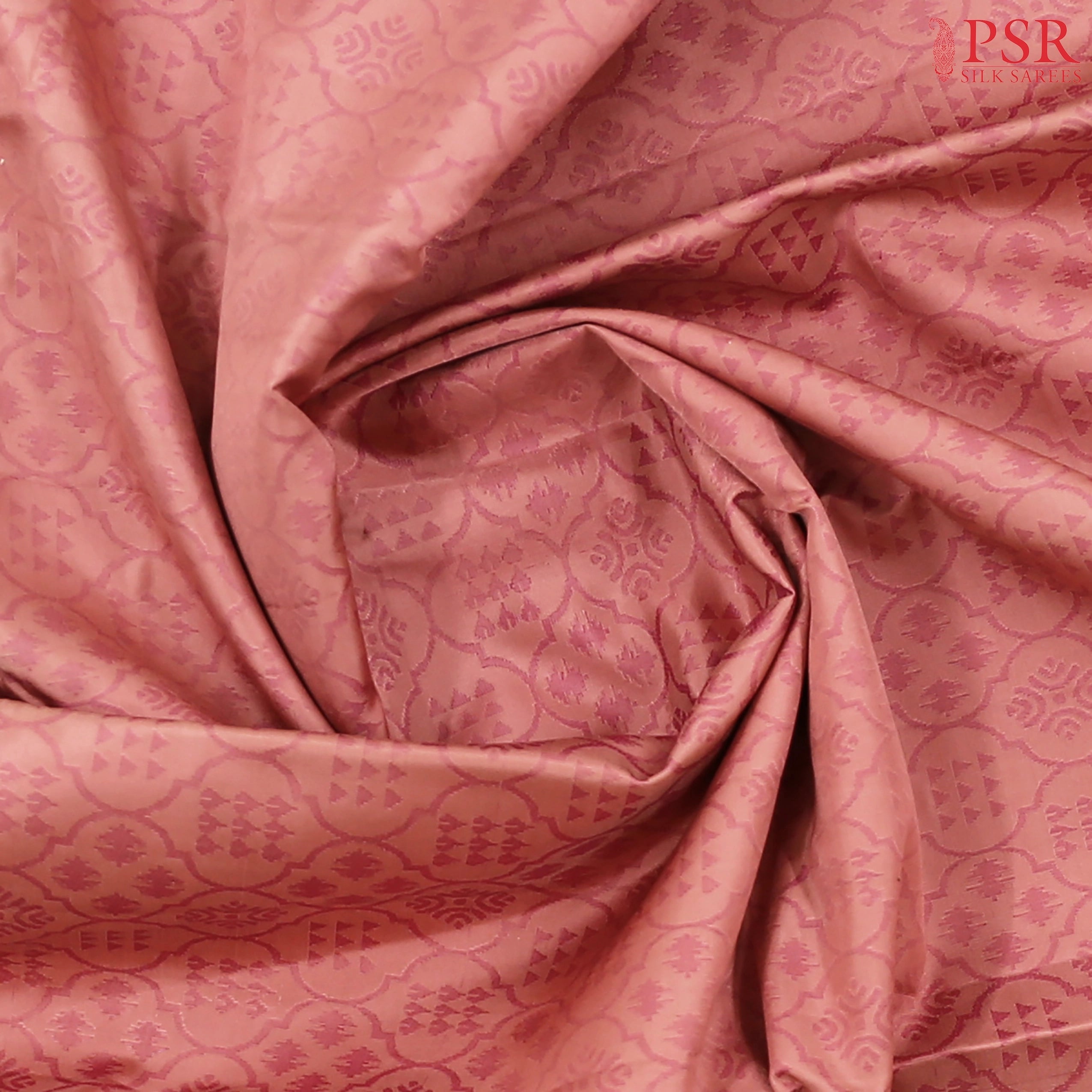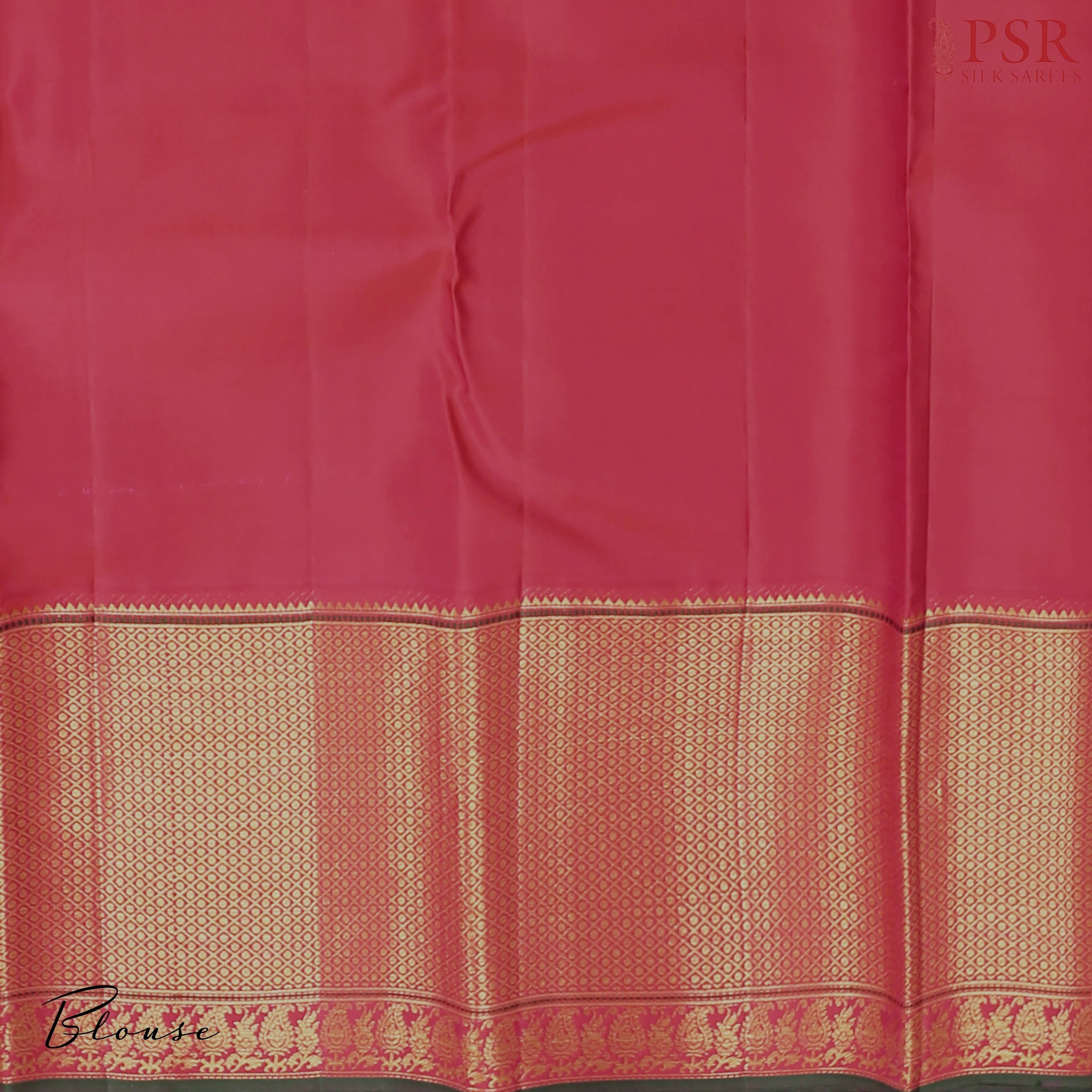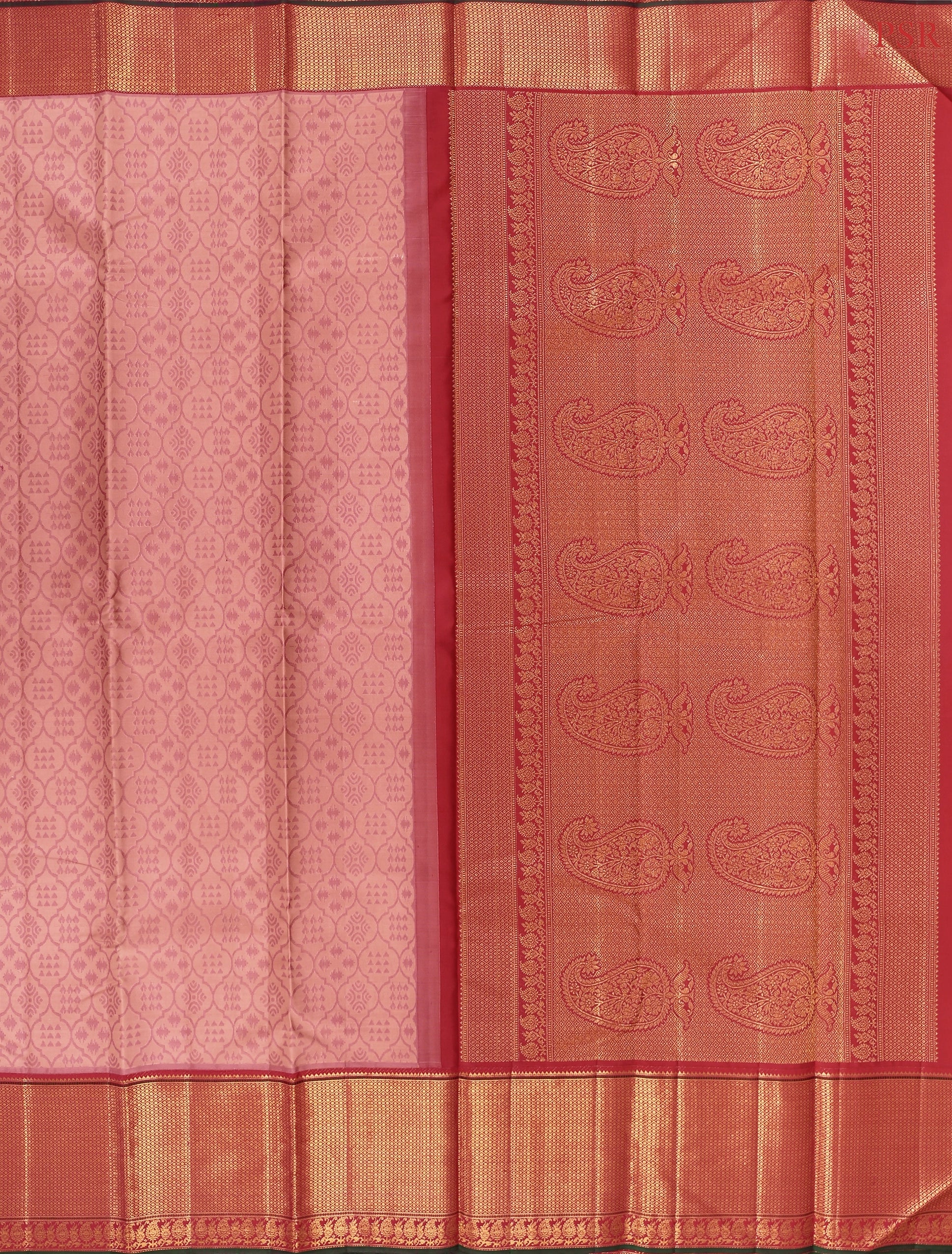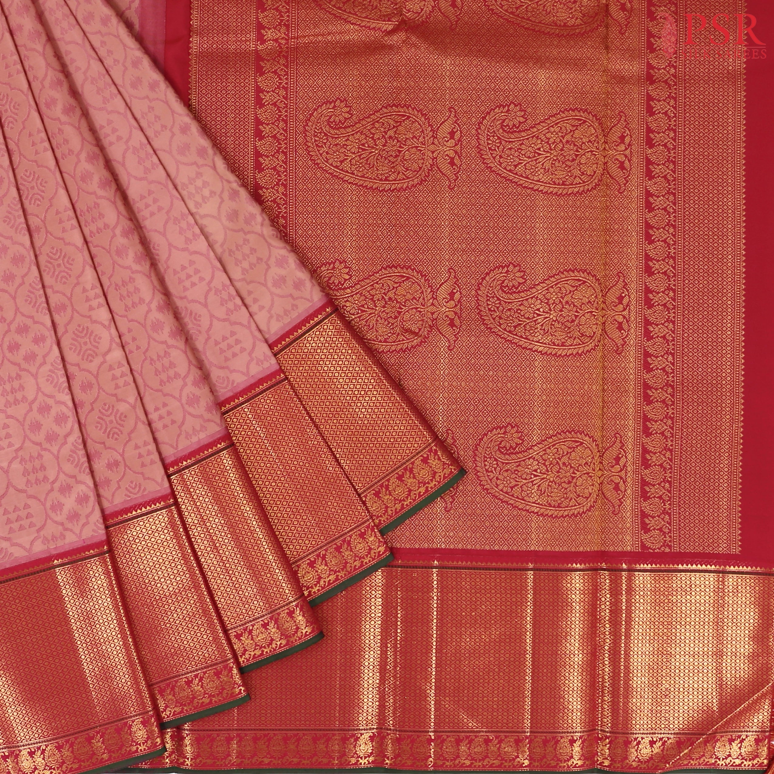 PSR Silk Sarees presents an exquisite Candlelight Peach Kanchipuram Silk Saree, categorized under the "Shrestha Kanjivaram" collection, paired gracefully with a rich Red contrast.