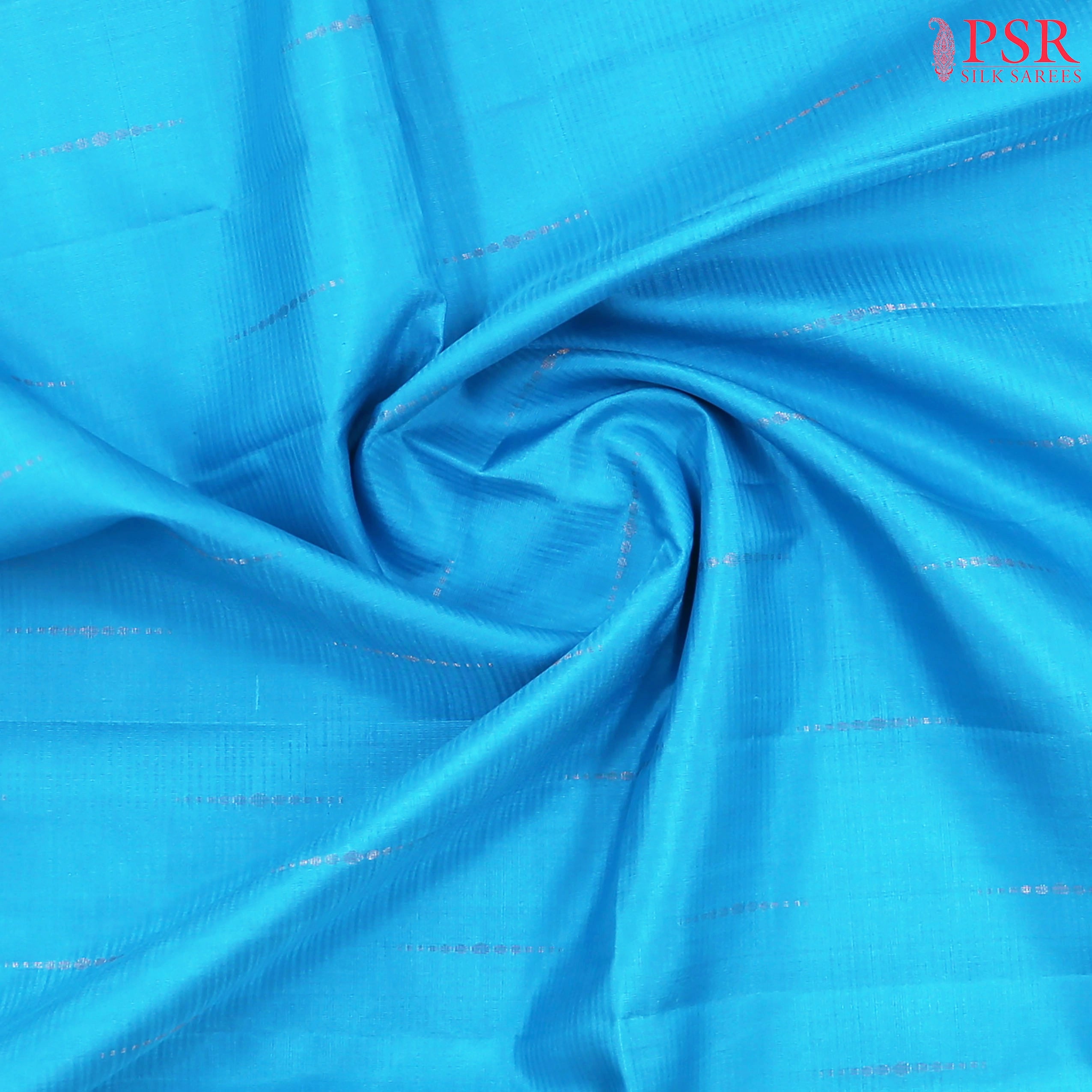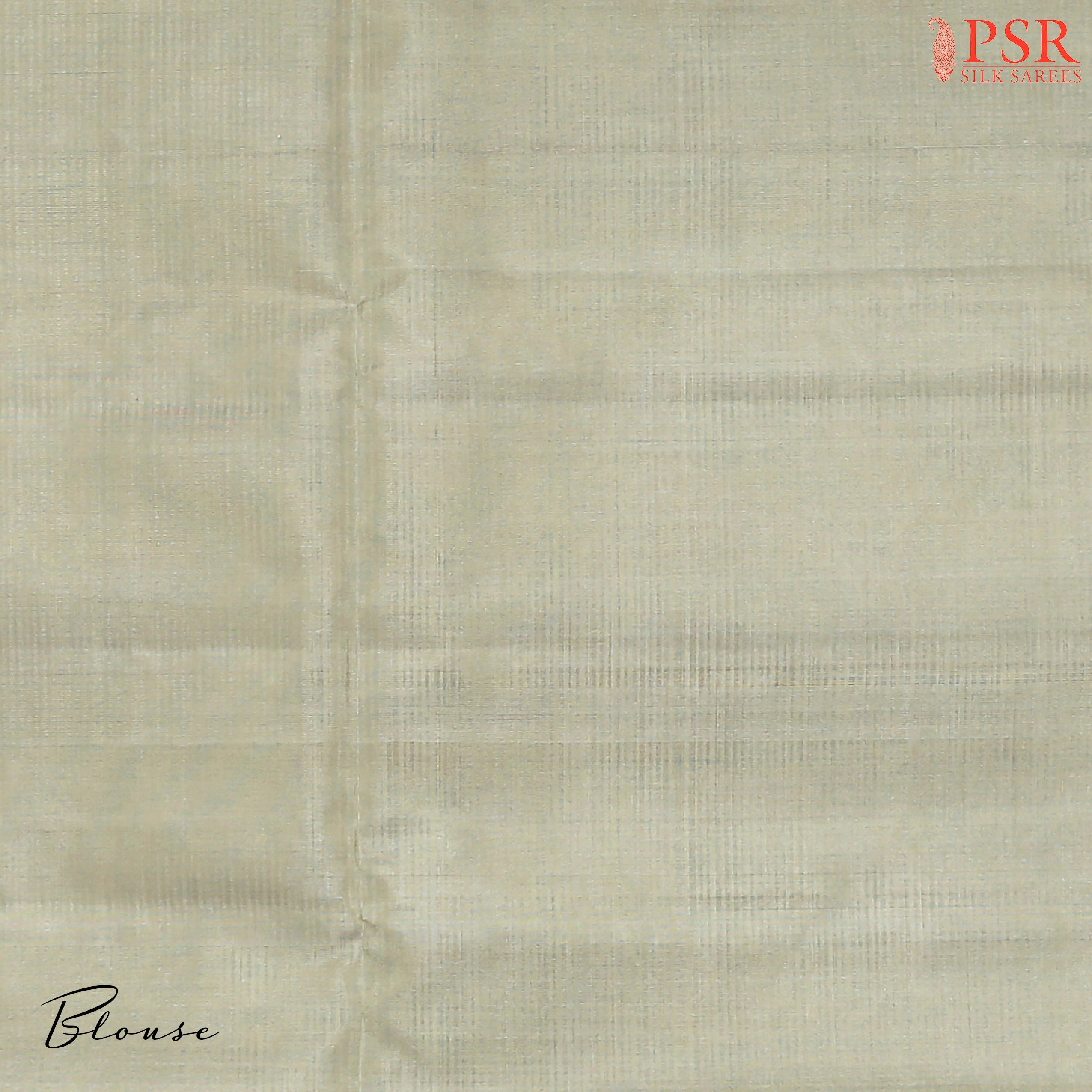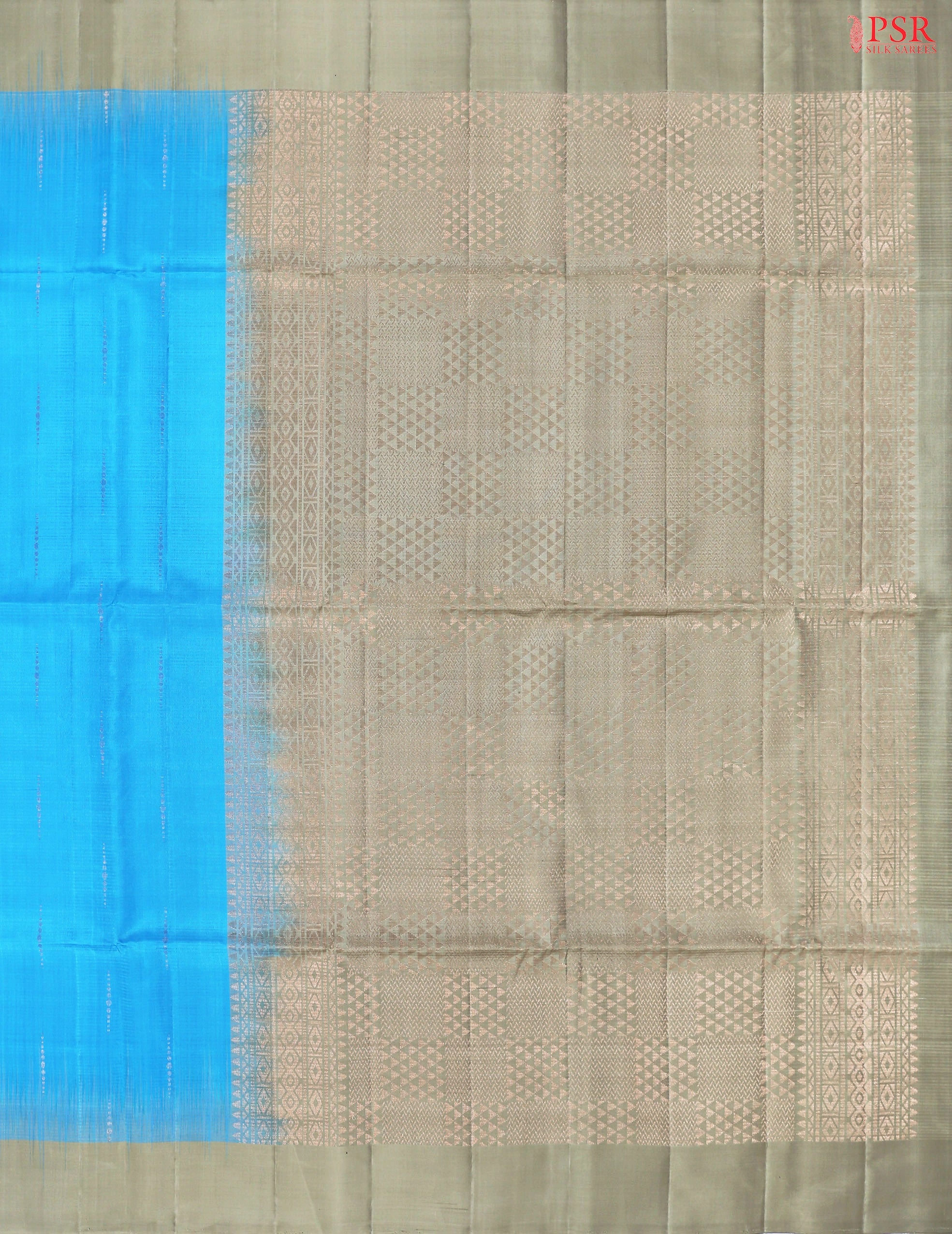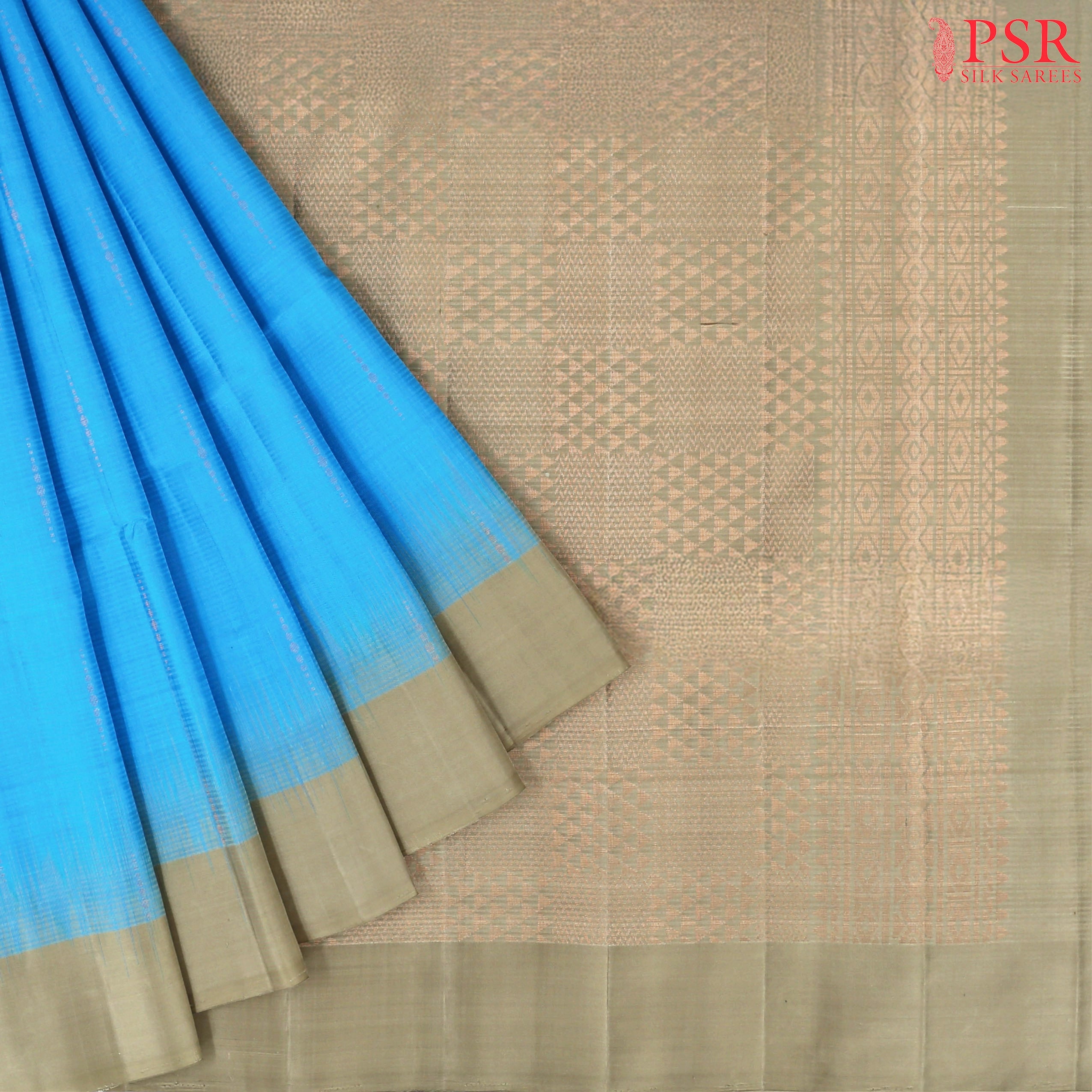 PSR Silk Sarees presents an elegant Capri Blue Soft Silk Saree paired with a contrasting rich Olive Grey combination. The saree features delicate self-stripe weaves adorned with charming Malli Moggu (jasmine bud) zari motifs, adding a graceful touch. It is complemented by a Olive Grey traditional zari work pallu, along with a plain Olive Grey blouse and matching border for a timeless look.