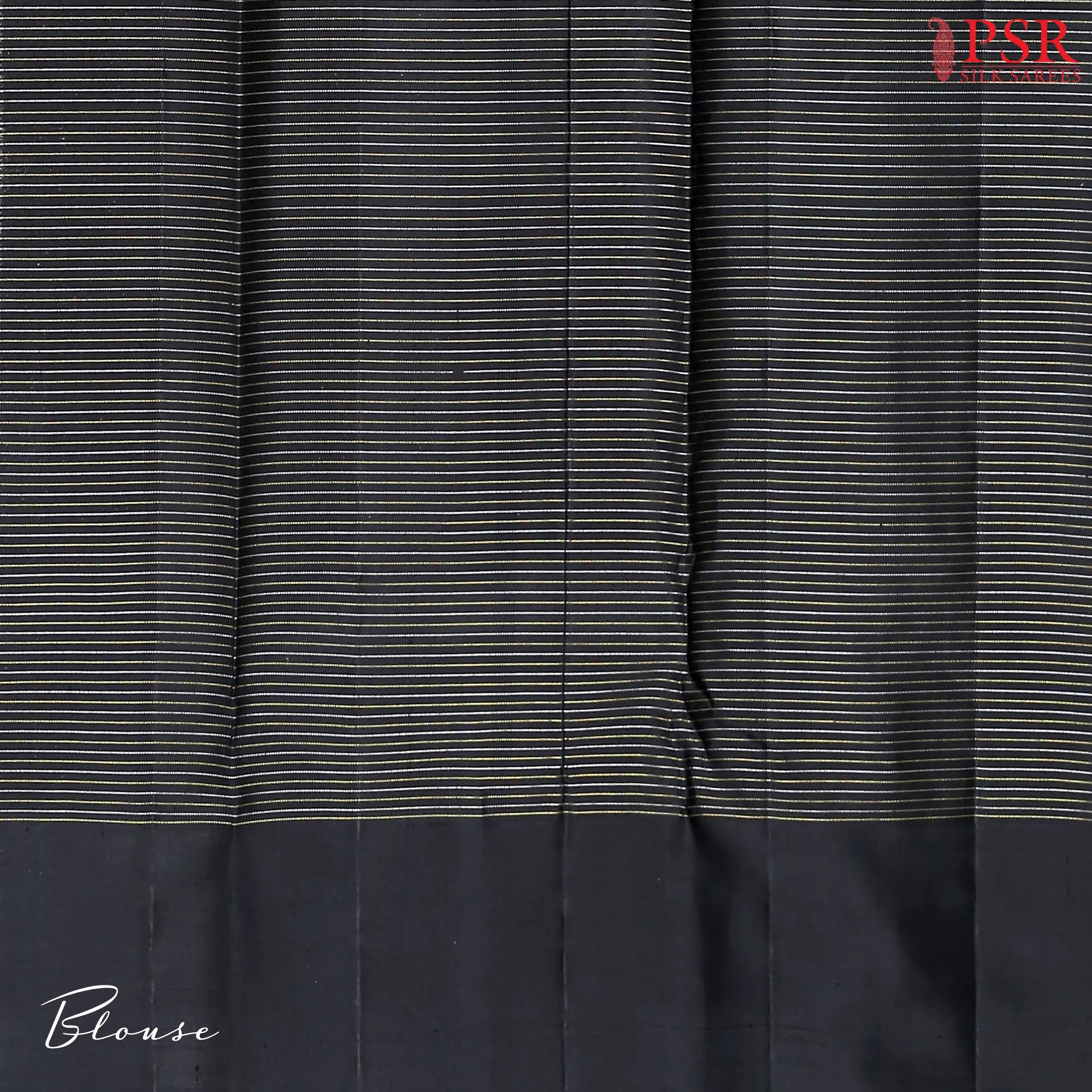 Complementing the saree is a Black blouse adorned with elegant zari stripe patterns, perfectly completing this regal look.