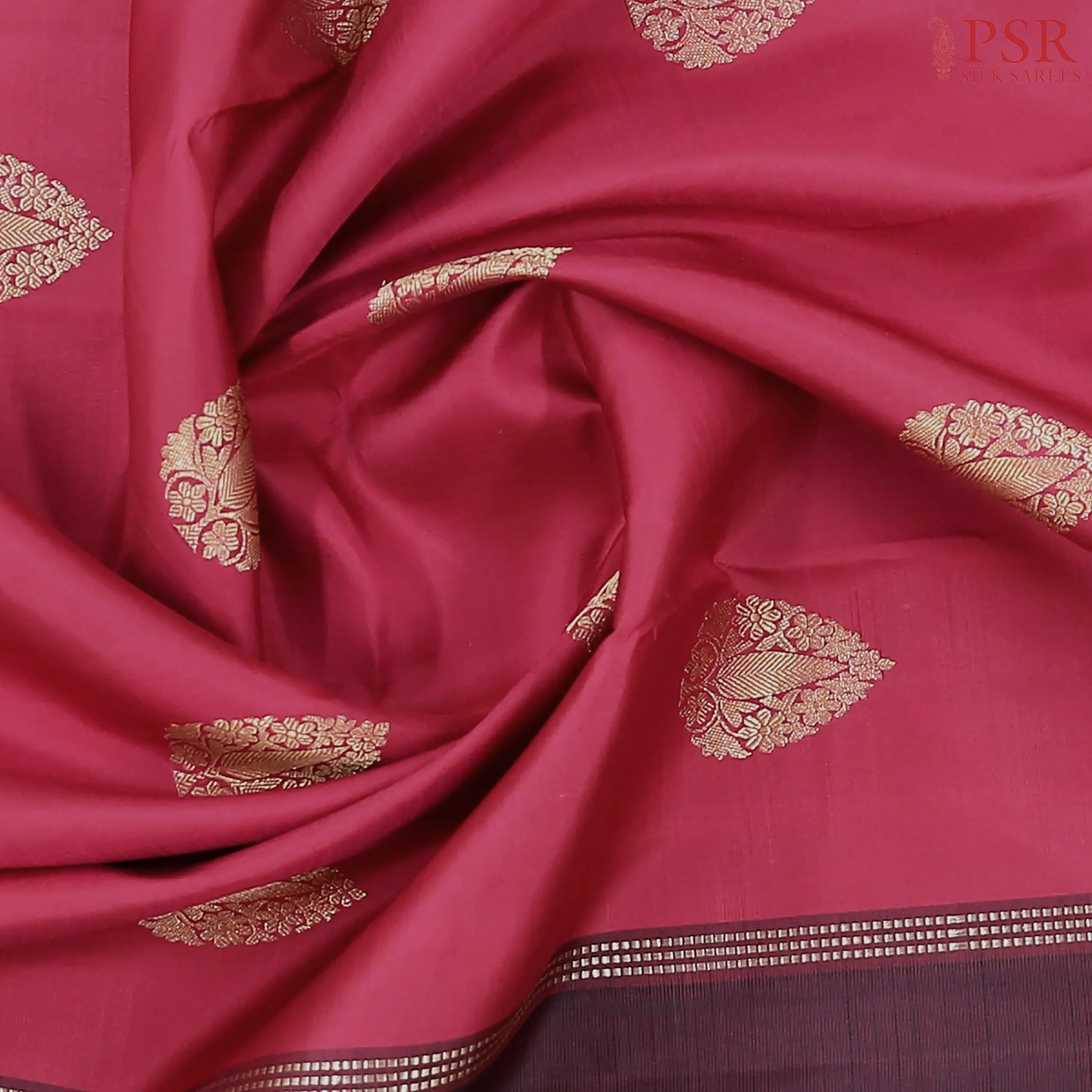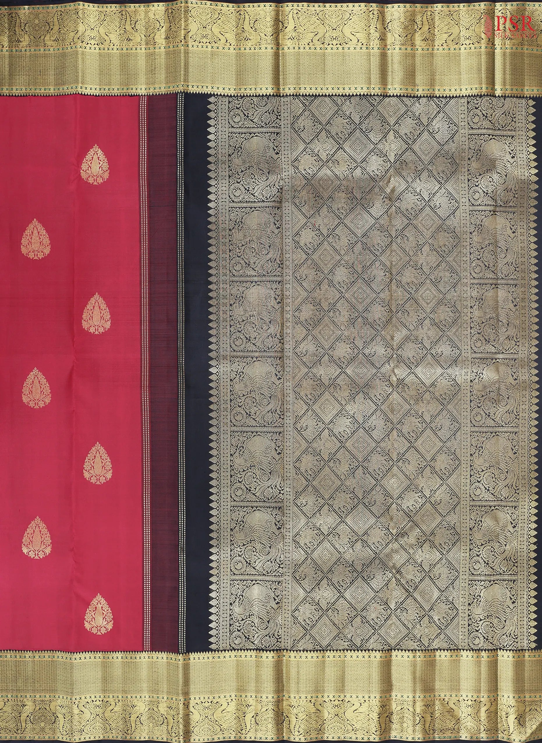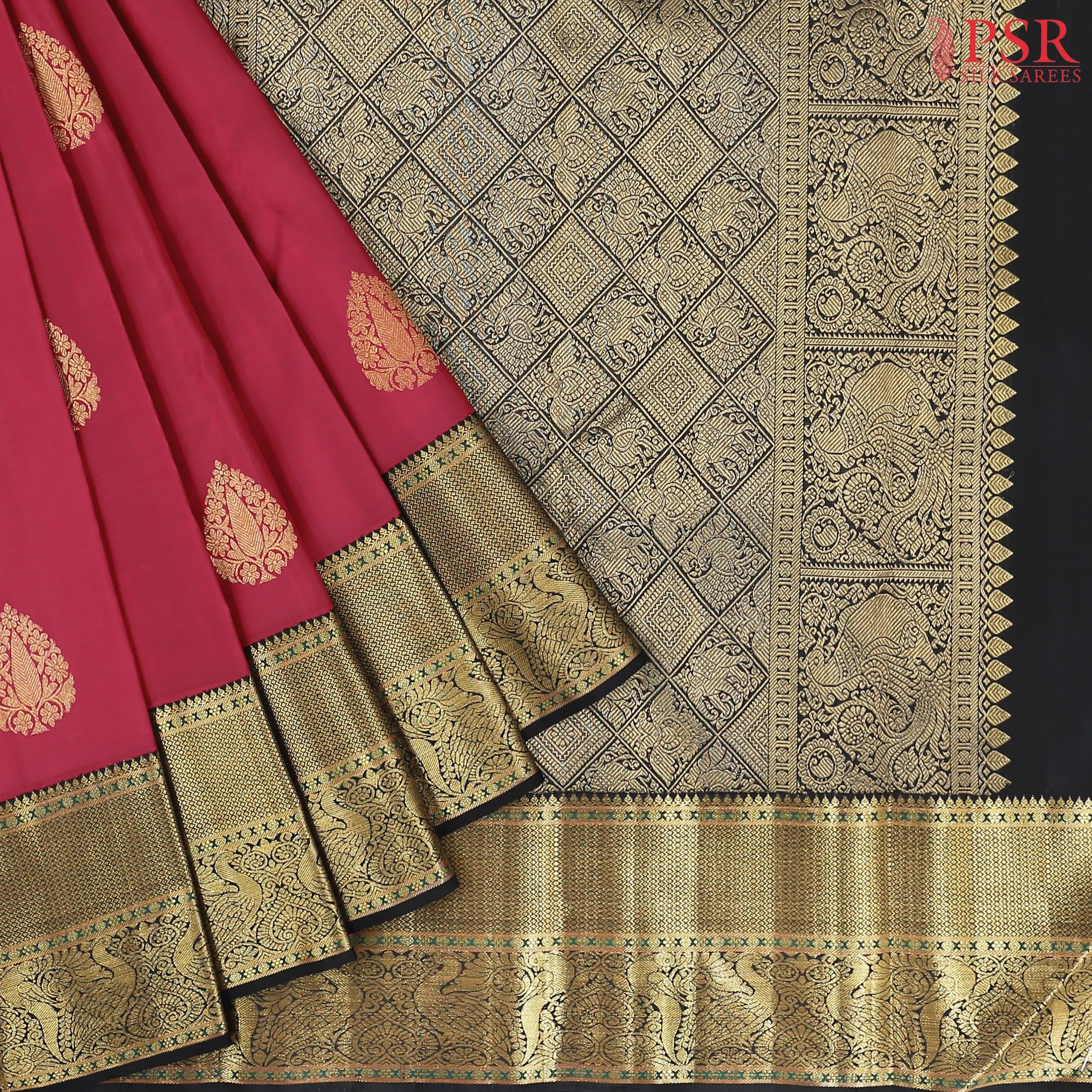 This Carmine Red & Black Kanchipuram Silk Saree from PSR Silk Sarees is an elegant addition to the "Shrestha Kanjivaram" collection.