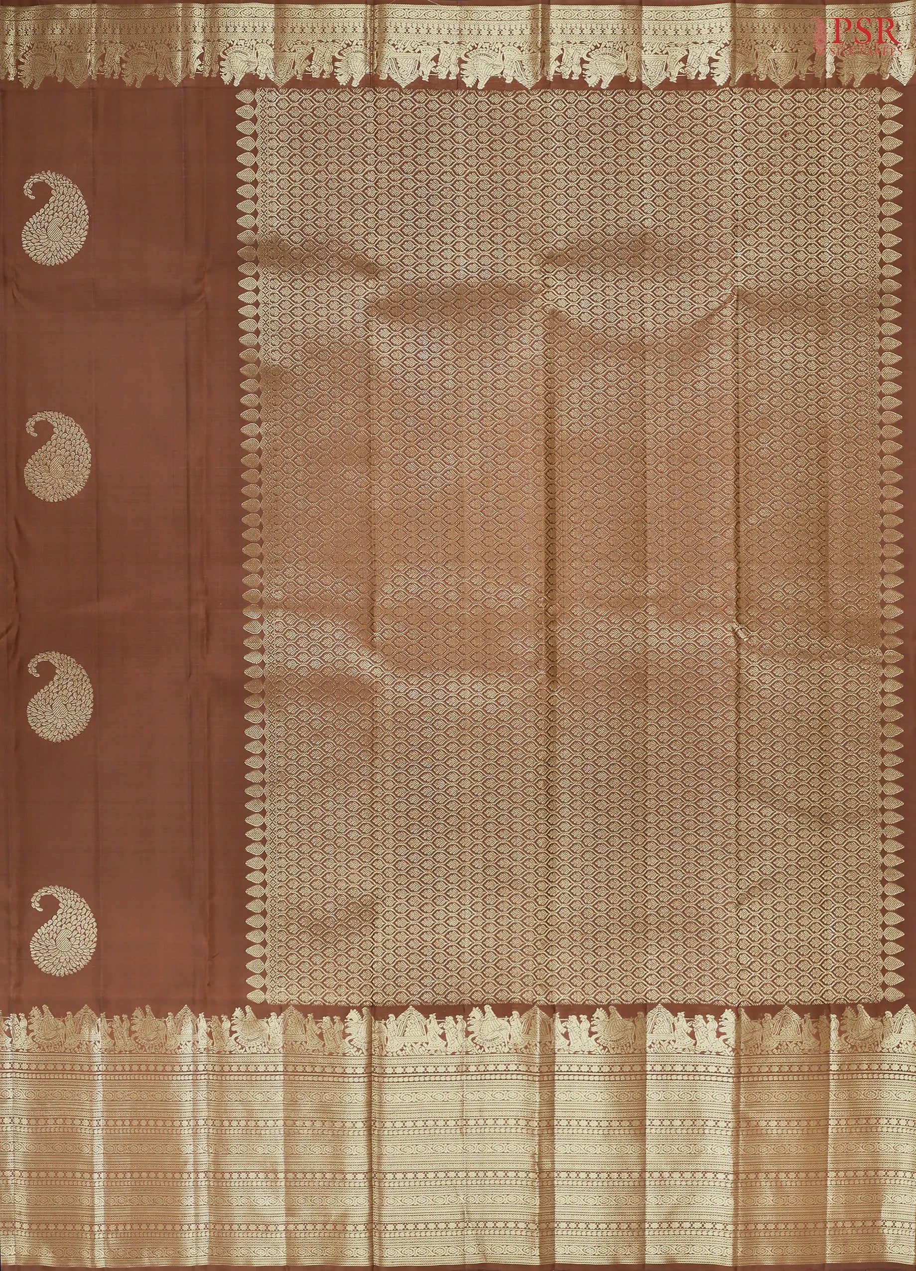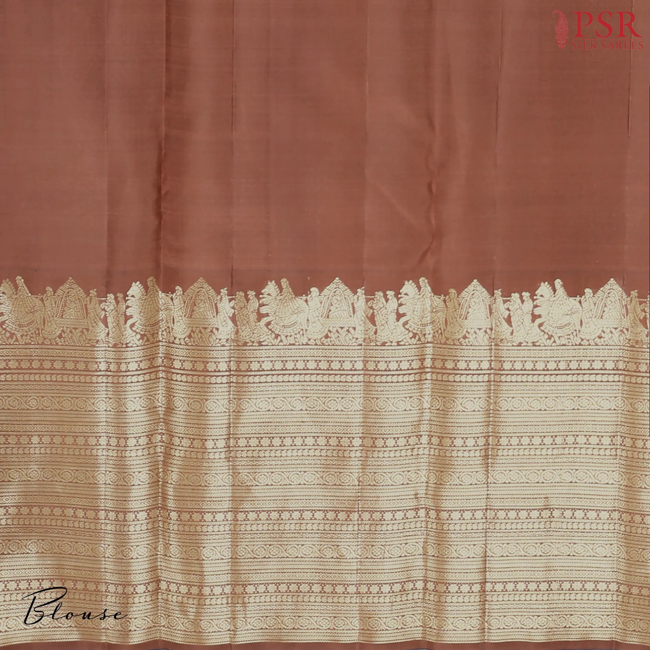 PSR Silk Sarees presents a luxurious Cinnamon Brown Pink Kanchipuram Silk Saree from our Shrestha Kanjivaram collection, radiating grace and sophistication. The saree features exquisite golden zari paisley motifs, woven with precision to reflect the timeless artistry of Kanchipuram. A traditional zari work pallu and border add regal charm, while the plain matching blouse offers the perfect balance for versatile styling. Ideal for weddings, festive occasions, and grand celebrations, this saree embodies elegance in every detail.