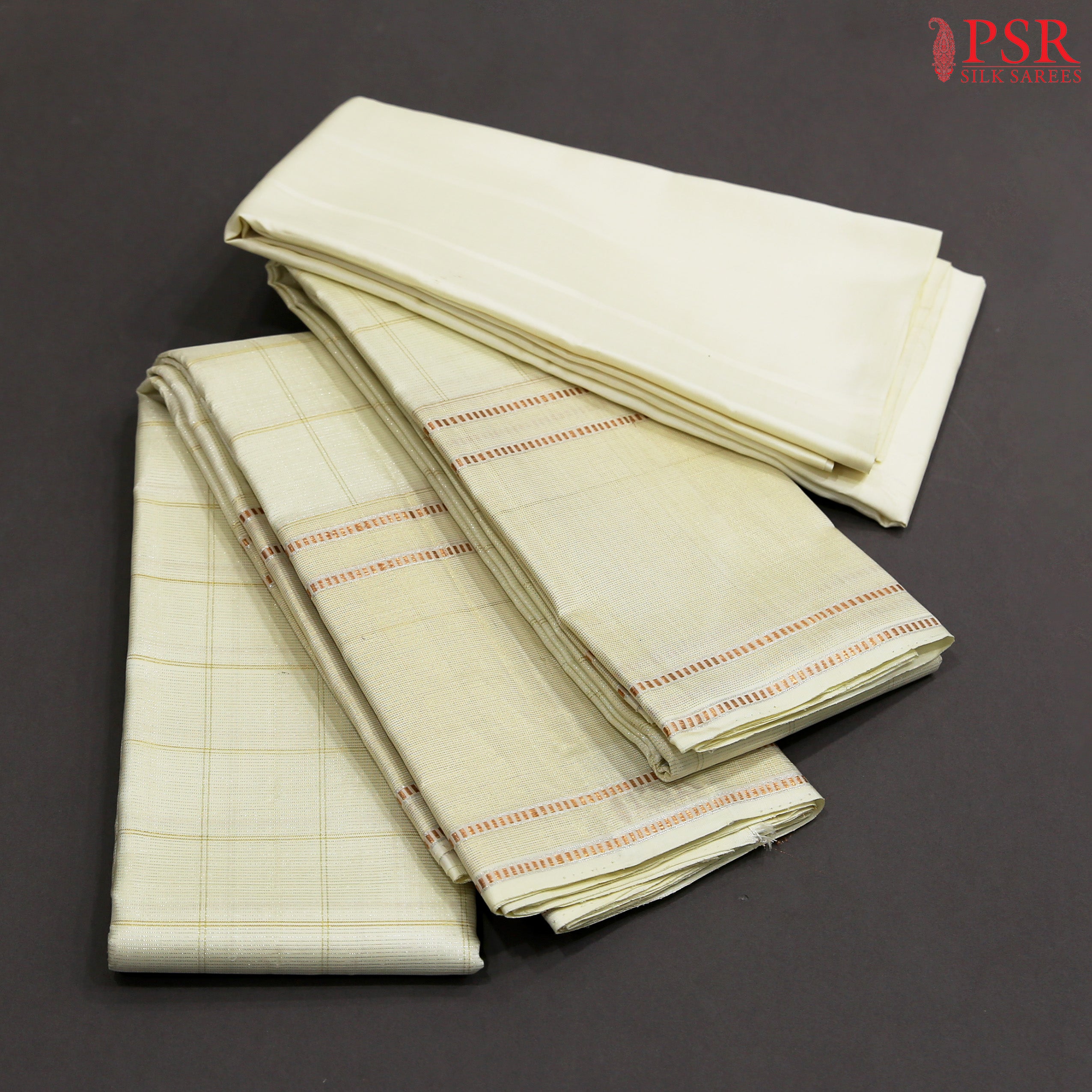 Plain Shirt With Diamond Needle Pattern & Checkered Pattern In Dhoti & Angavastram With Big Copper Zari Border |