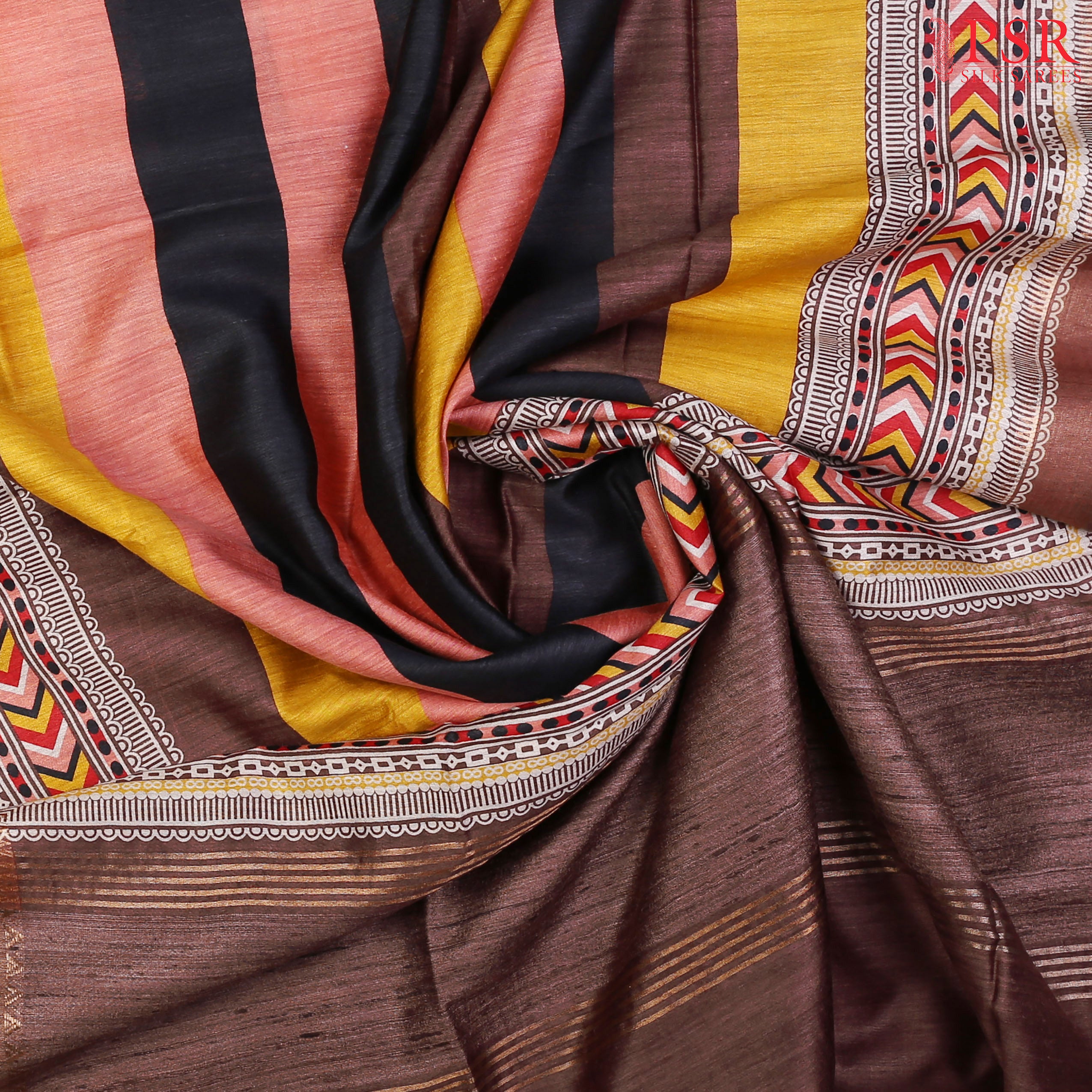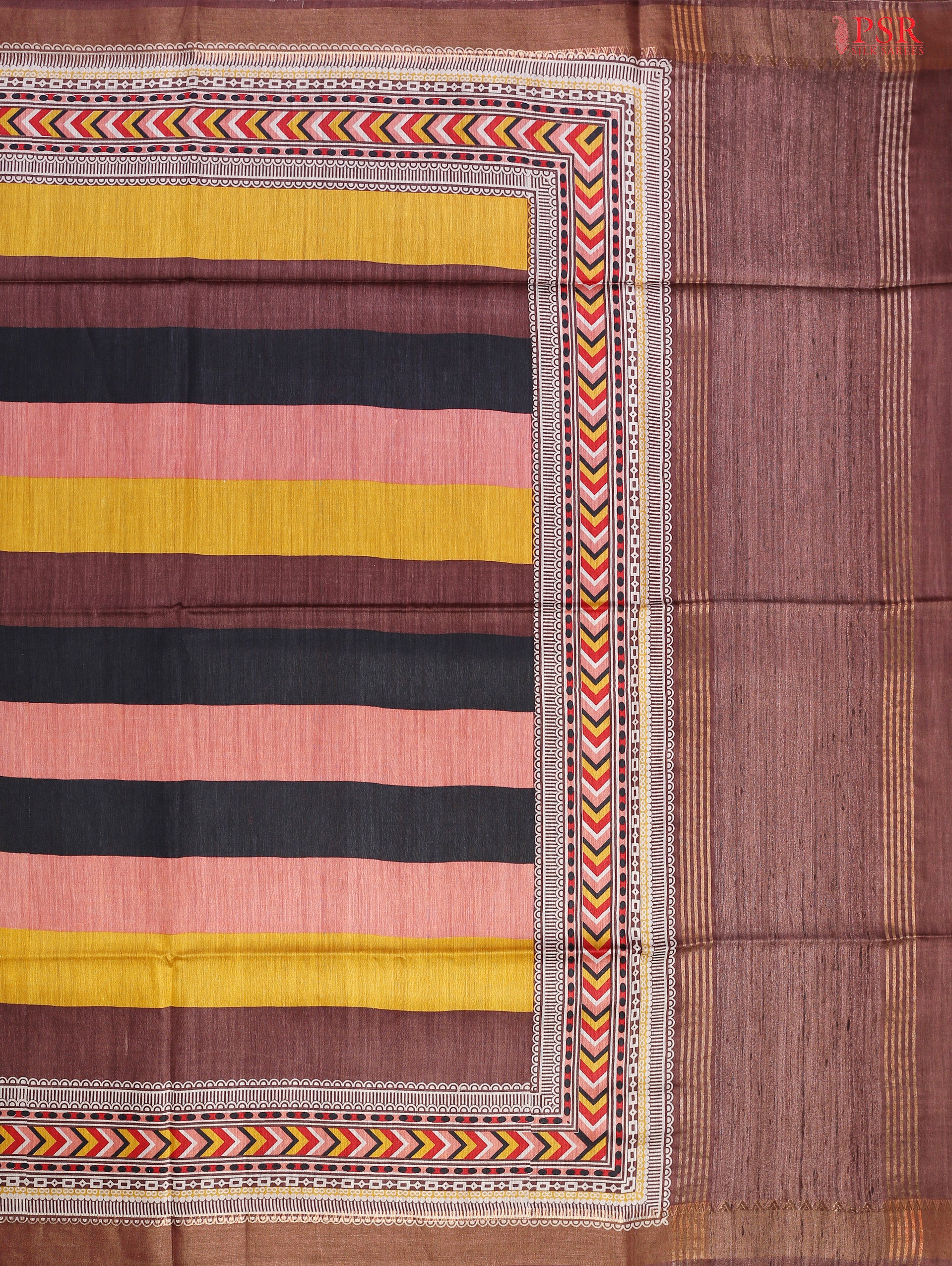 Make a striking statement with our Dark Brown Munga Silk Saree, highlighted with touches of Coral Peach, Tuscan Yellow, and Black. This elegant saree features broad multicolored stripes, adding a modern flair to its traditional essence. The dark brown pallu with tissue stripes and the plain dark brown blouse create a seamless and classy ensemble. The highlight of the saree is its big border adorned with vintage tribal prints and tissue stripes, exuding timeless charm and sophistication.