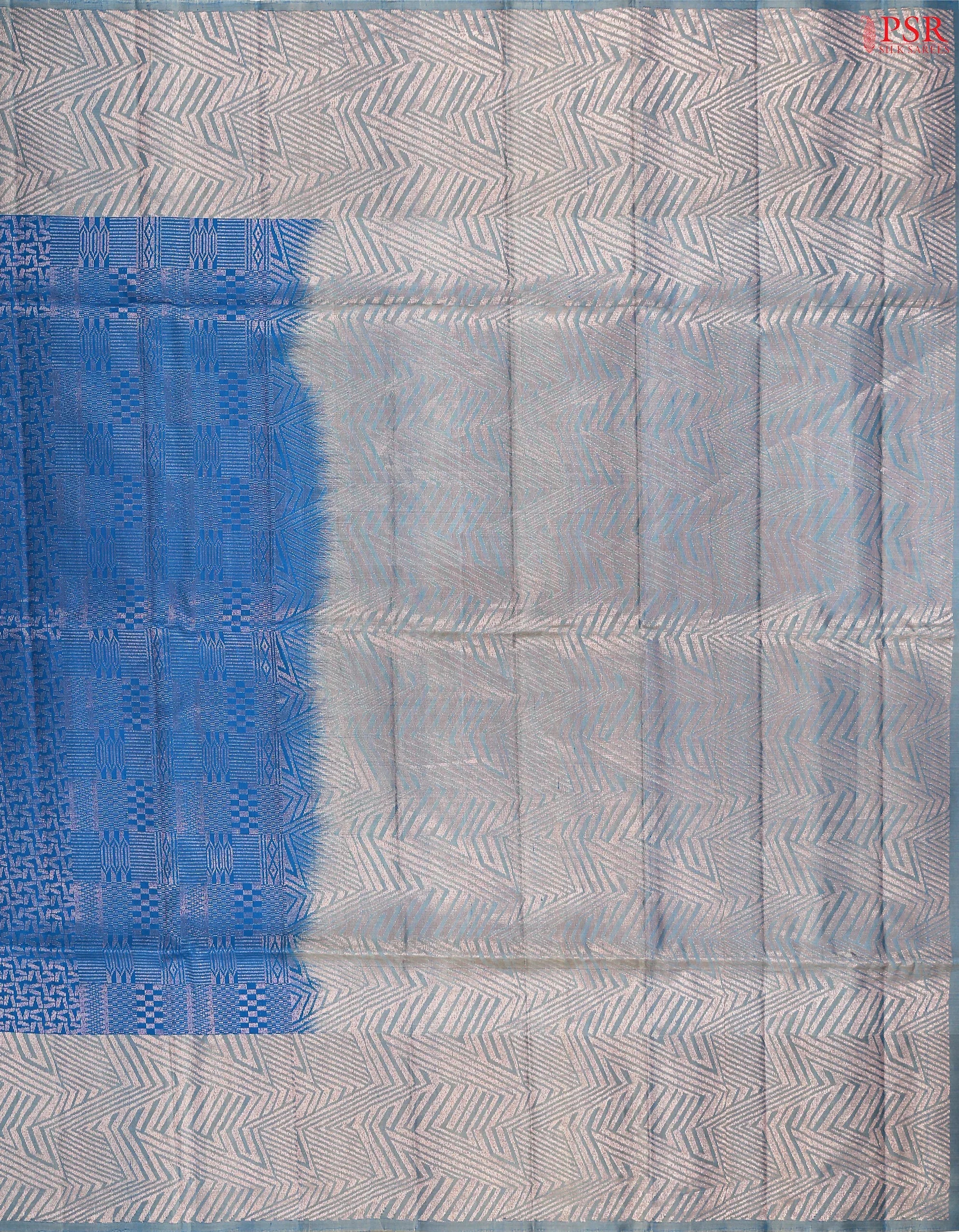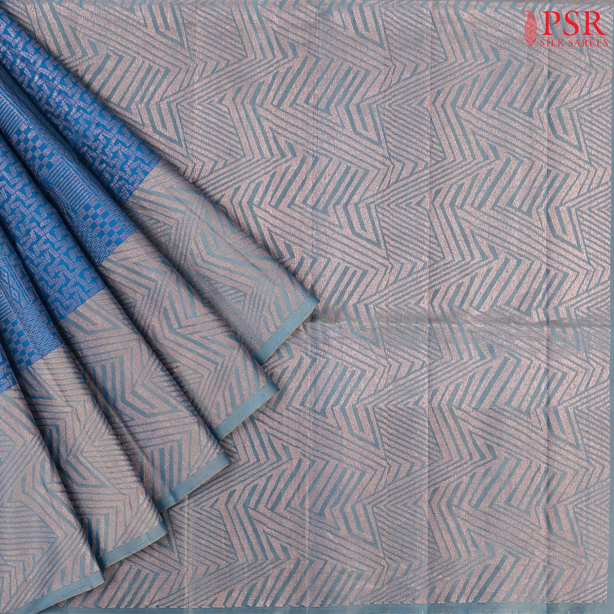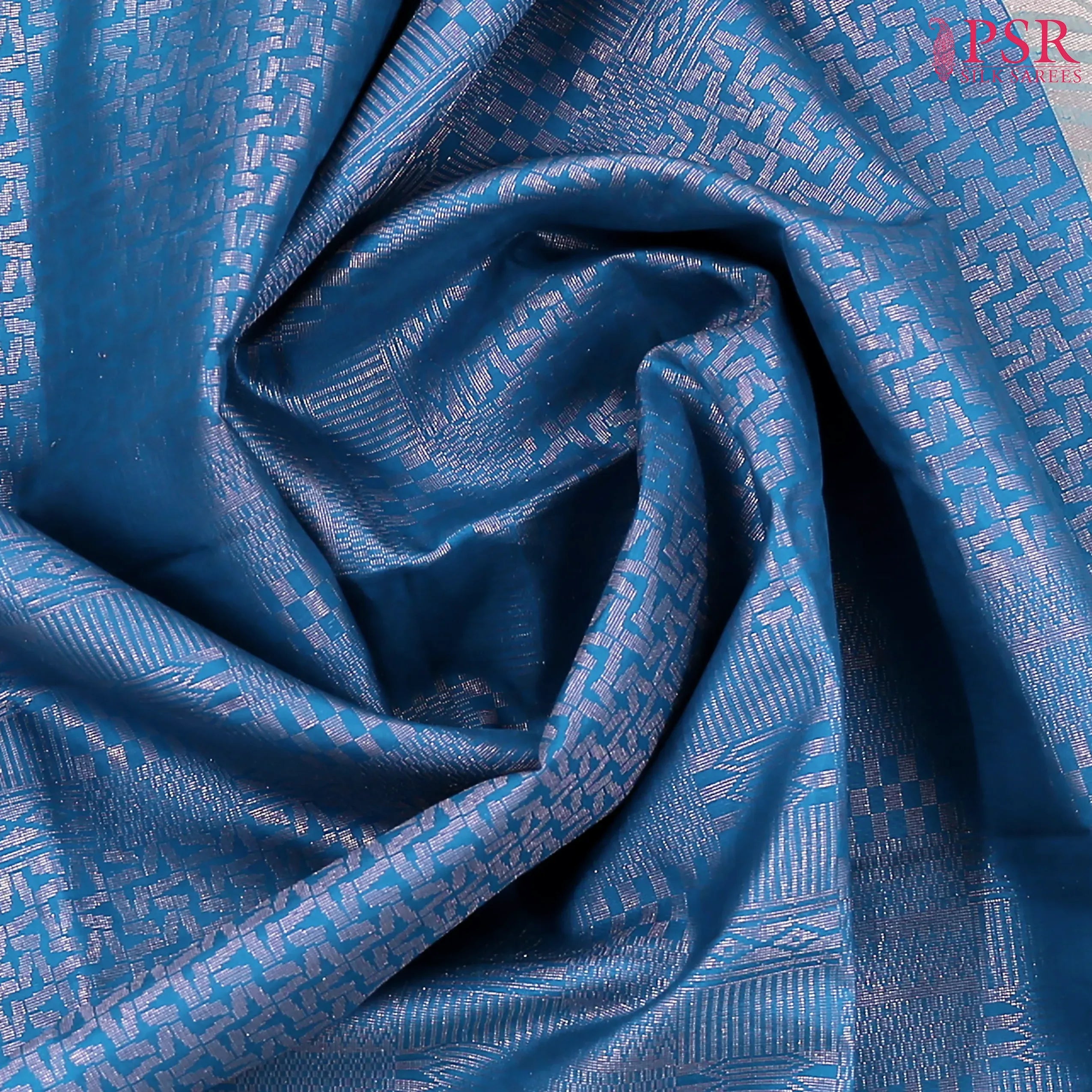 PSR Silk Sarees presents a graceful Dark Cerulean Blue Soft Silk Saree paired with a sophisticated Silver Grey combination, radiating warmth and traditional beauty.