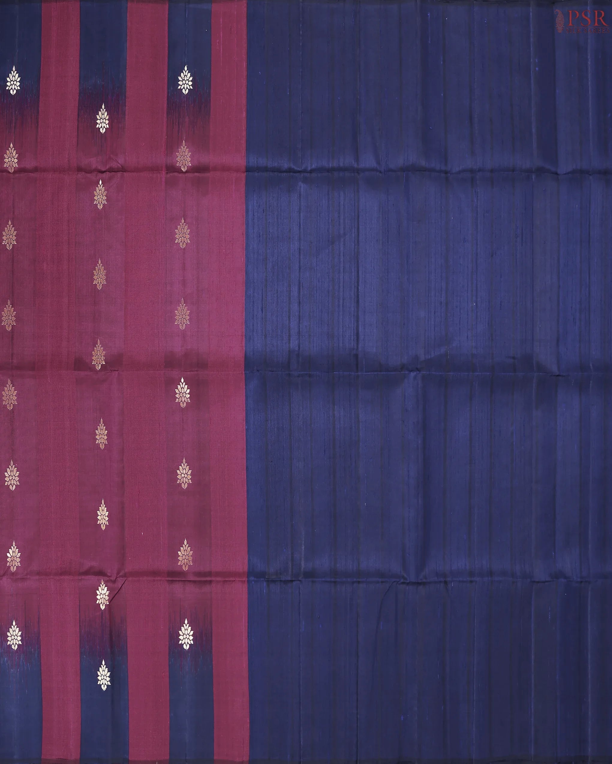 PSR Silk Sarees presents a graceful Dark Magenta Soft Silk Saree with a refreshing Navy Blue combination, crafted to highlight subtle texture and contemporary elegance.