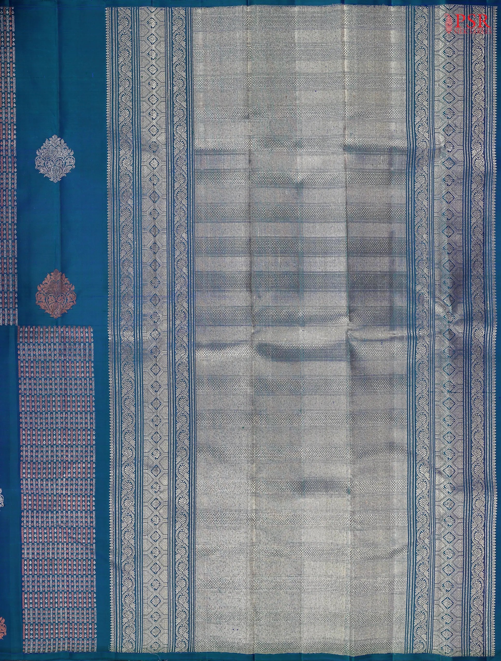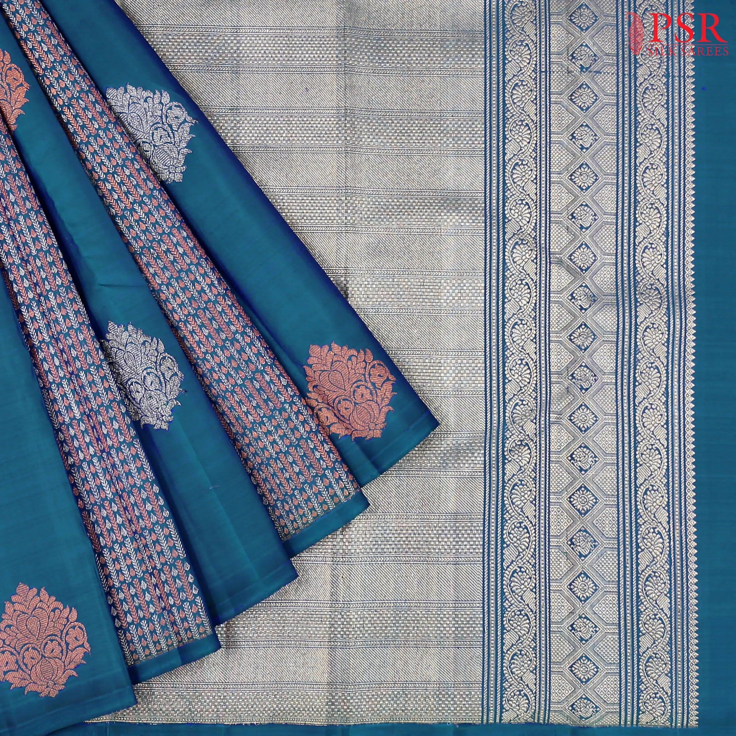 PSR Silk Sarees presents a charming Dark Peacock Blue Kanchipuram Silk Saree.