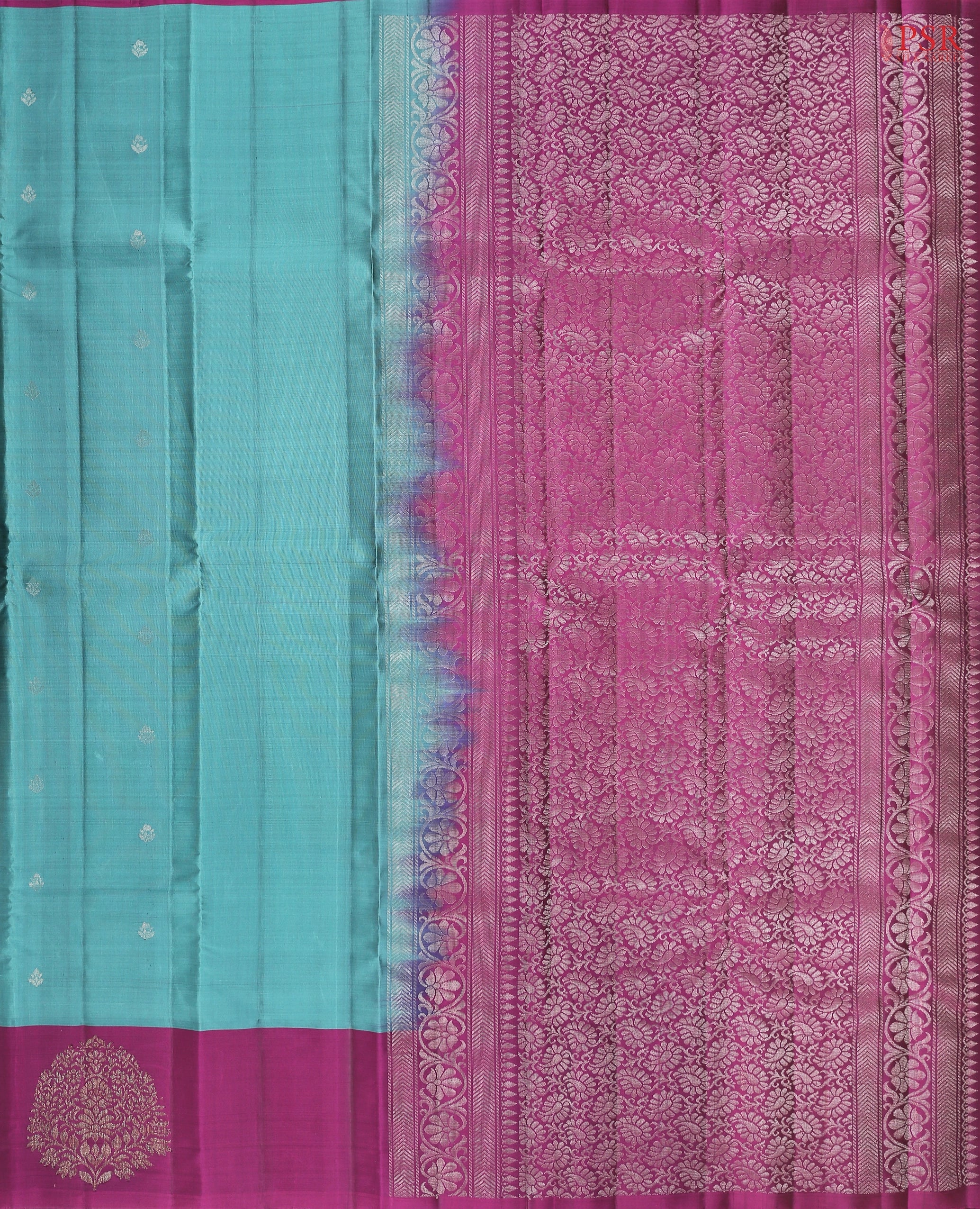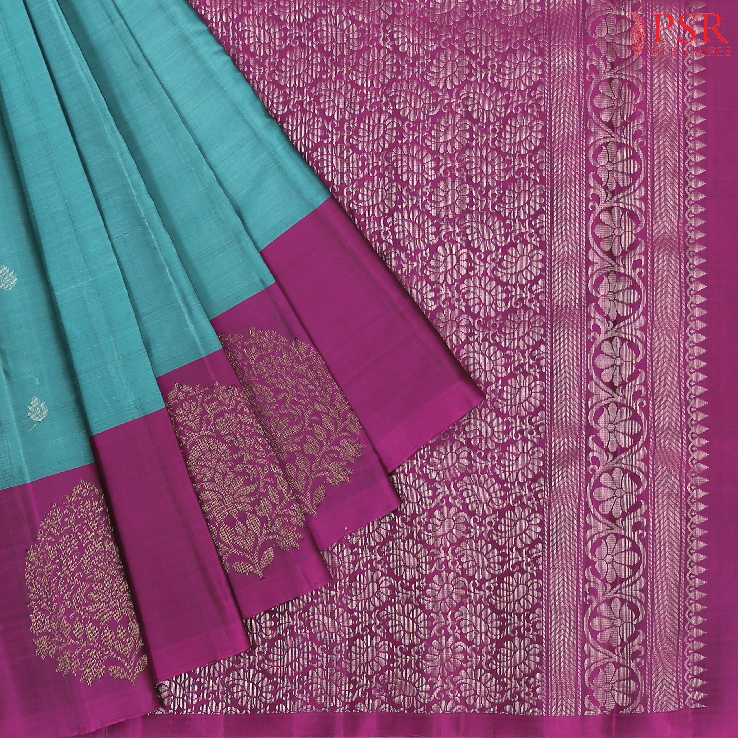 Elevate your elegance with PSR Silk Sarees exquisite Dark Turquoise Soft Silk Mix Saree, beautifully complemented by a Dark Purple hue.