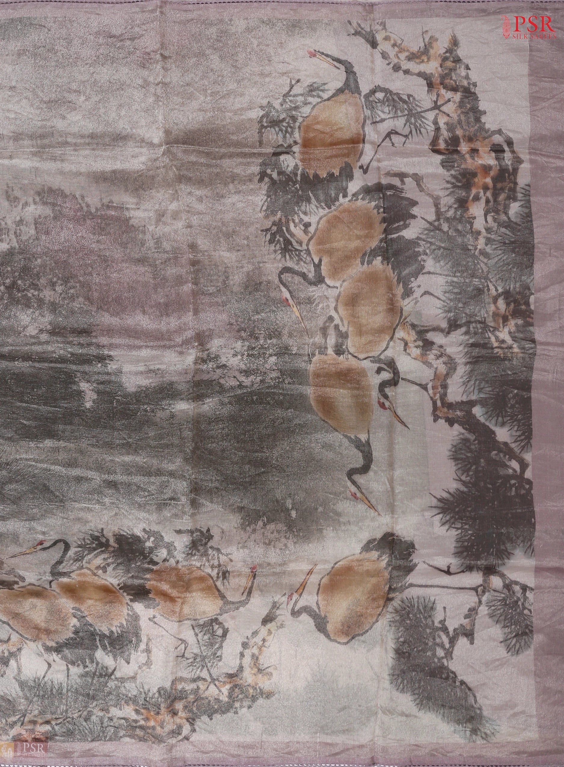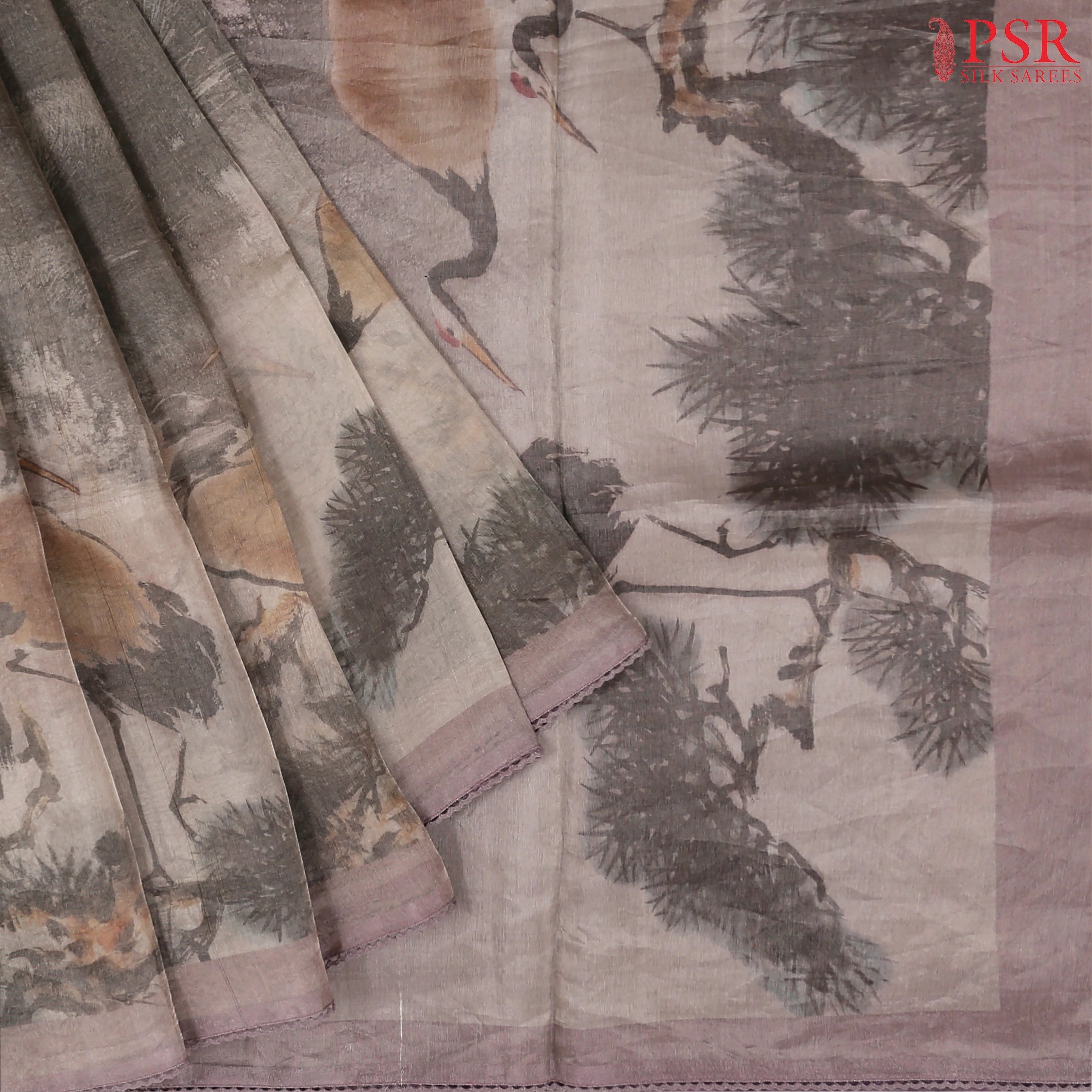 This delicate tissue saree stands out with elegant designer crane bird prints that lend a serene and artistic appeal. The subtle shimmer of the fabric is beautifully complemented by a finely embroidered lace border, adding a feminine charm to the ensemble. Paired with a plain and matching dupion silk blouse, this saree is perfect for those who appreciate understated beauty with a creative twist.