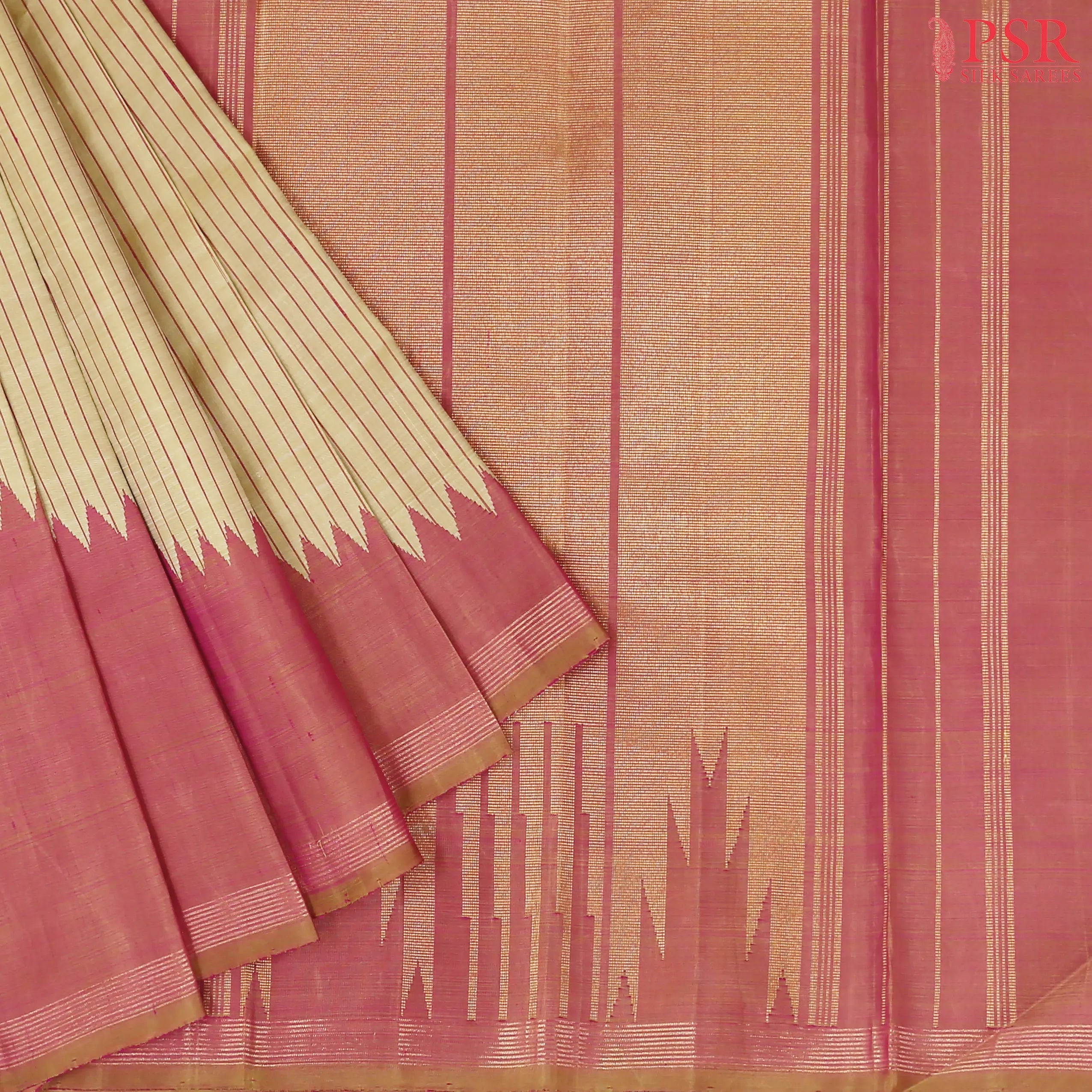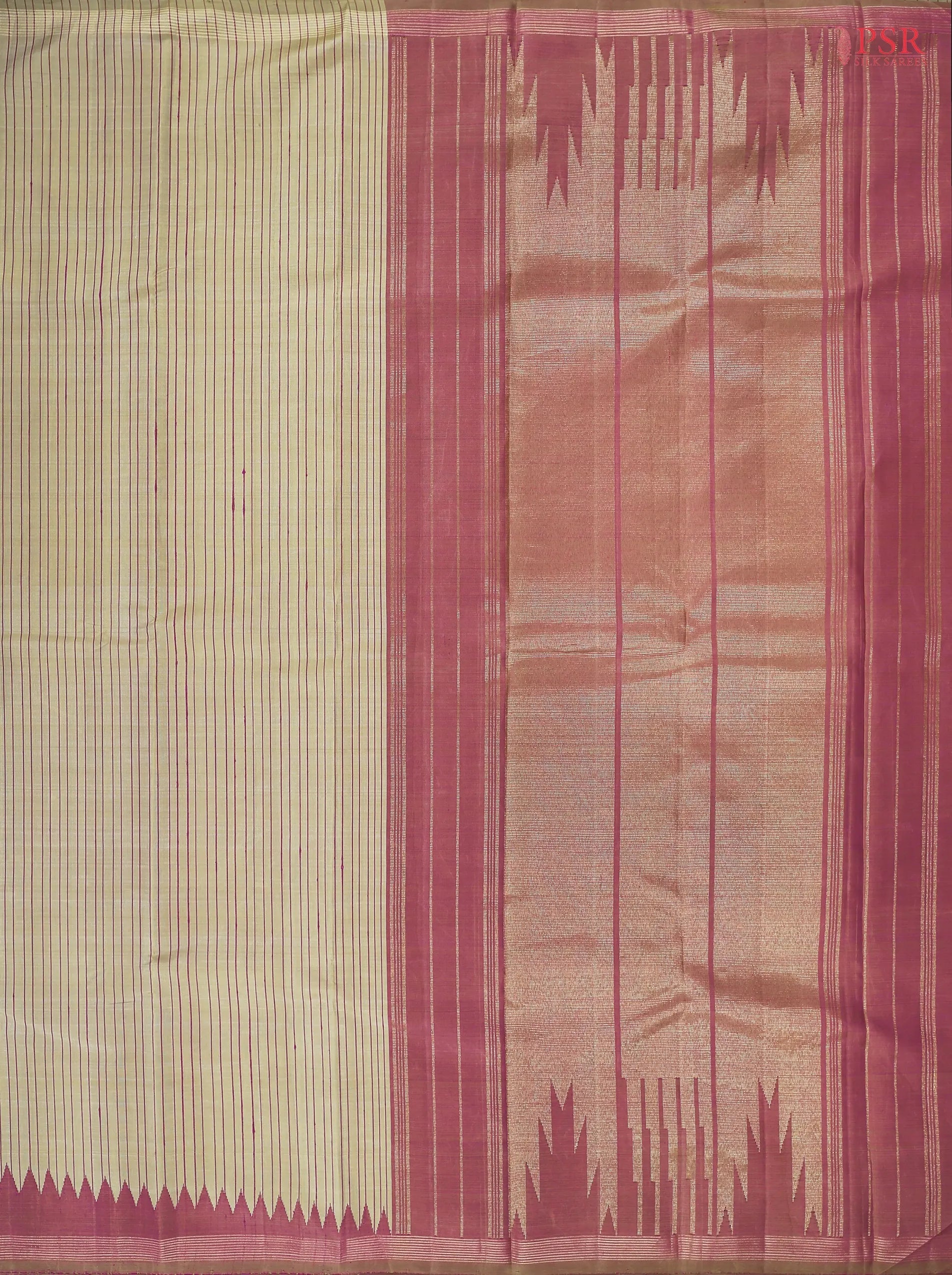The saree is adorned with elegant stripe weaves that exude subtle sophistication. The rich traditional zari pallu enhances its grandeur, while the one-sided elevating Rouge Pink temple border featuring intricate zari stripes adds a graceful touch of heritage detailing.