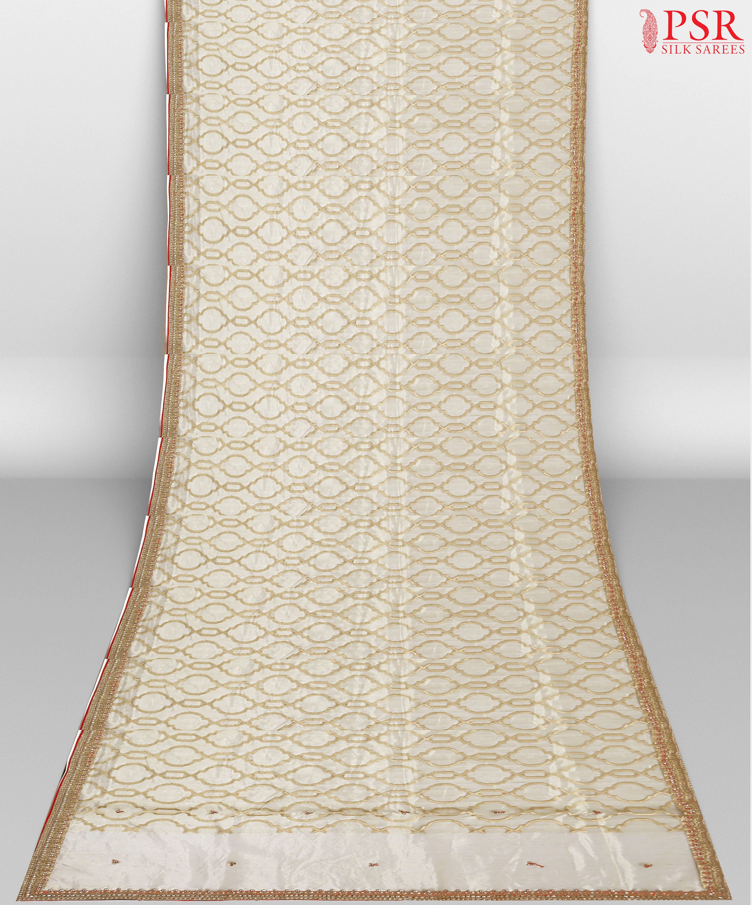 PSR Silks unveils a radiant Golden-hued pure Tissue silk saree, adorned with a captivating Moroccan pattern intricately embellished with Aari embroidery. Complemented by a striking Red designer blouse, featuring exquisite embroidery work, this ensemble exudes sophistication and charm. The saree showcases a subtle striped pallu, enhanced with Aari embroidery and adorned with designer tassels, adding a touch of elegance. Completing the ensemble, the small patched Aari Border enhances the grandeur of the saree, creating an enchanting and admired look.