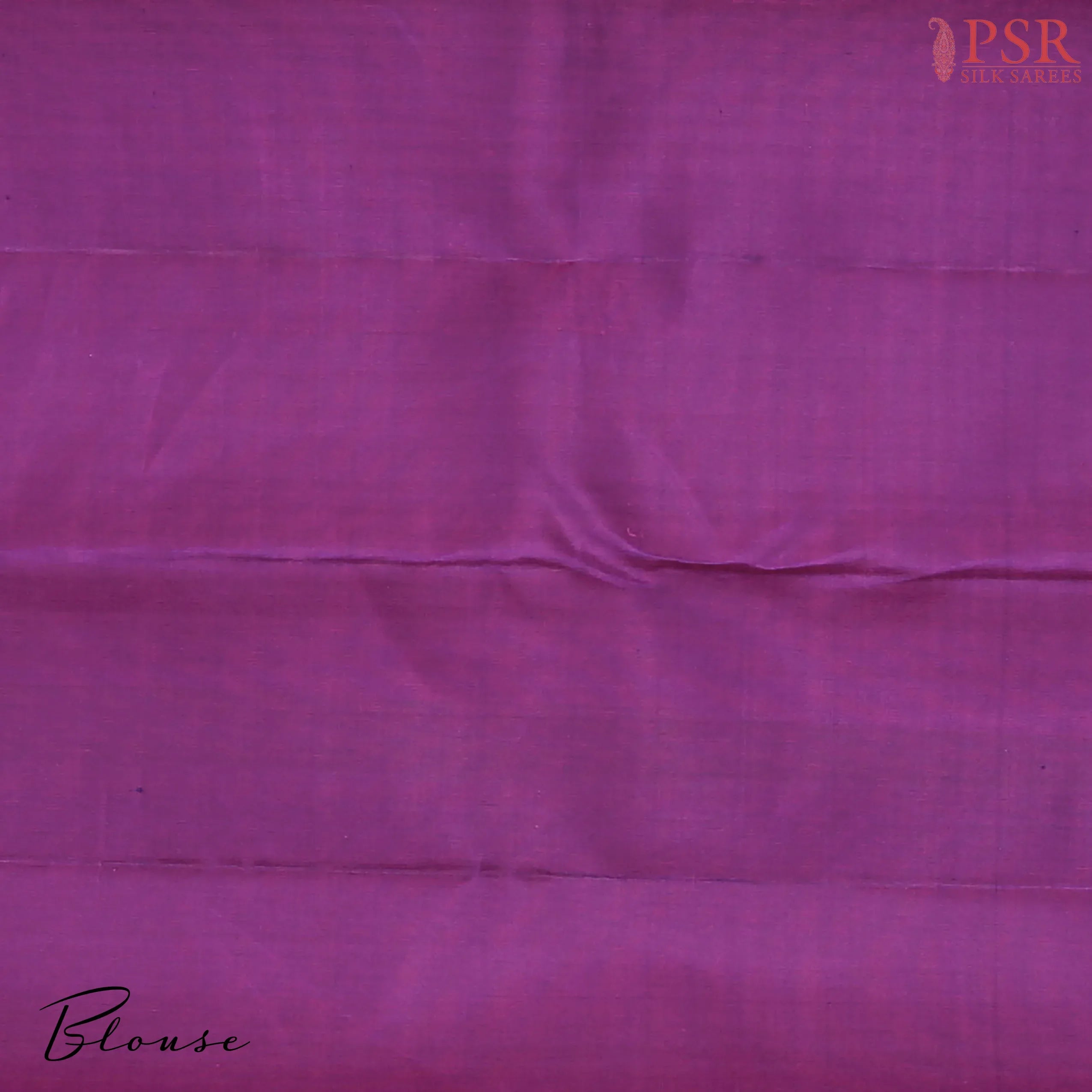 This majestic saree features bold golden zari stripes with floral mayura zari motifs. The borderless saree is paired with Purple a classic zari pallu, adding a subtle contrast and charm.