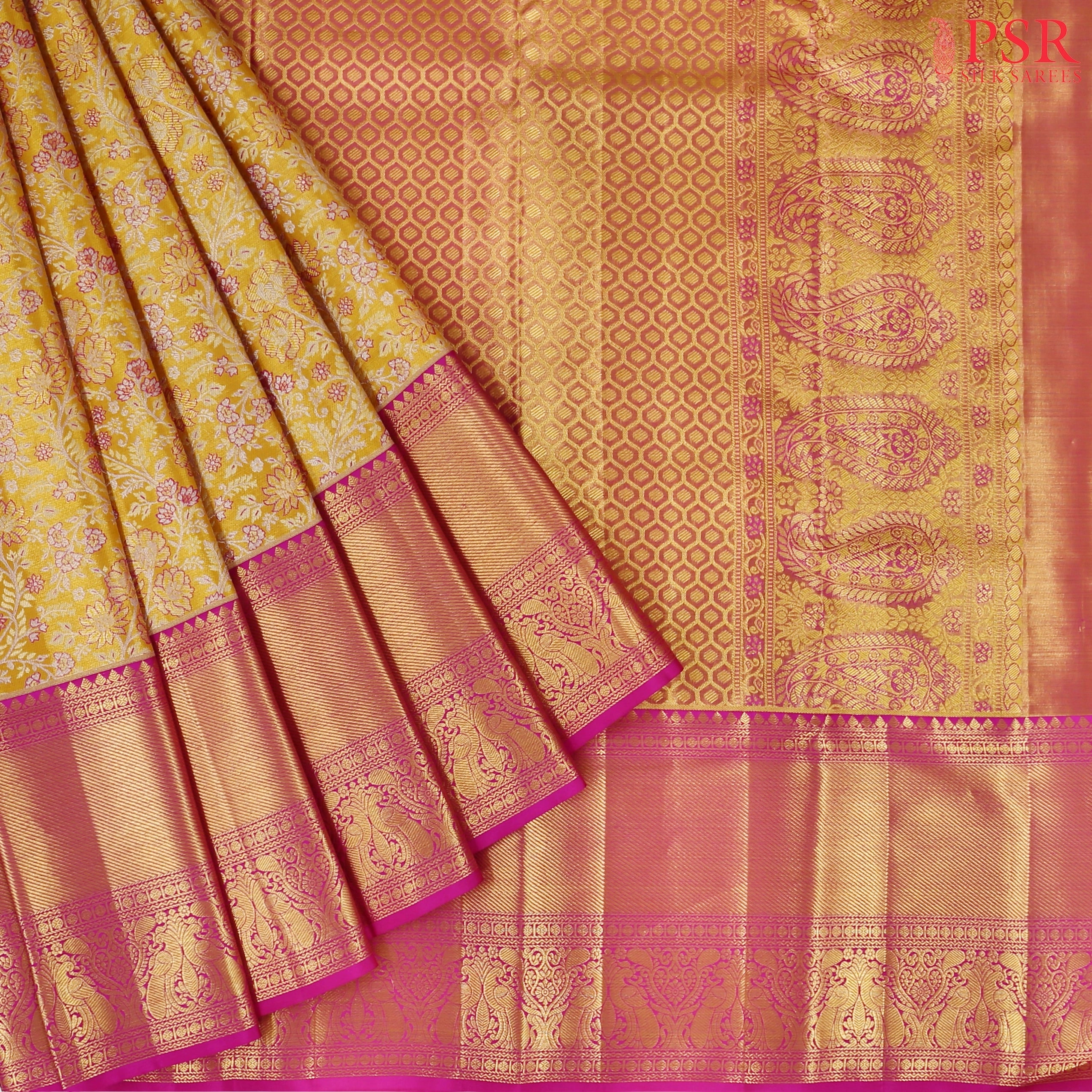 Golden Yellow & Magenta Pink Kanchipuram Tissue Silk Saree – Vaichitrya Kanjivaram Collection by PSR Silk Sarees