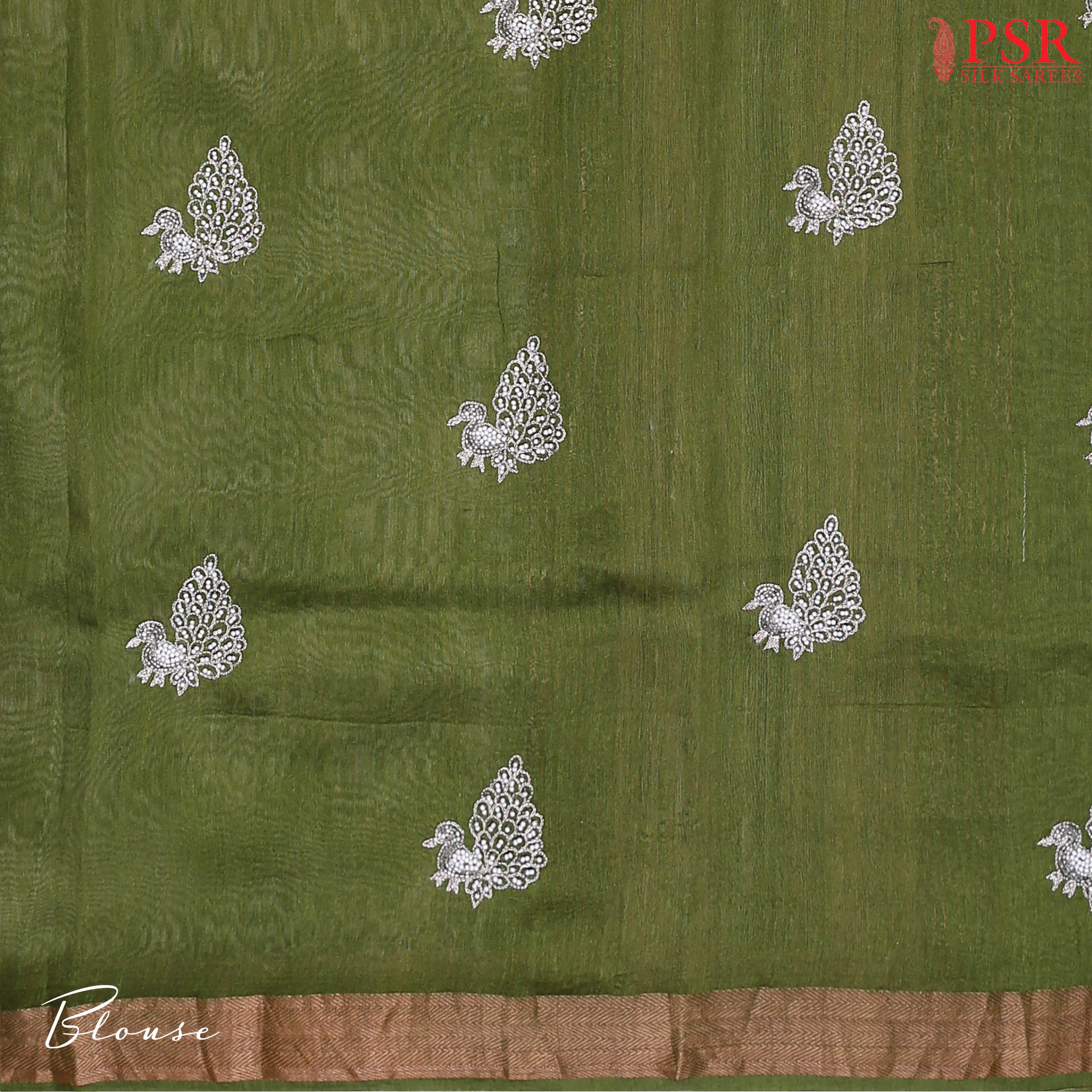 Indulge in the charm of our Green Shaded Munga Silk Saree, featuring graceful chevron prints that exude sophistication. The Sap Green pallu, adorned with zari stripes, adds a regal touch, while the antique zari border enhances its classic appeal. Completing this exquisite drape is a matching Sap Green blouse, delicately embroidered with elegant Peacock motifs, adding a hint of tradition to your ensemble.