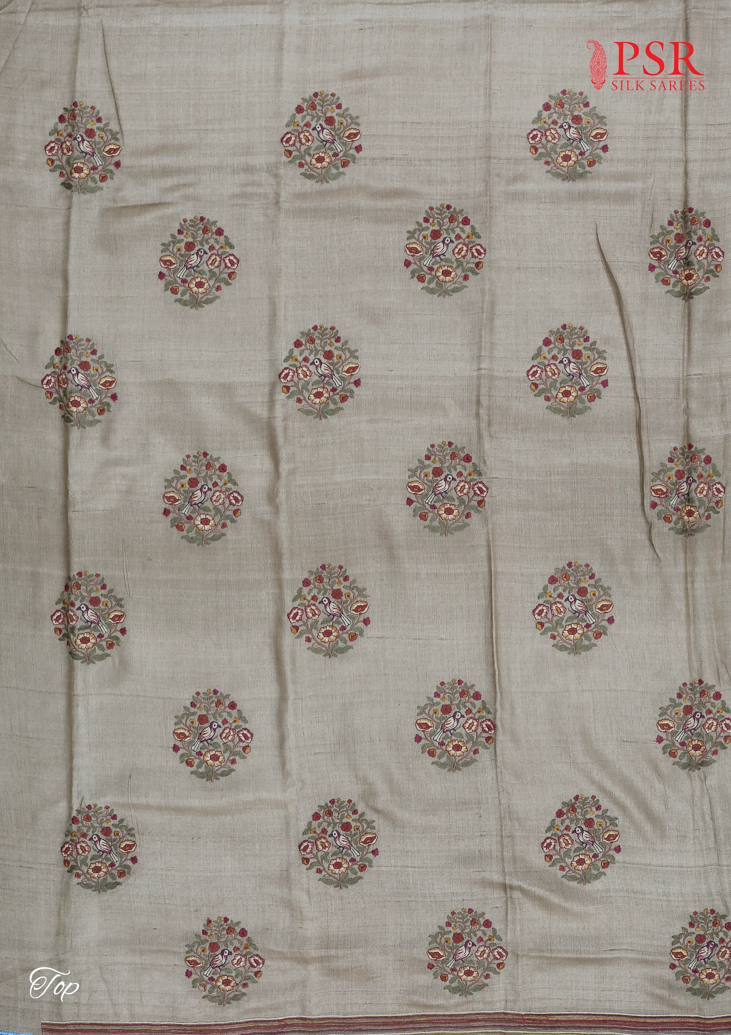 PSR Silks presents Greige colored Tussar Silk Dress Material with combination of Charcoal Grey color.