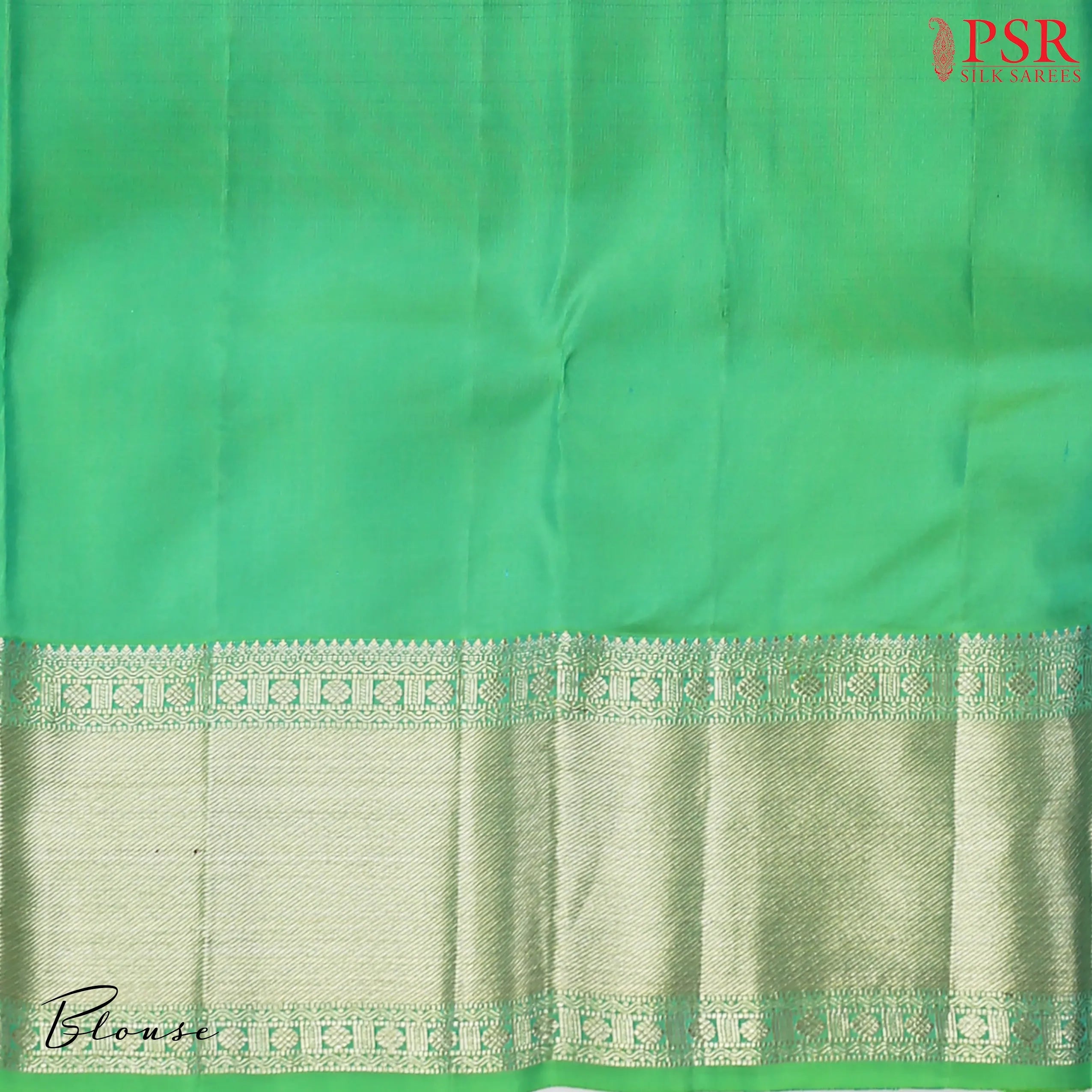 PSR Silks presents a breathtaking Heavenly Green Kanchipuram Silk Saree from the exclusive Vaichitrya Kanjivaram collection—where tradition meets timeless elegance. This captivating saree features an exquisite designer floral ogee pattern, meticulously woven with intricate detail to create a luxurious texture.