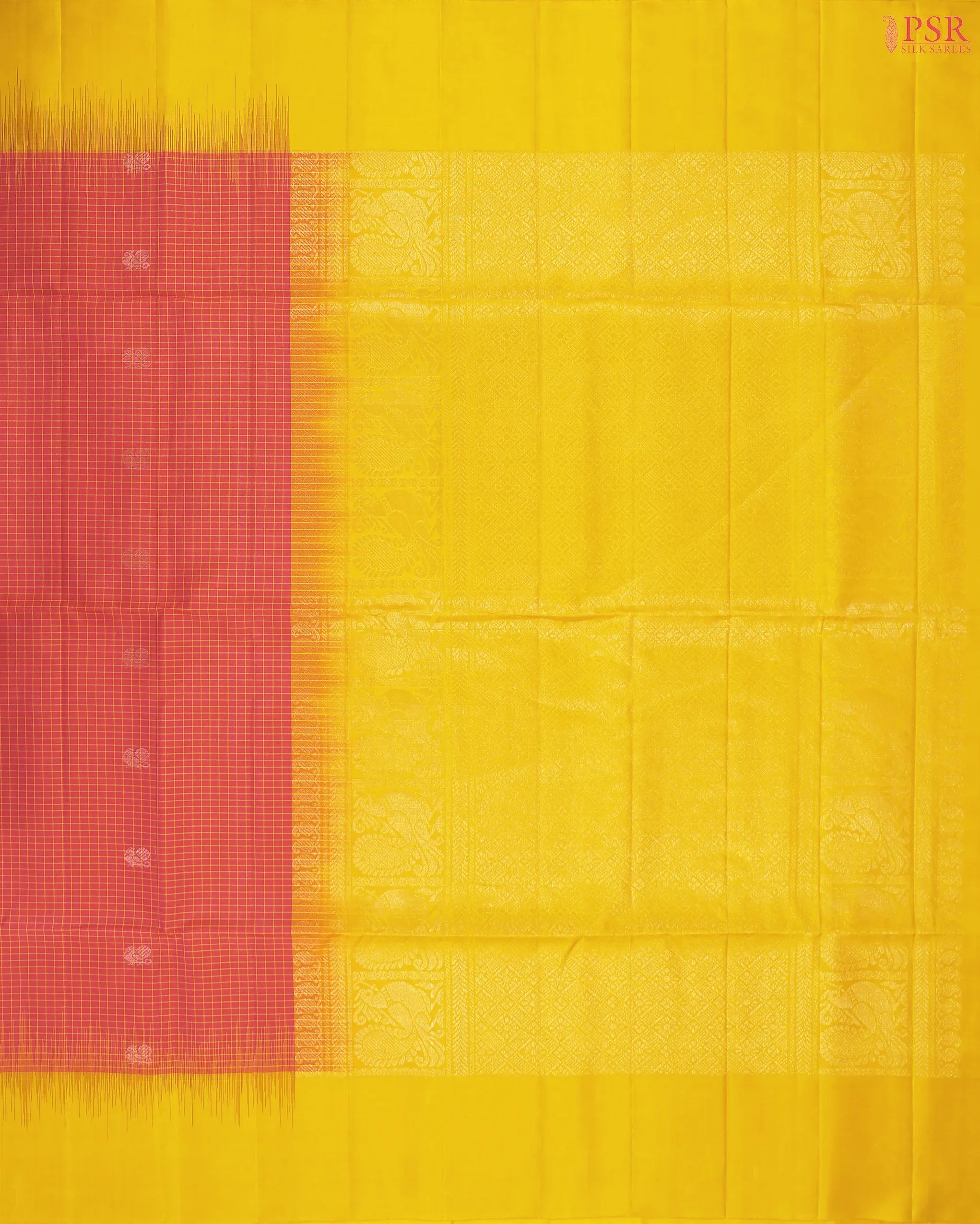 This eye-catching saree features bright yellow checkered patterns adorned with delicate Mayura (peacock) zari motifs, adding a touch of heritage charm and intricate detailing. The Cyber Yellow pallu with elegant zari jacquard work enhances its grandeur, creating a beautiful contrast against the deep red body.