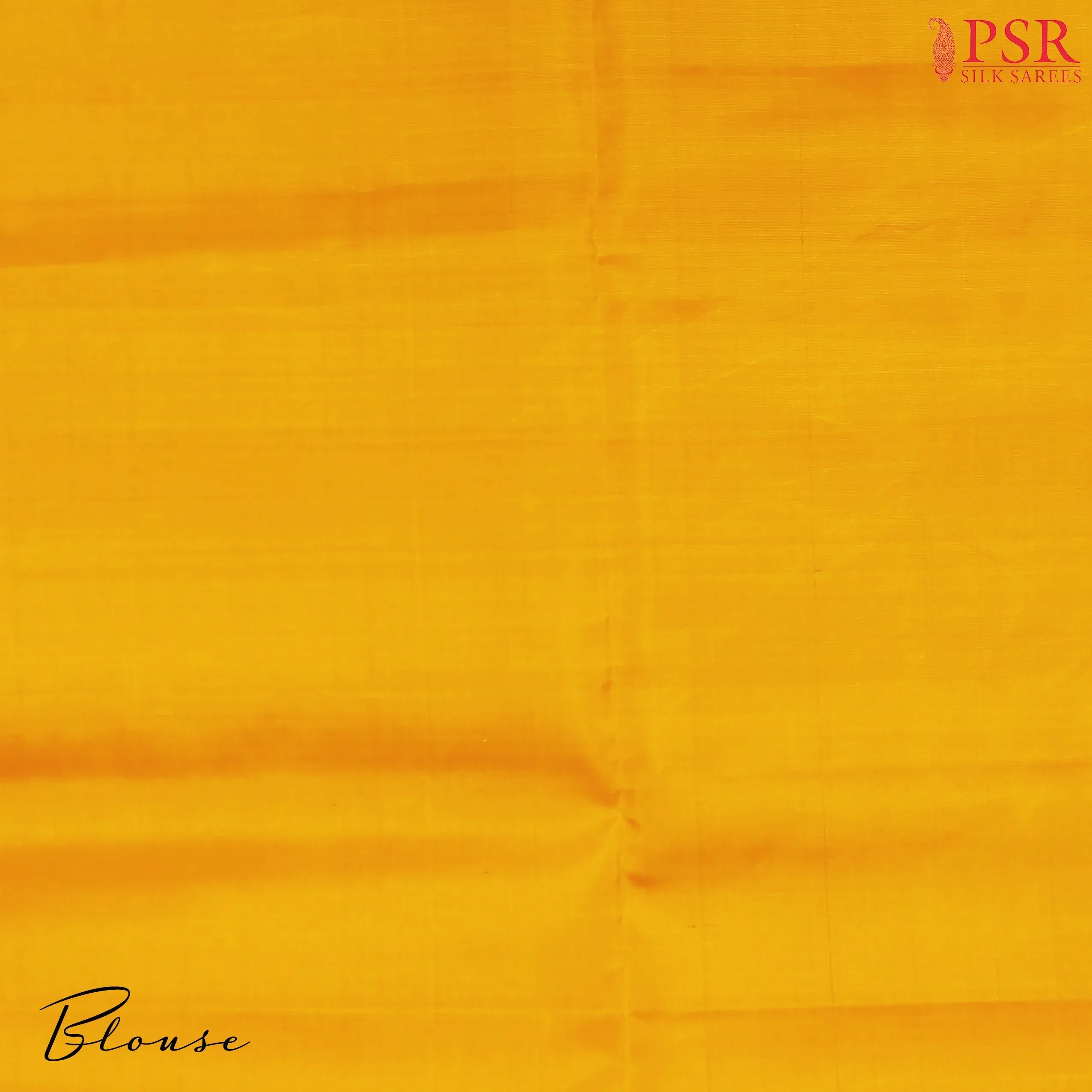 Crafted in a traditional design, it is completed with a Golden Yellow pallu adorned with traditional zari work with simple border & plain blouse.