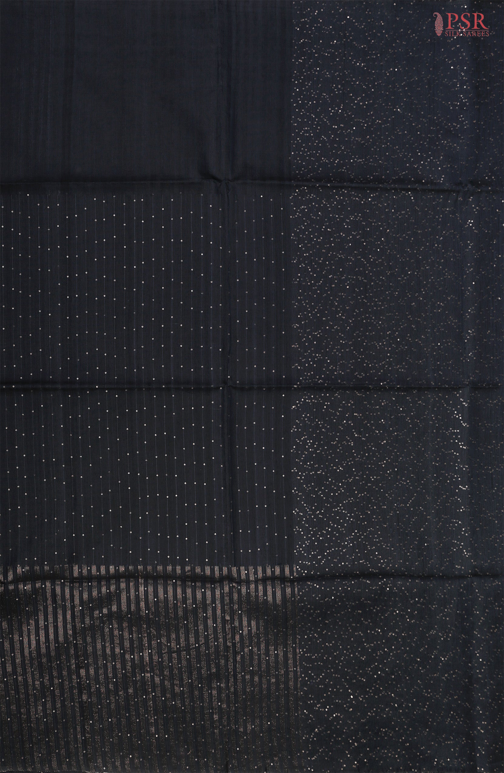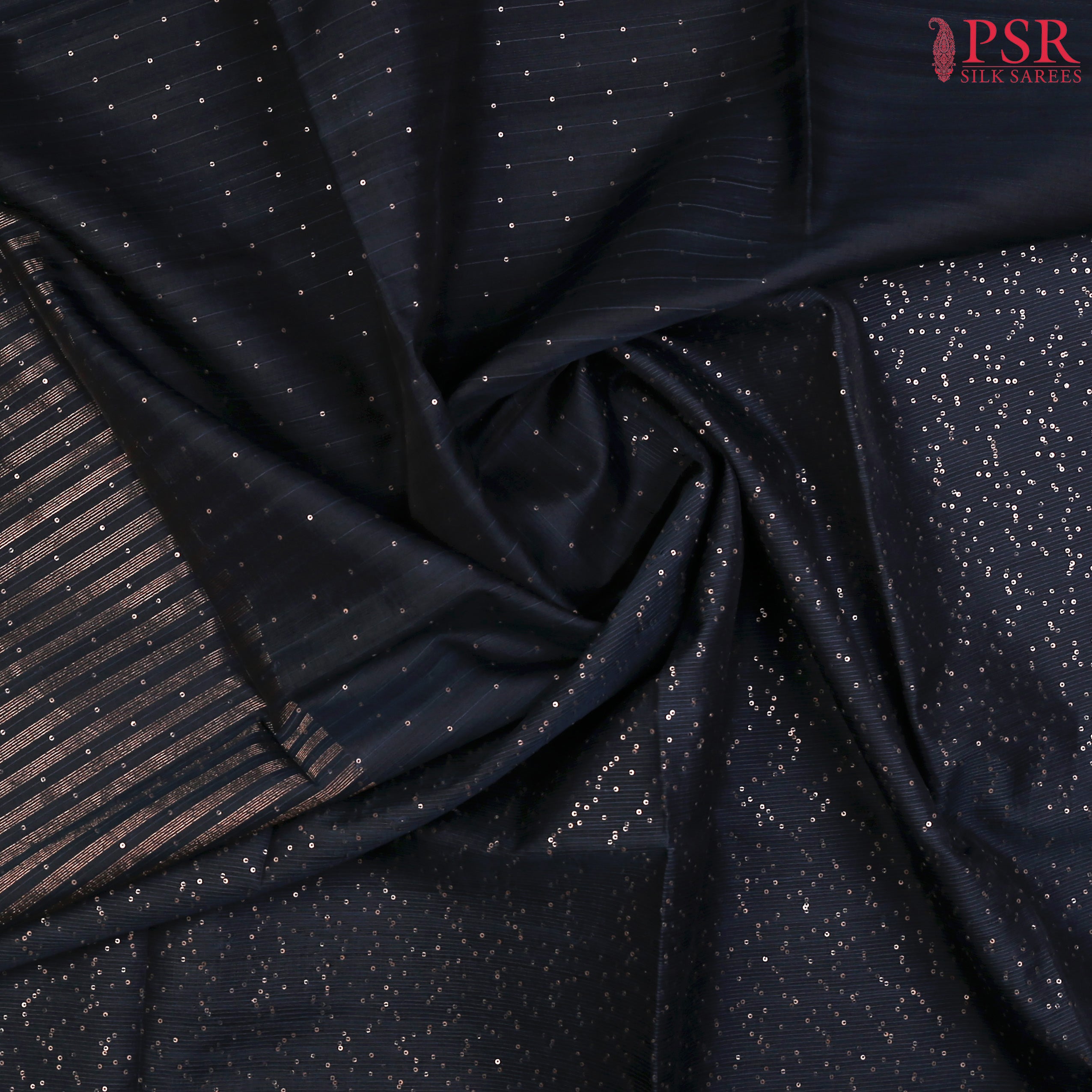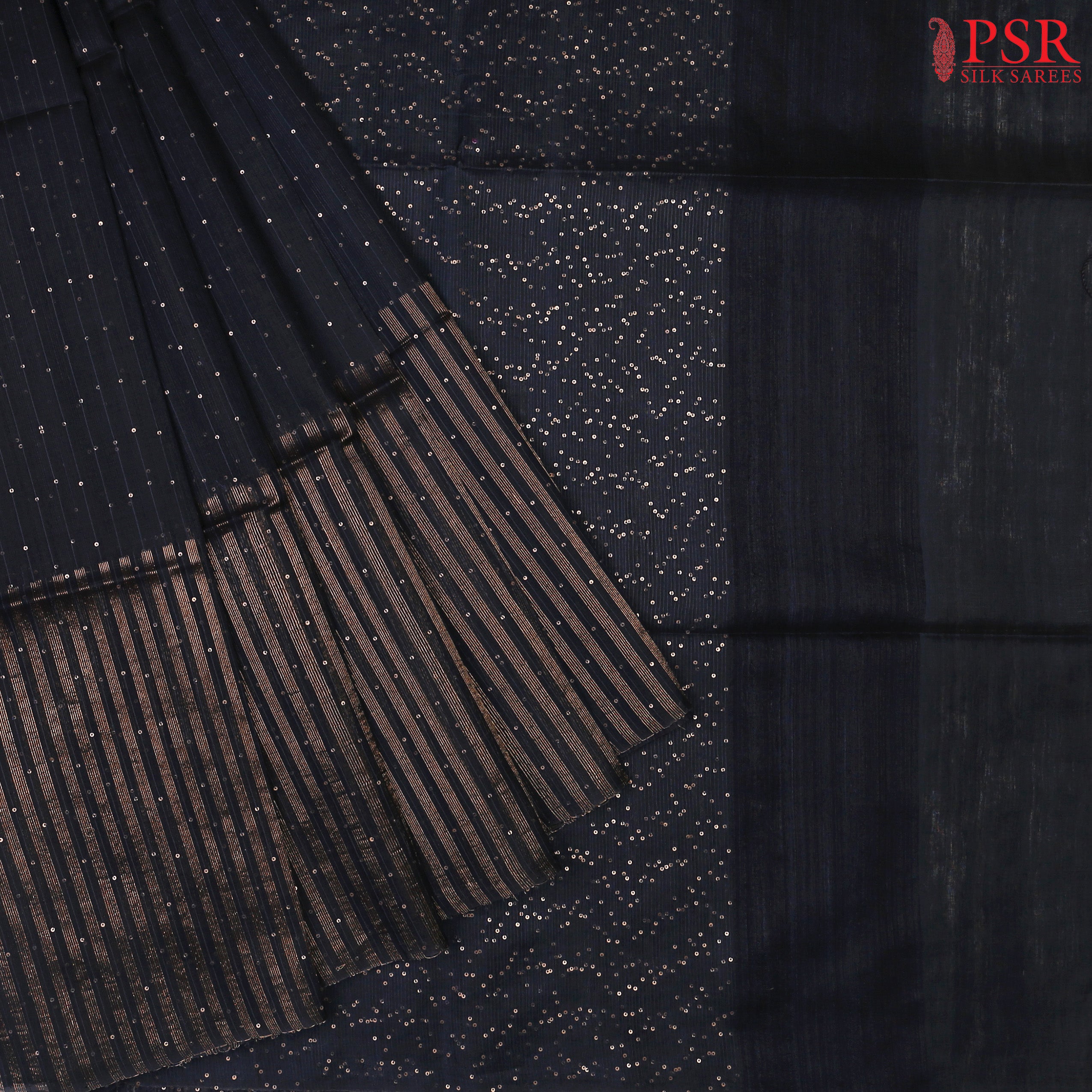 PSR Silks presents a stunning Midnight Blue Khadi Tussar Silk Saree, featuring an elegant self-thread striped pattern enhanced with intricate sequin embroidery work, adding a touch of glamour to the design.