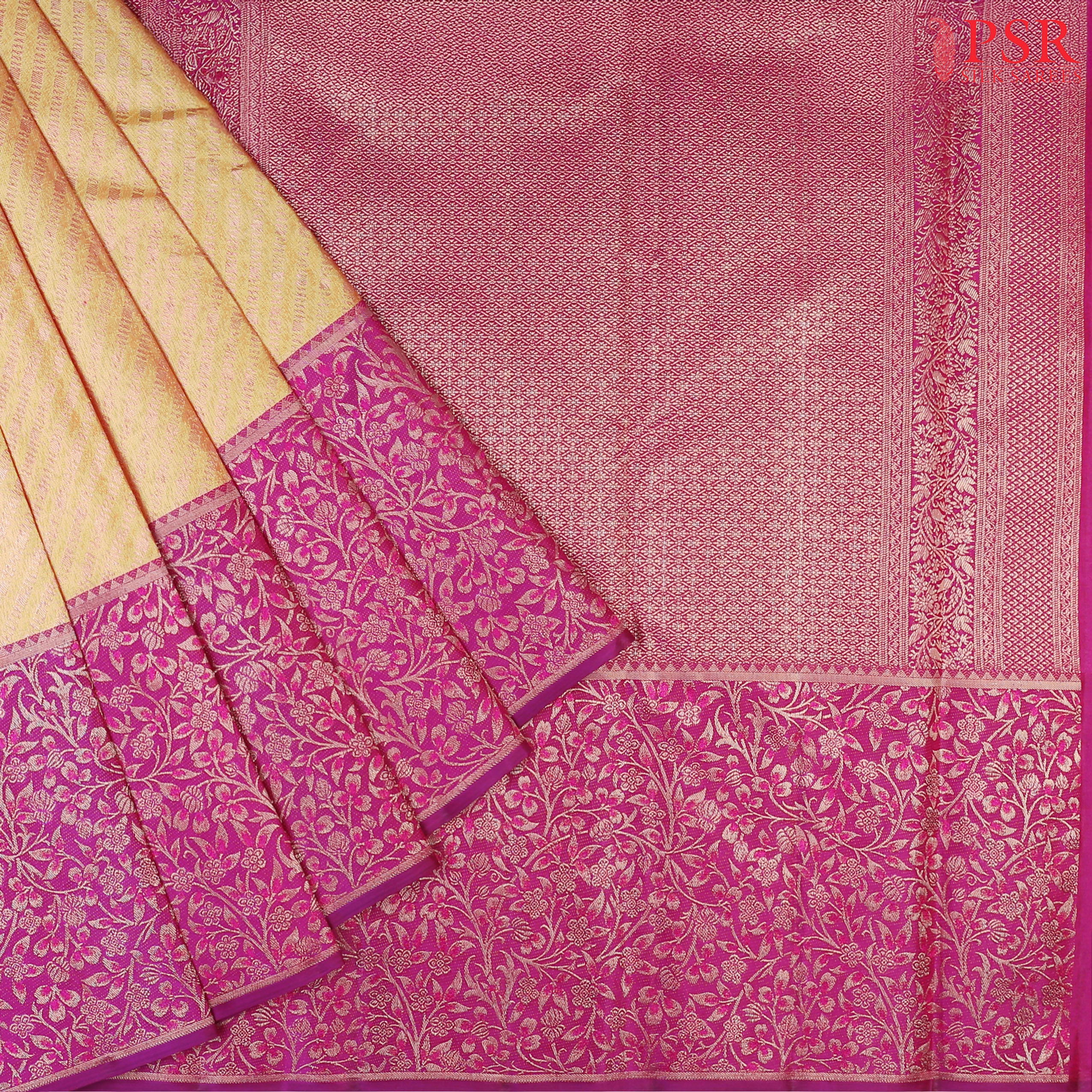 Discover the captivating charm of our Olive Yellow Kanchipuram Silk Saree, perfectly complemented by the vibrant hues of Magenta Pink. This exquisite saree features a stunning designer diagonal zari stripes pattern, exuding a blend of modern sophistication and traditional artistry.
