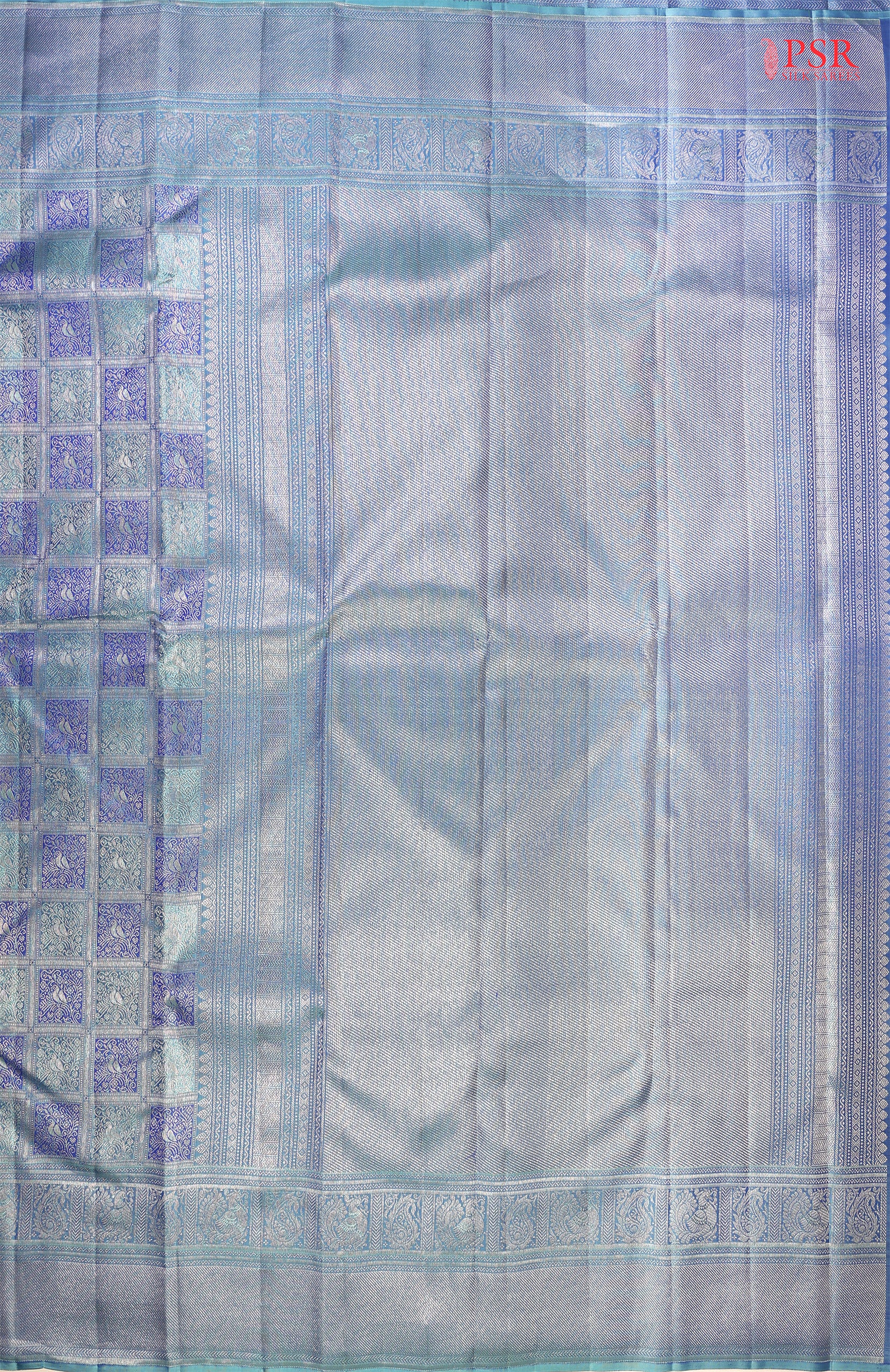 Drape yourself in the ethereal beauty of our Light Maya Blue Kanchipuram Silk Saree, featuring intricately woven silver zari checks, adorned with delicate floral and bird motifs that bring the design to life. A touch of royal blue in the checks enhances the saree’s allure, creating a stunning contrast. The saree is completed with a traditional silver zari vazhaellai (banana leaf) striped pallu, blouse, and border, adding a regal and cultural touch to this masterpiece.