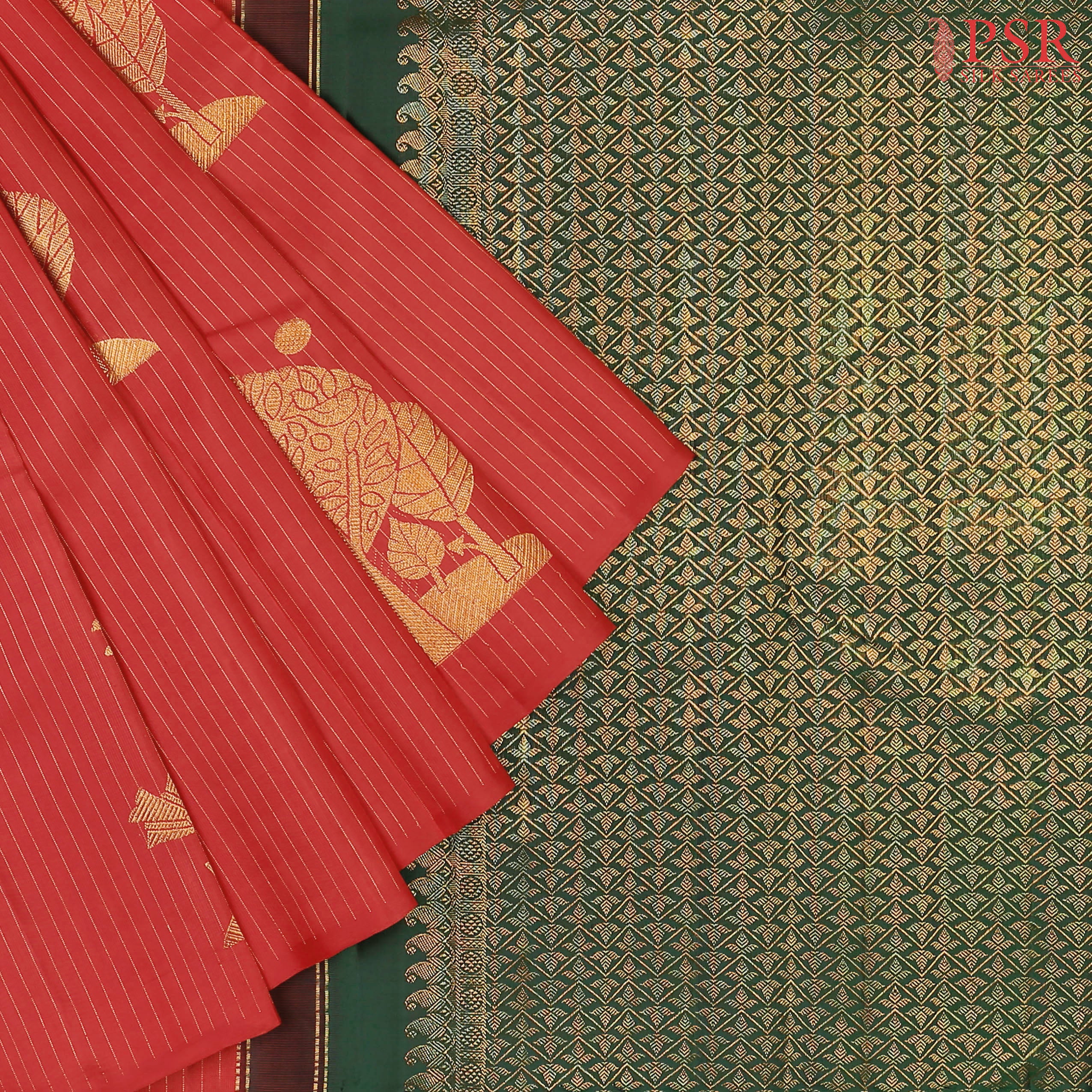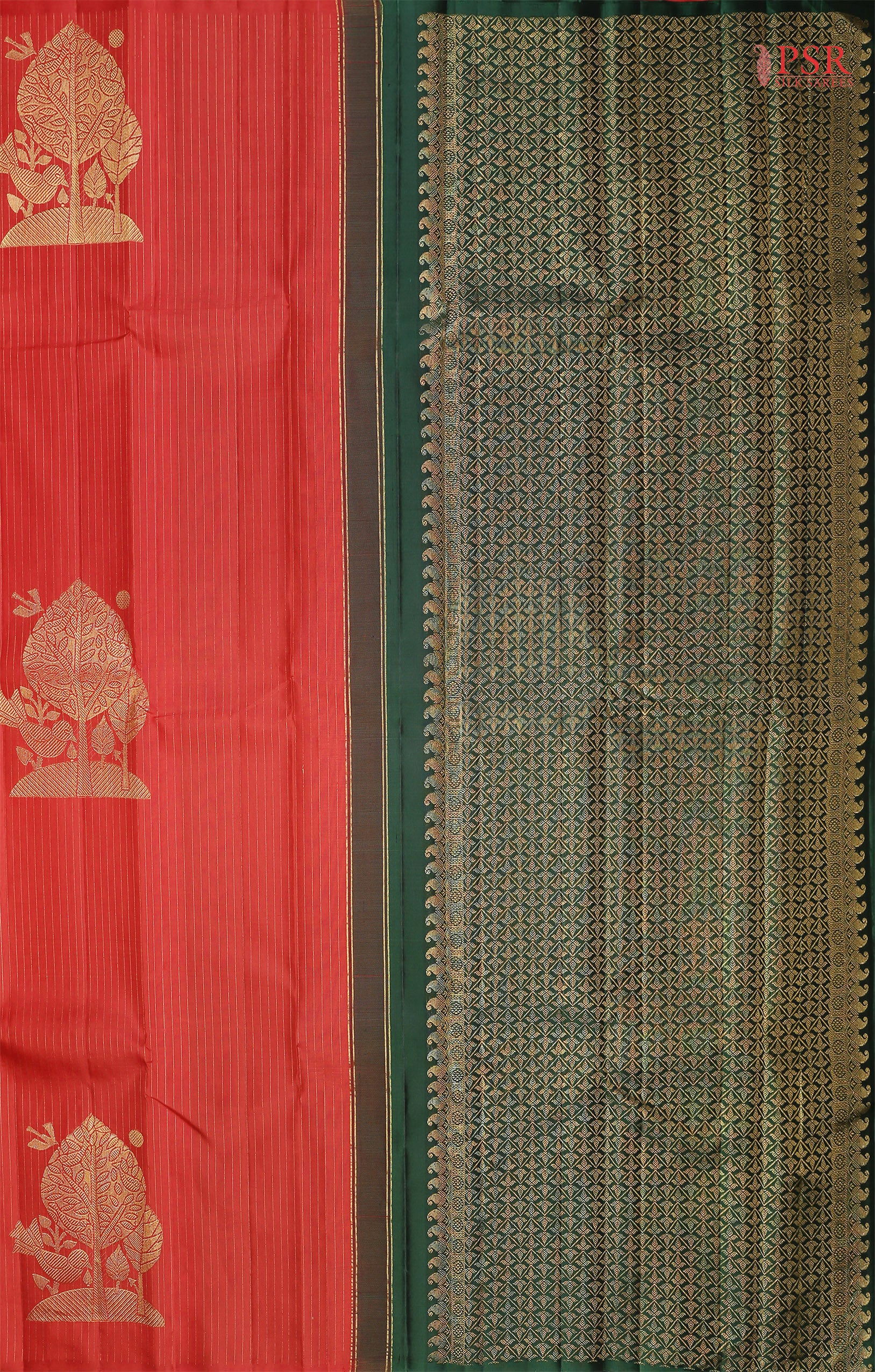 Add a touch of regal elegance to your wardrobe with our Red Kanchipuram Silk Saree, a breathtaking piece from the Shrestha Kanjivaram range. This stunning borderless saree showcases exquisite golden zari stripes adorned with magnificent floral and bird motifs, radiating charm and sophistication. The saree is perfectly complemented by a Dark Green pallu, enriched with intricate traditional golden zari artistry, and a matching plain blouse for an effortlessly elegant look.