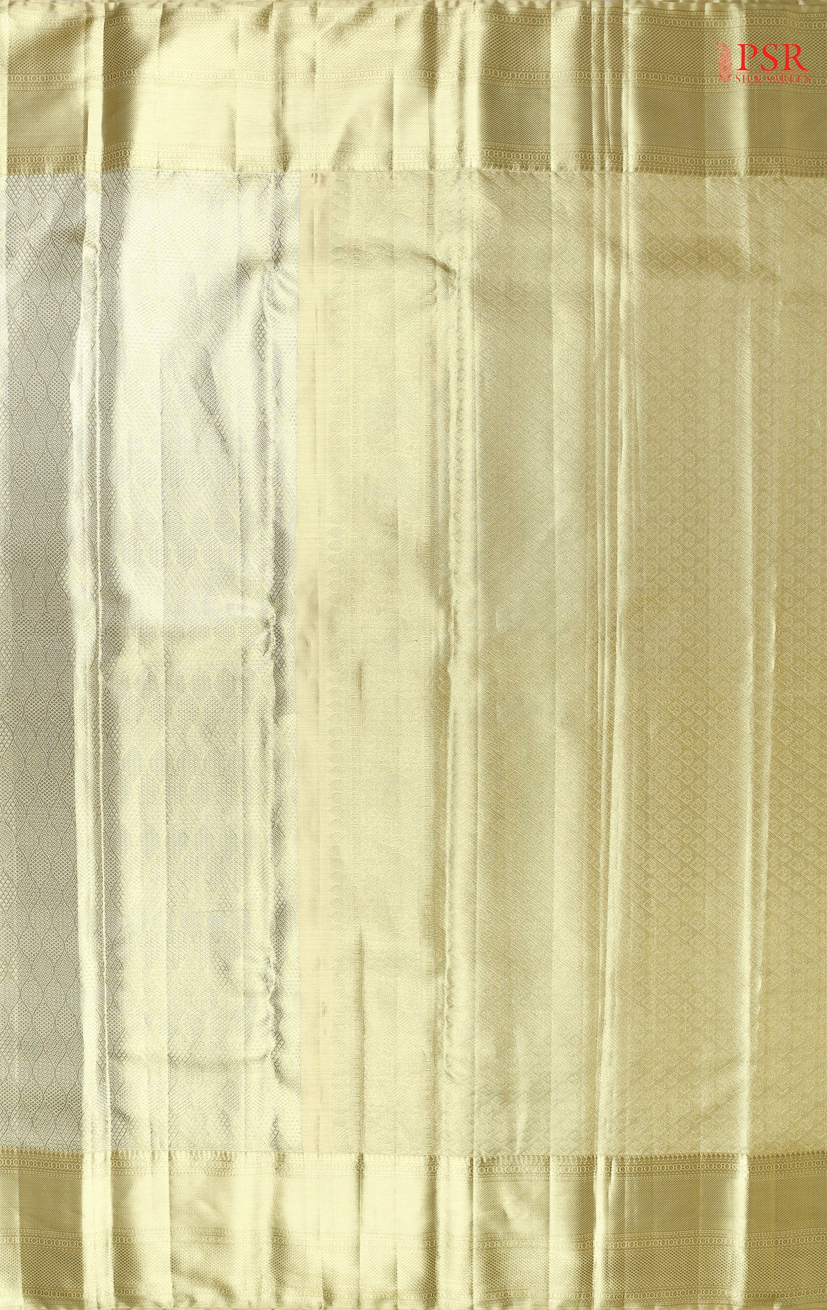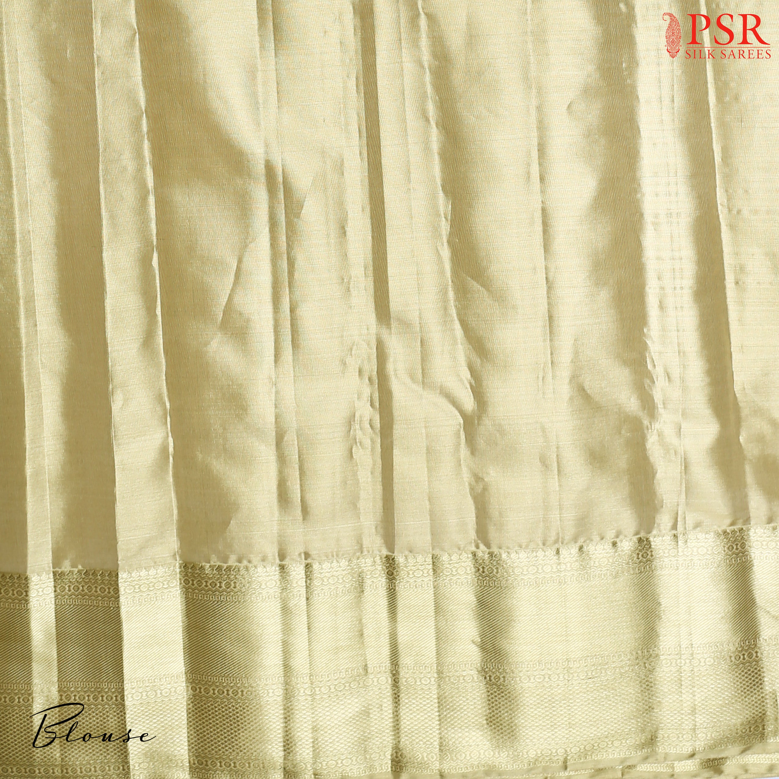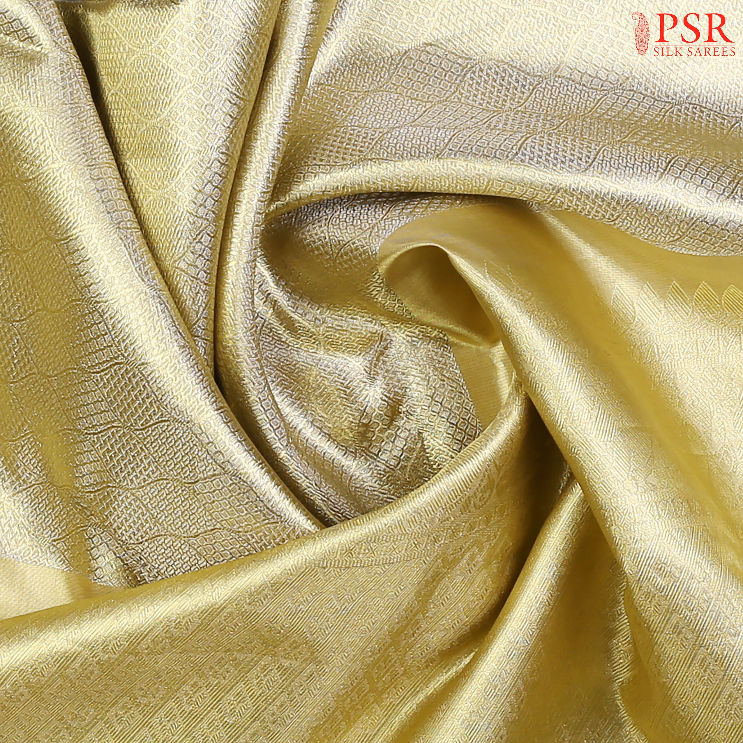 Elevate your style with PSR Silk Sarees' exquisite Golden Beige Kanchipuram Tissue Silk Saree from our signature 'Vaichitrya Kanjivaram' collection. This masterpiece features mesmerizing golden ogee-pattern weaves that embody timeless elegance. The saree is beautifully complemented by a traditional zari work pallu and border, adding a regal touch. Paired with a plain golden beige tissue blouse, this saree exudes sophistication and grace. Perfect for weddings, festive occasions, and special celebrations, this Kanjivaram saree is crafted to make a statement. Redefine luxury with PSR Silk Sarees!