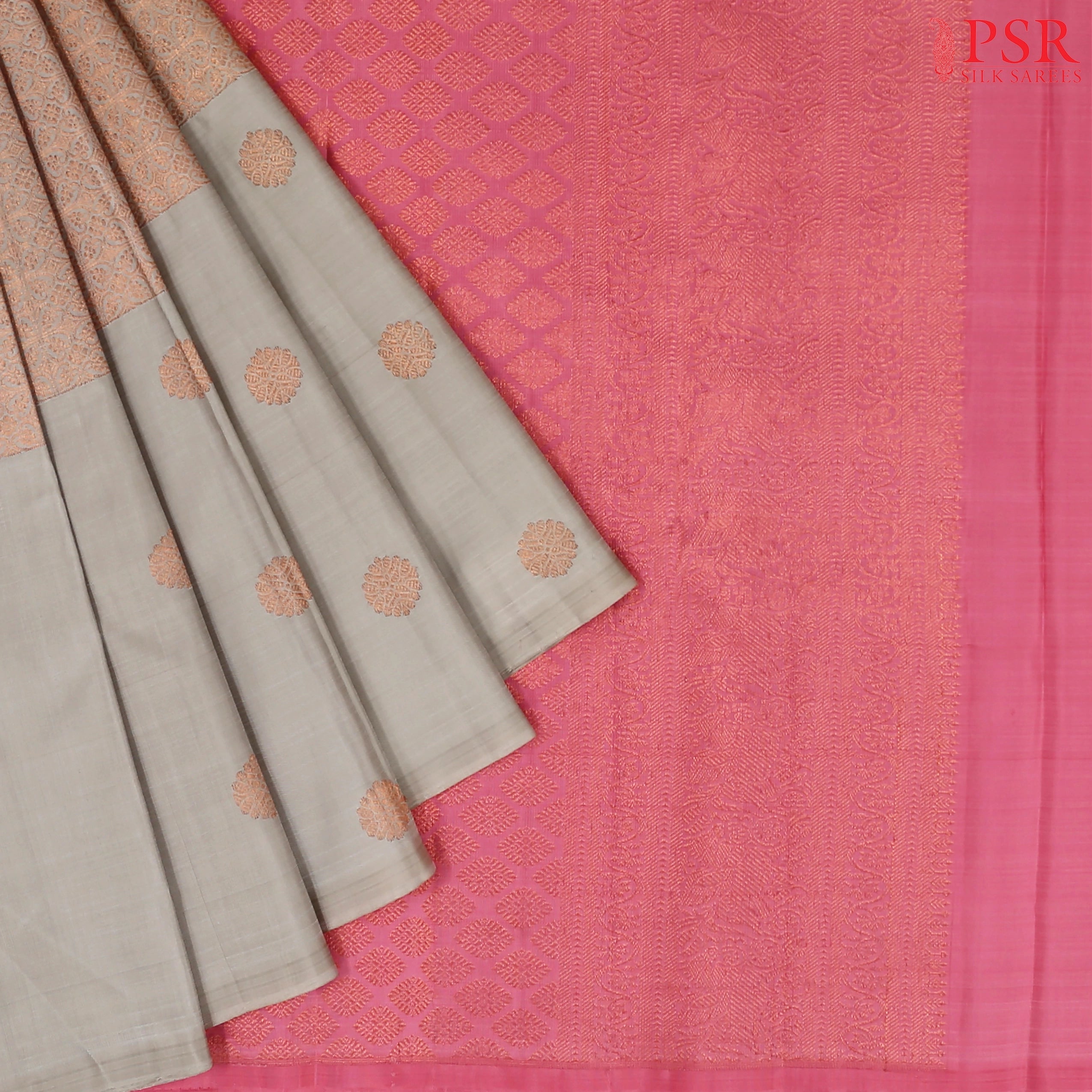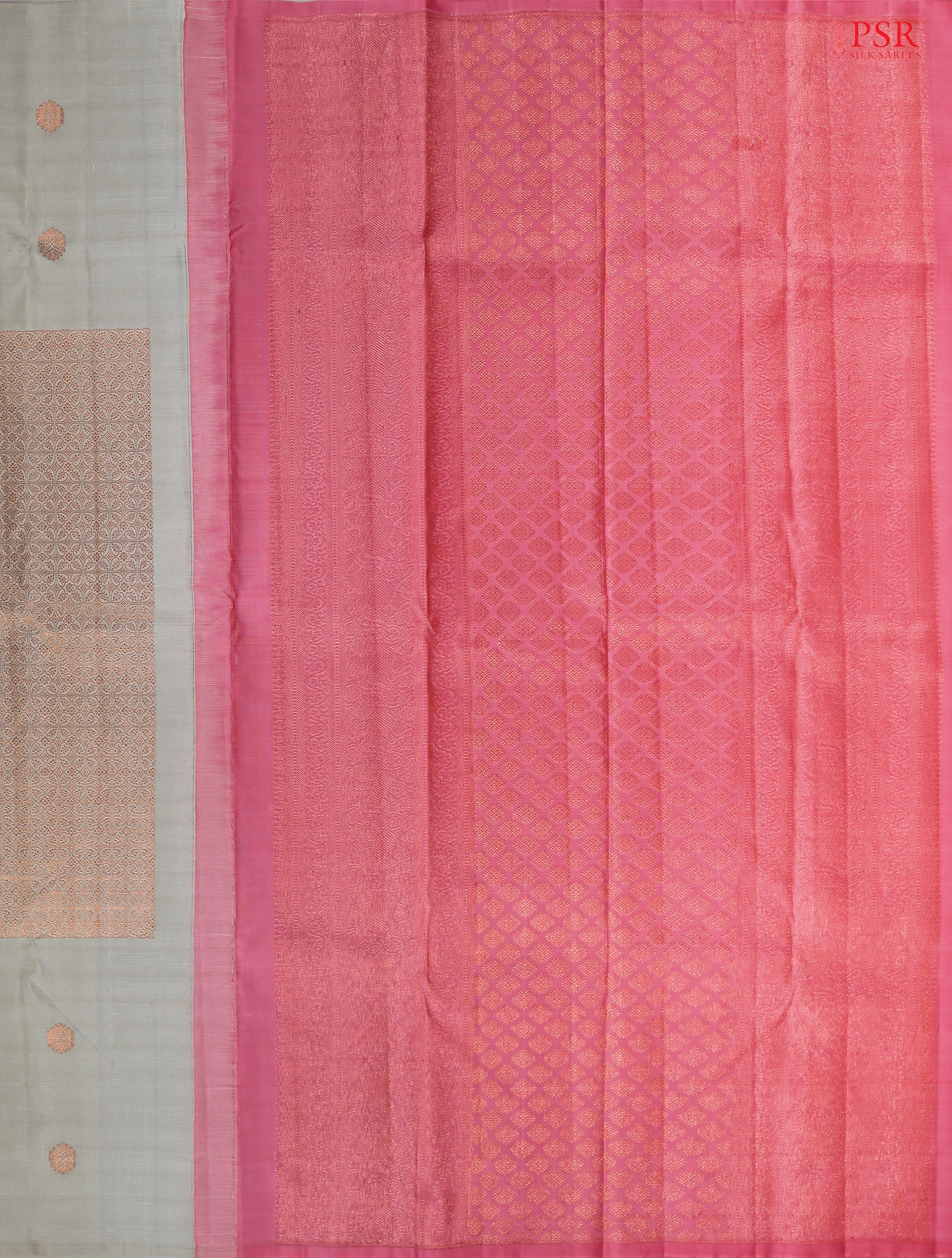 PSR Silk Sarees presents a sophisticated Light Grey Kanchipuram Silk Saree, part of our premium "Shrestha Kanjivaram" collection, paired beautifully with a Light Pink contrast.