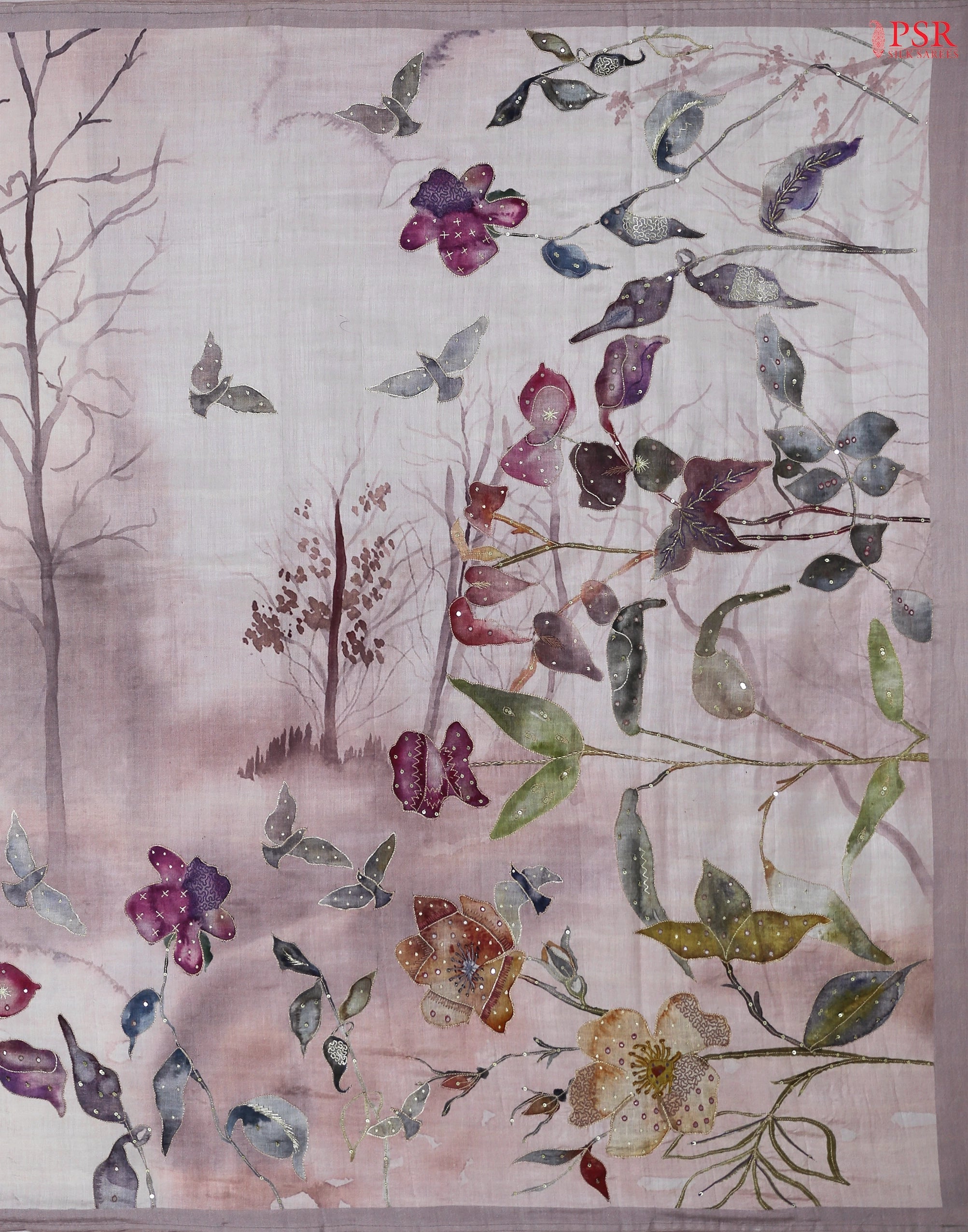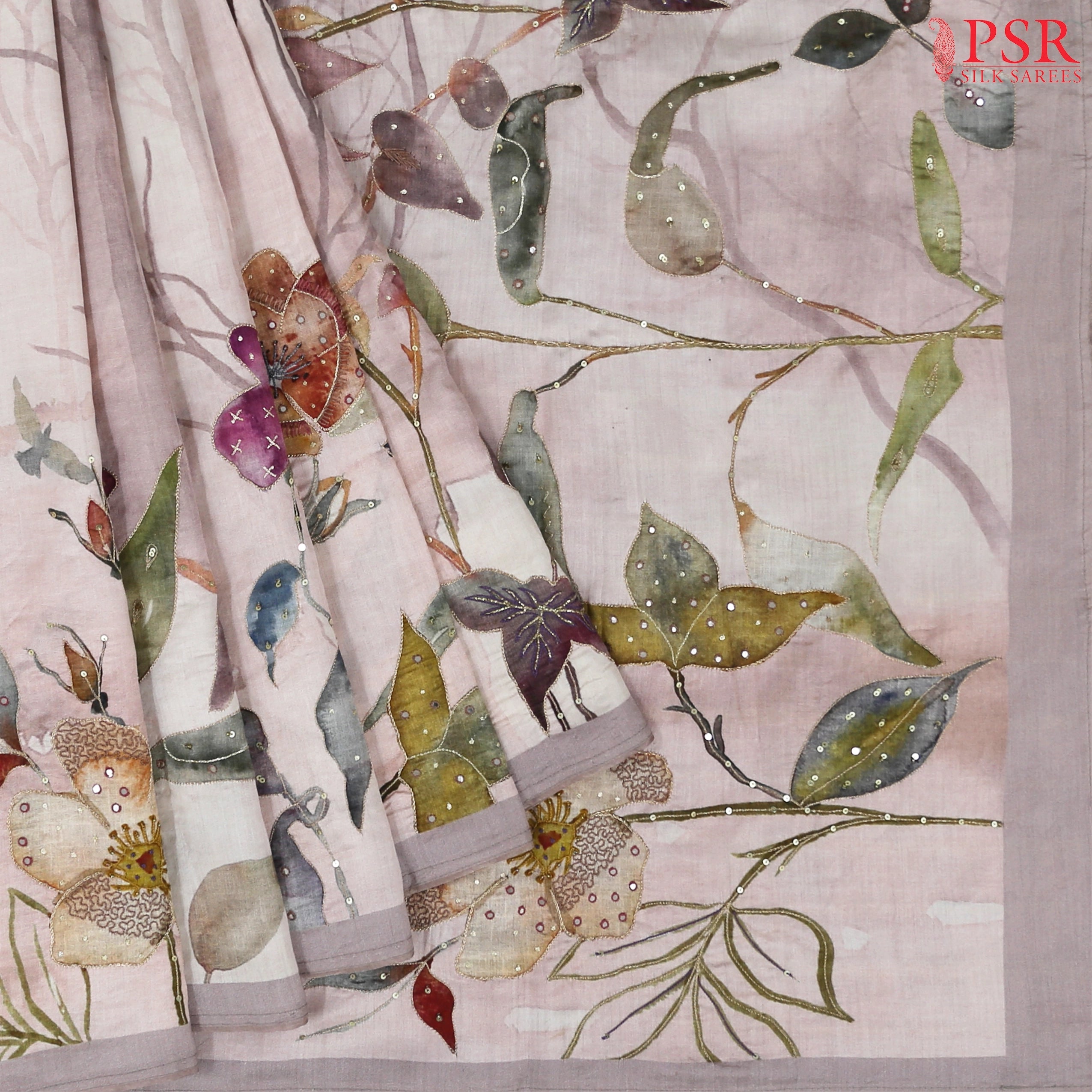 Light Pink Soft Chinya Silk Saree with Tree & Bird Motif Embroidery – PSR Silk Sarees