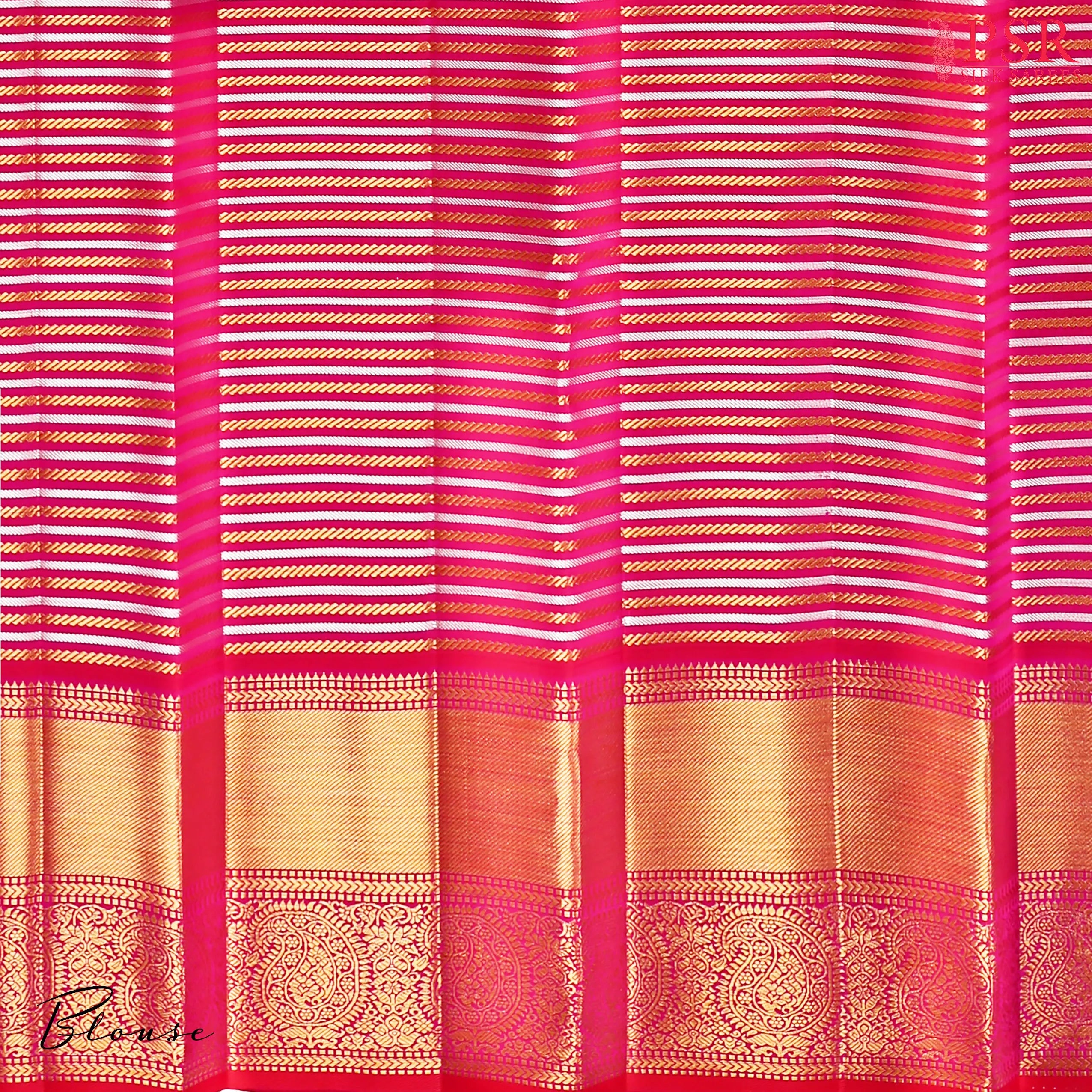 The saree features exquisite silver and golden zari horizontal stripes, creating a mesmerizing shimmer across its body. It is complemented by a Cerise Pink pallu adorned with rich and traditional zari work, enhancing its bridal grandeur. The saree’s long korvai border showcases intricate zari craftsmanship, adding depth and luxury to the design. Completing the ensemble is a Cerise Pink blouse beautifully woven with silver and golden zari stripes, offering a perfect finishing touch.
