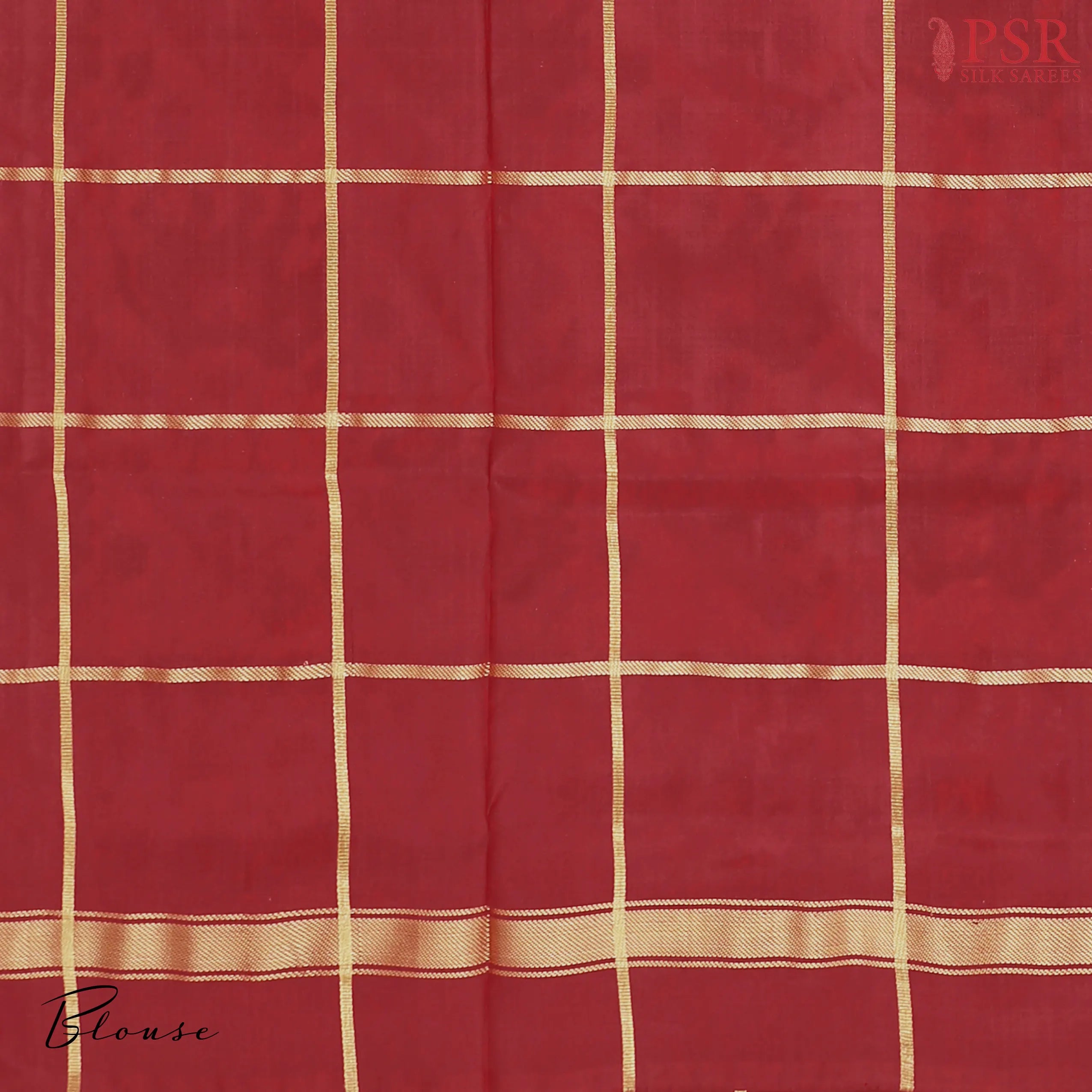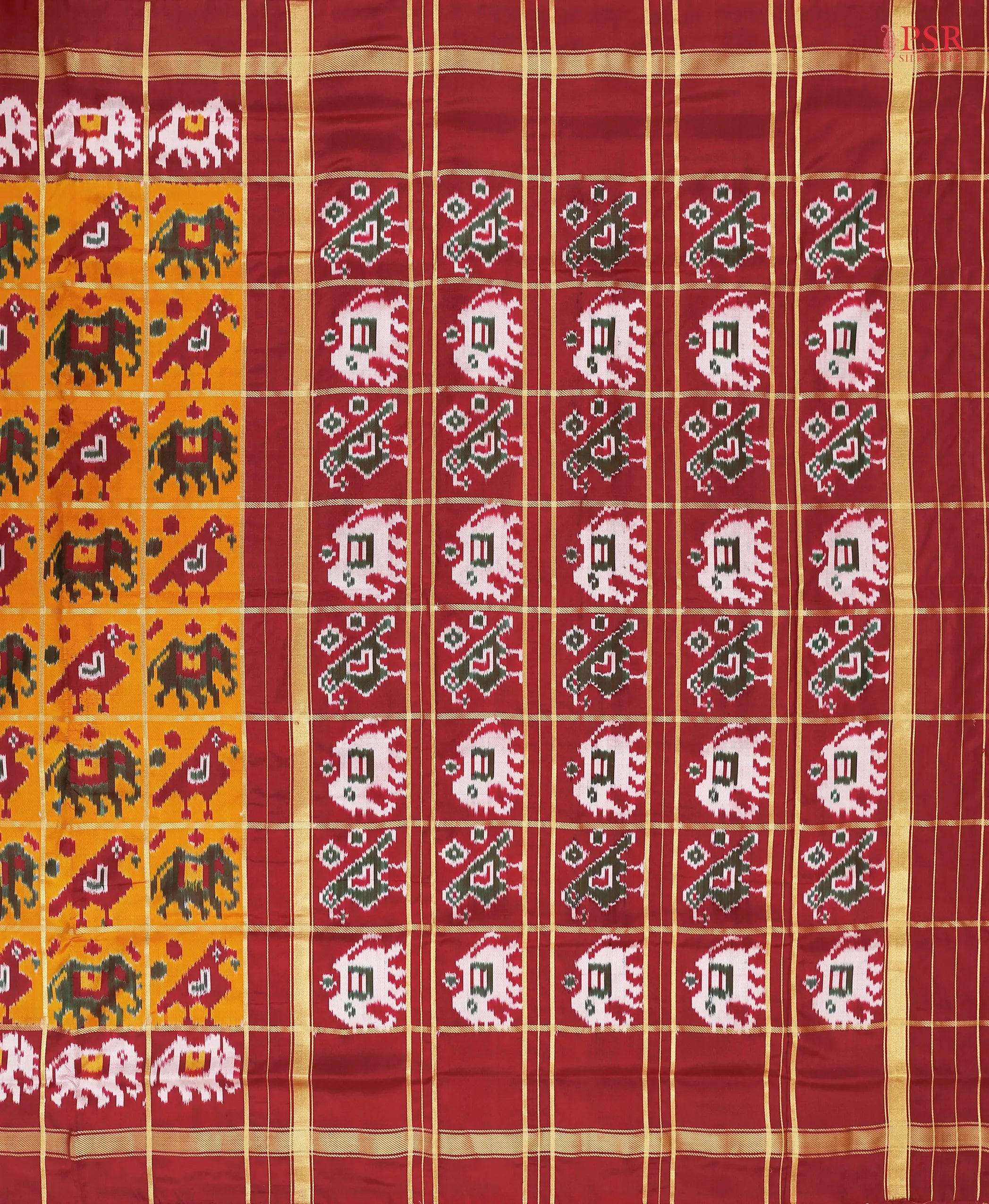PSR Silk Sarees presents a vibrant Marigold Orange colored Pochampally Silk saree paired with a rich Maroon combination. The saree features an impressive zari checkered pattern highlighted with exquisite Ikat weaves of elephants and birds, symbolizing tradition and artistry. It is beautifully complemented with a Maroon colored traditional zari pallu and matching border. The ensemble is completed with a Maroon colored blouse adorned with zari checks for a refined finish.