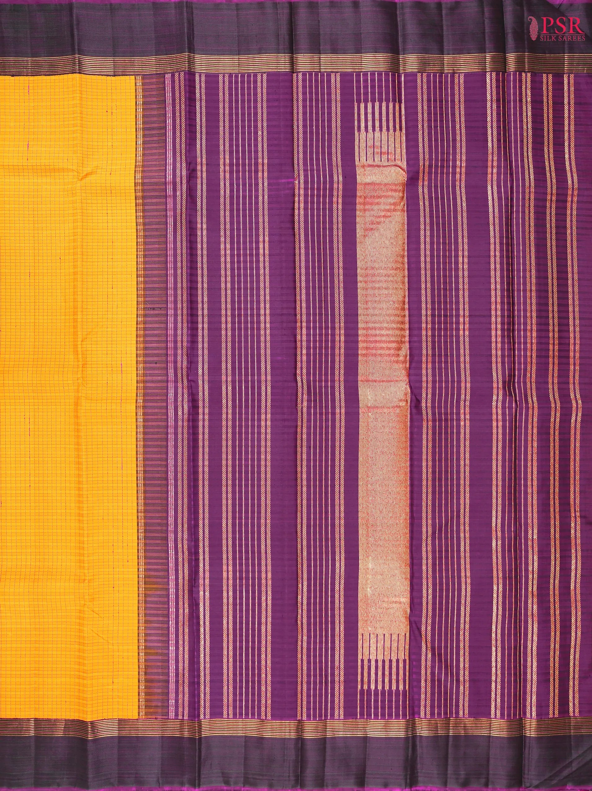 PSR Silk Sarees presents a classic Marigold Yellow Kanchipuram Silk Saree from our Smartika Kanjivaram collection, beautifully paired with a rich Dark Purple contrast. The saree features a graceful maroon small checkered pattern, exuding elegance in every weave. Its Dark Purple pallu with traditional chit work and a korvai zari border enhance the timeless charm of the drape. A Dark Purple striped blouse completes the ensemble, making it a perfect choice for weddings, festive celebrations, and cultural occasions.