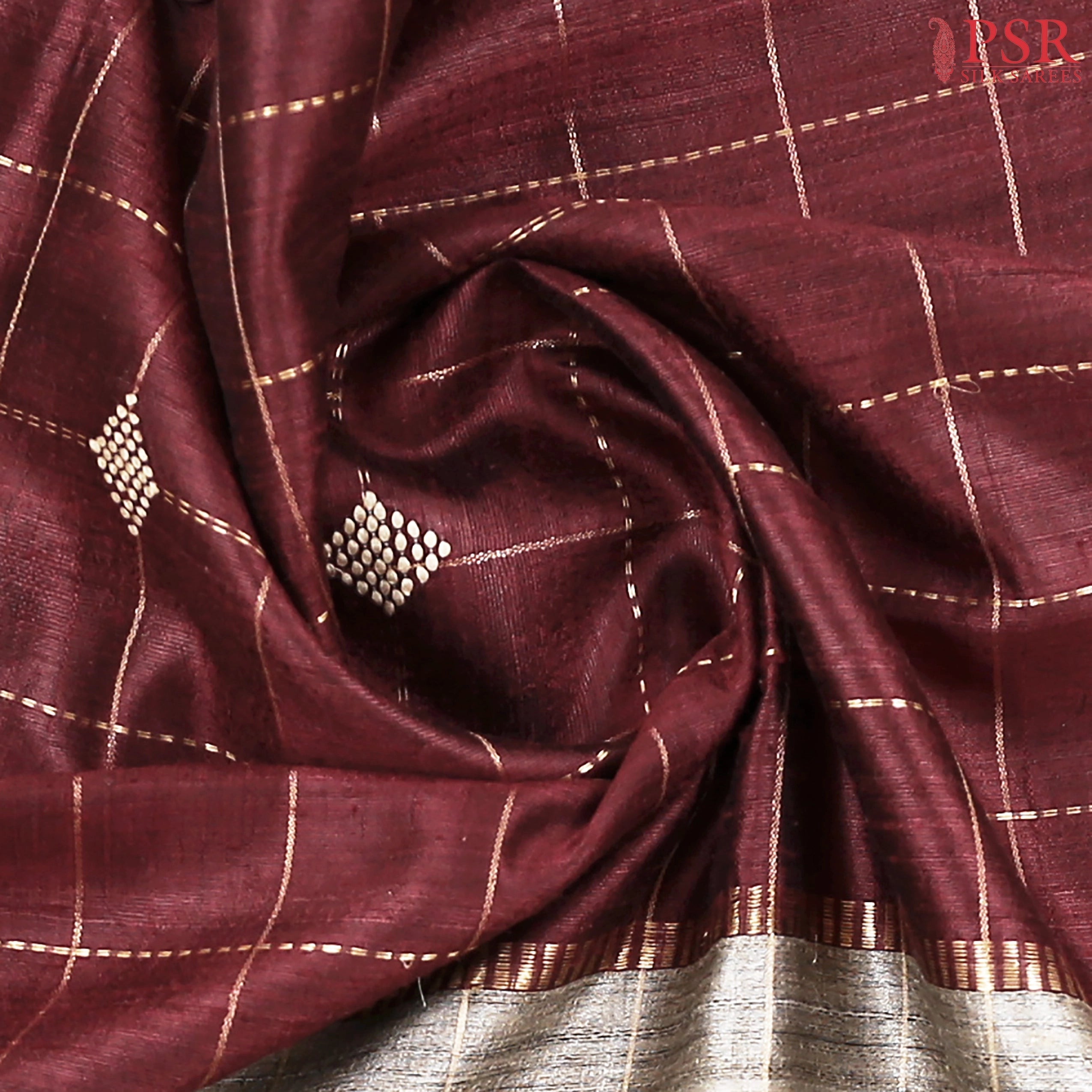 Step into regal elegance with PSR Silk Sarees' Maroon and Tan Ghicha Kadhi Tussar Silk Saree.
