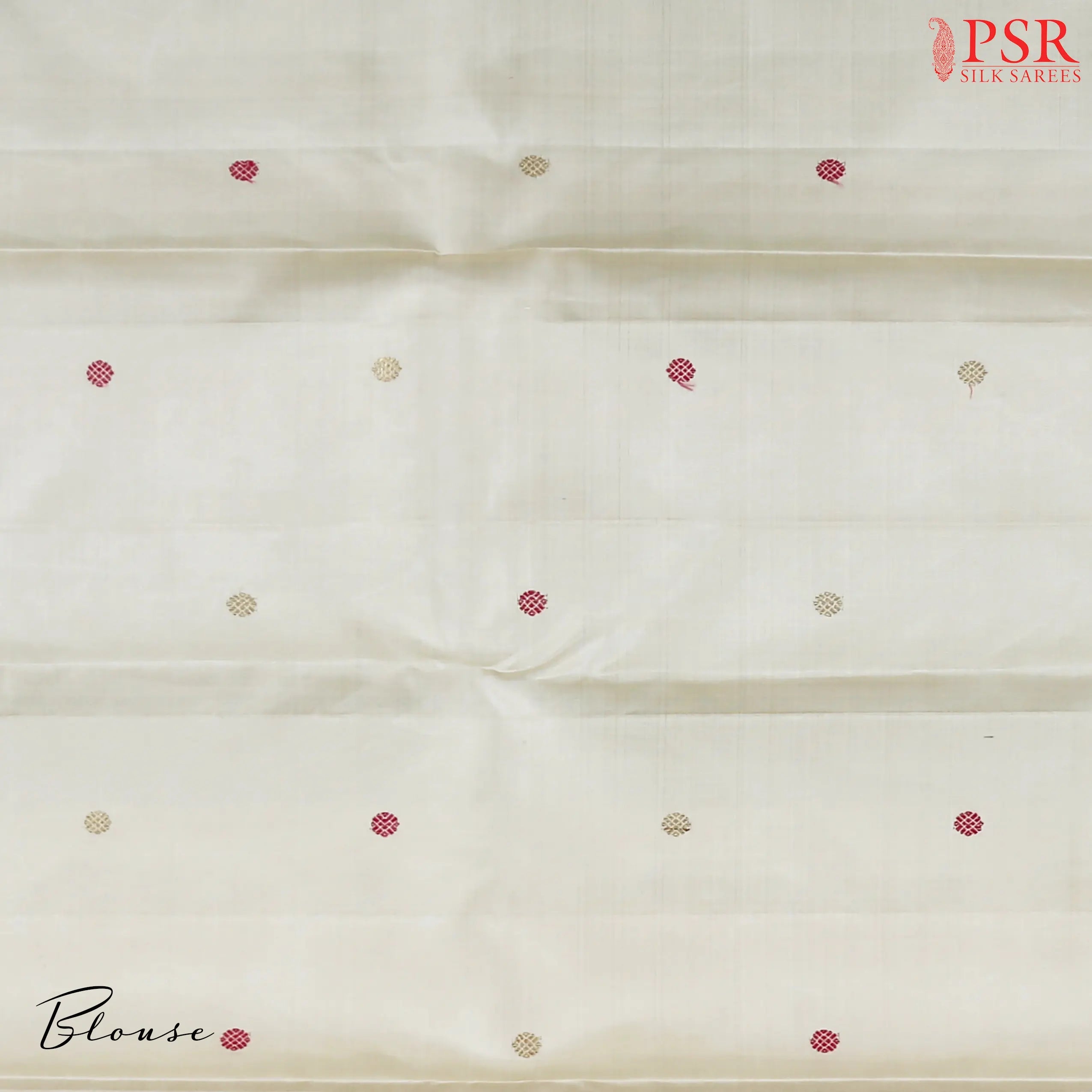 The saree features neatly woven stripes, giving it a refined appeal. It is complemented by a Light Beige pallu and double border adorned with traditional zari work, adding a touch of regal sophistication. The ensemble is completed with a Light Beige blouse wiuth small zari & thread floral motifs, perfectly harmonizing with the saree’s luminous charm.