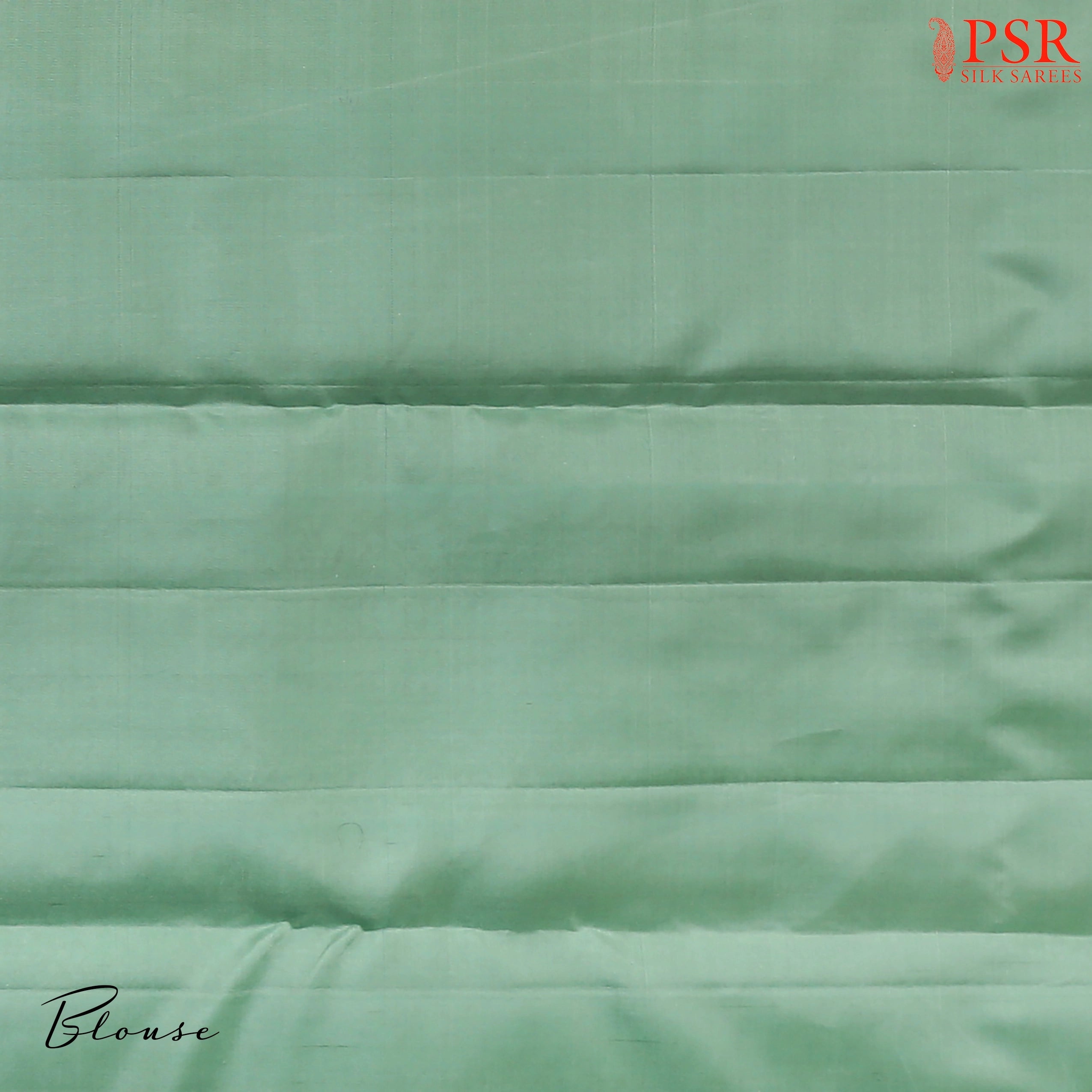 Step into graceful elegance with this Mossy Sage Green Kanchipuram Tissue Silk Saree from the exclusive Vaichitraya Kanjivaram collection by PSR Silk Sarees. This sophisticated drape features designer antique silver zari jacquard weaves, offering a perfect fusion of heritage and contemporary artistry.