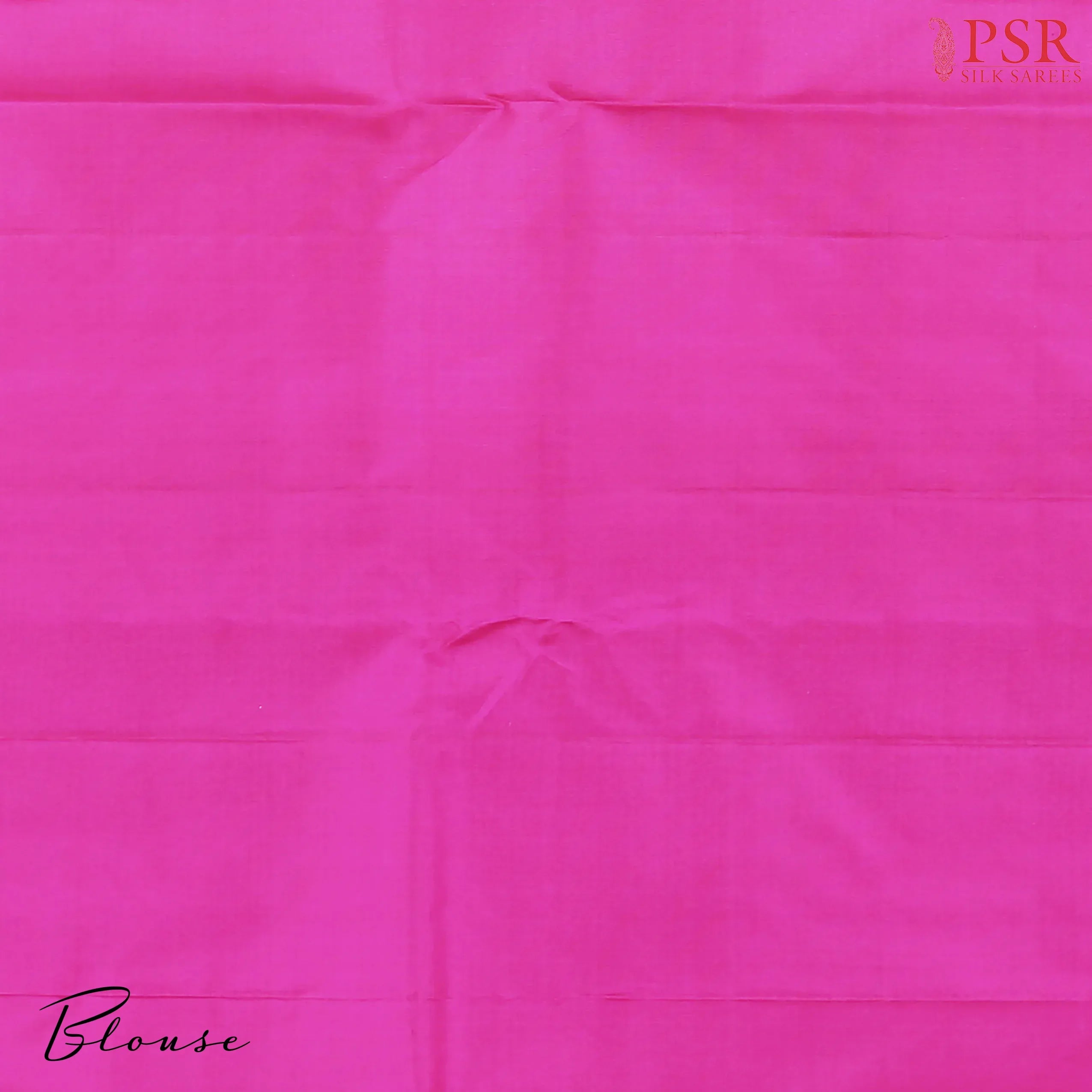 It is complemented by a Magenta Pink traditional zari work pallu, enhancing its rich and ceremonial appeal. The ensemble is completed with a Magenta Pink blouse and a Magenta Pink small zari border, creating a bold, cohesive, and perfectly balanced look.