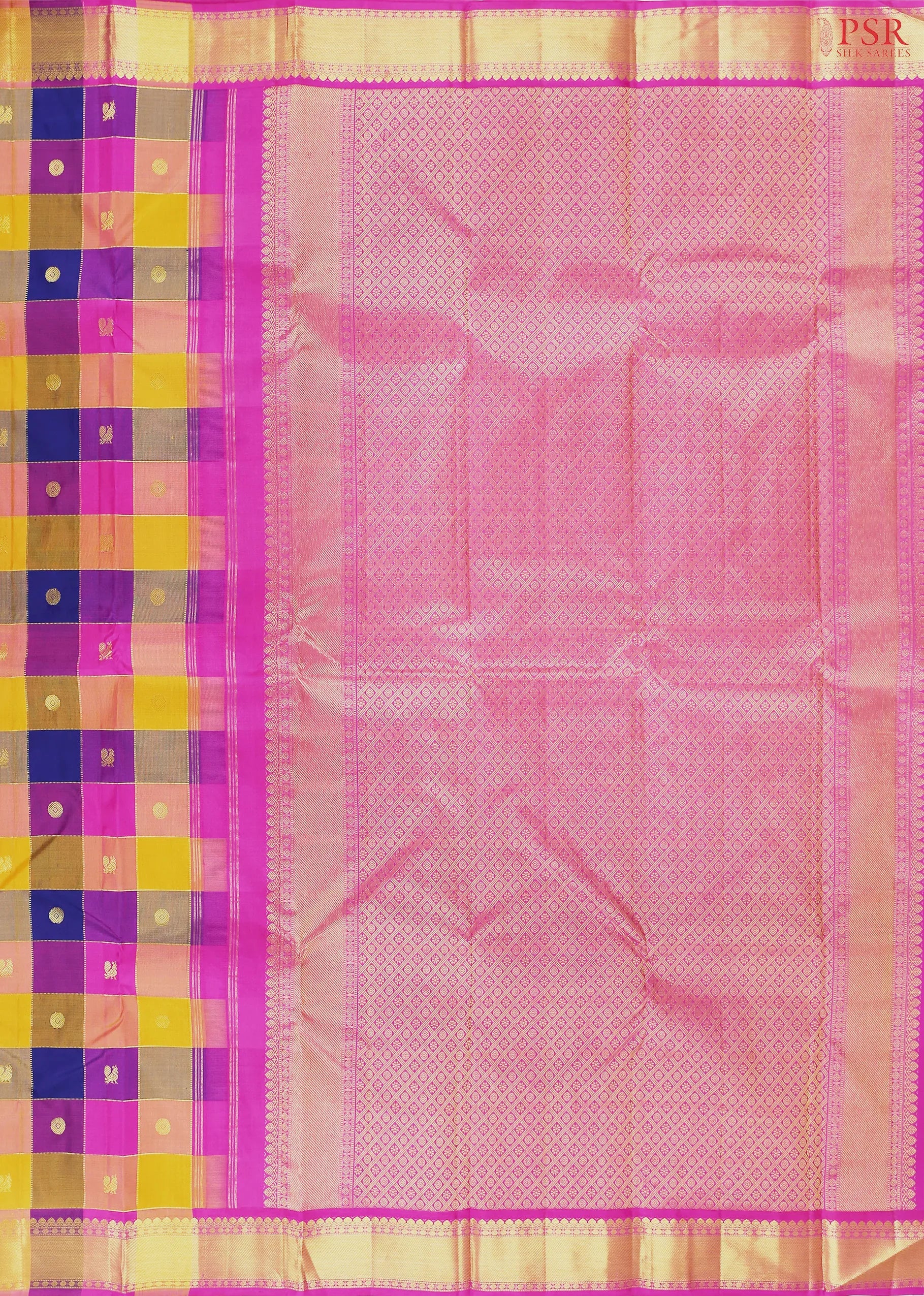 PSR Silk Sarees presents a vibrant Multicolor Kanchipuram Silk Saree with a striking Magenta Pink combination, crafted to reflect festive grandeur and timeless tradition.