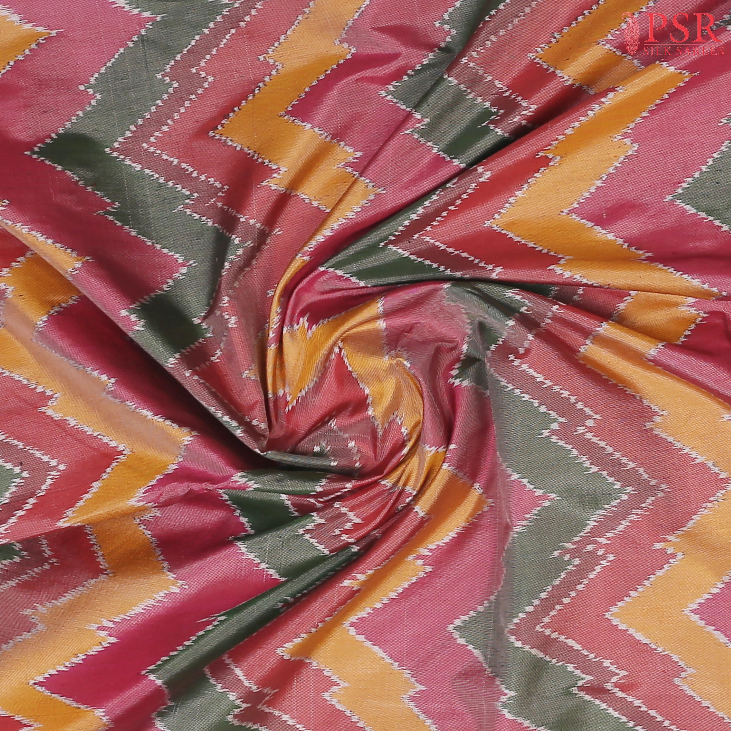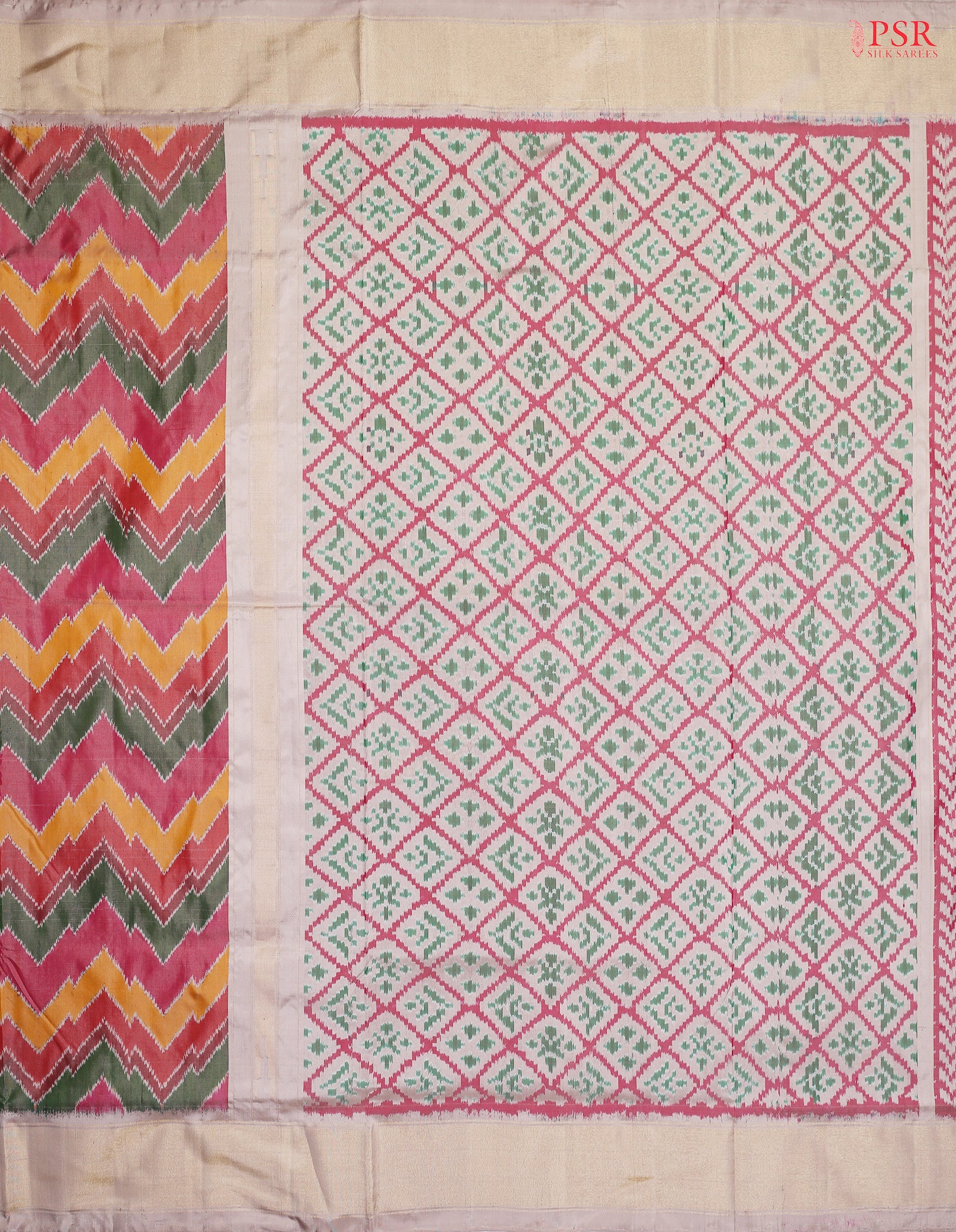 Step into a world of vibrant heritage with this Multicolor Pochampally Silk Saree, perfectly paired with a soft Olive Grey contrast. The saree showcases retro multicolor zig zag stripes that reflect timeless charm, enhanced by a Light Grey pallu adorned with traditional ikat weaves. Finished with a Light Grey tissue border and plain blouse, this saree strikes the perfect balance between bold and elegant — ideal for festive wear or graceful day functions.