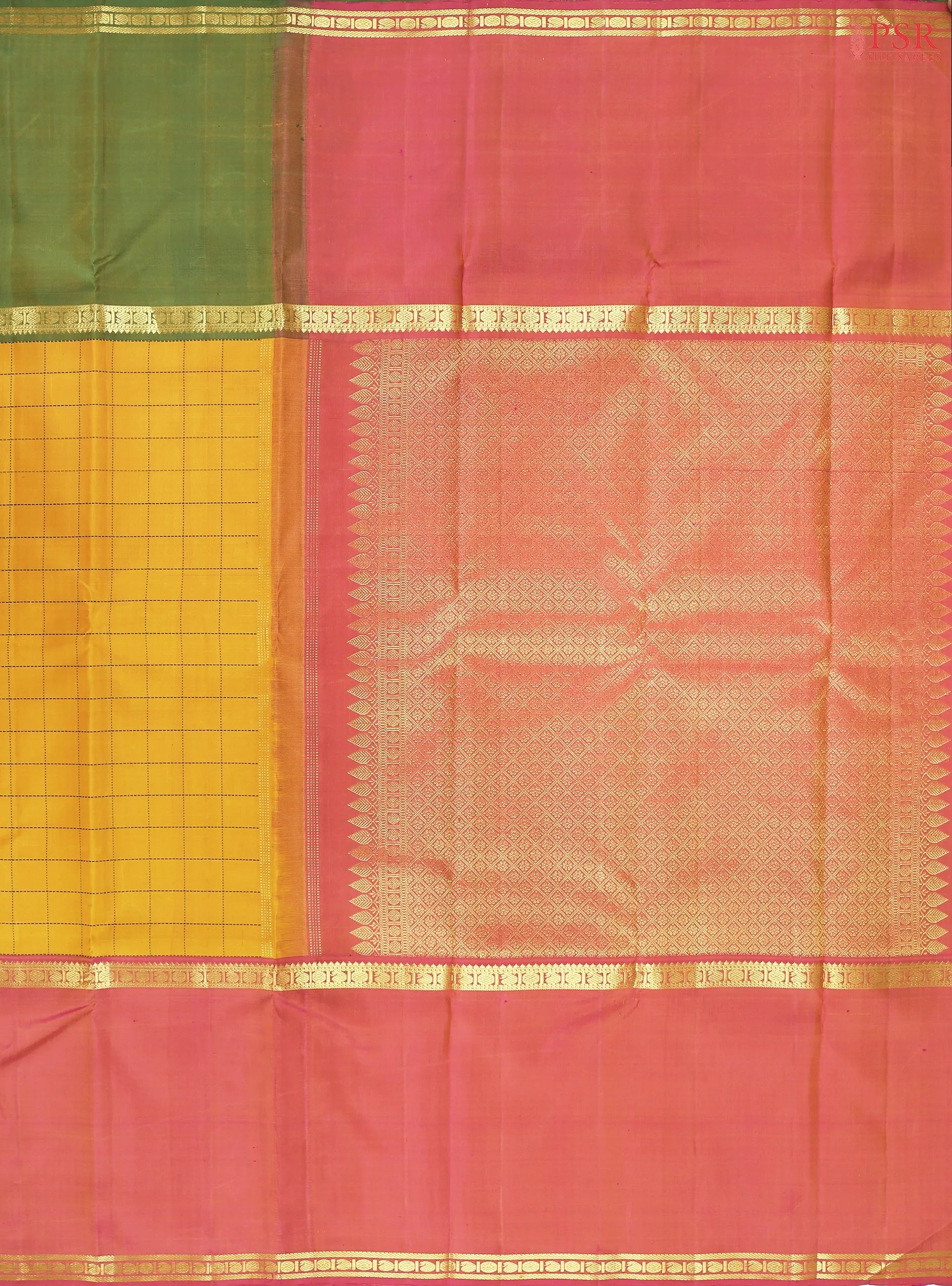 PSR Silk Sarees presents a radiant Mustard Yellow Kanchipuram Silk Saree from the “Smartika Kanjivaram” collection, beautifully paired with shades of Rouge Pink and Green.