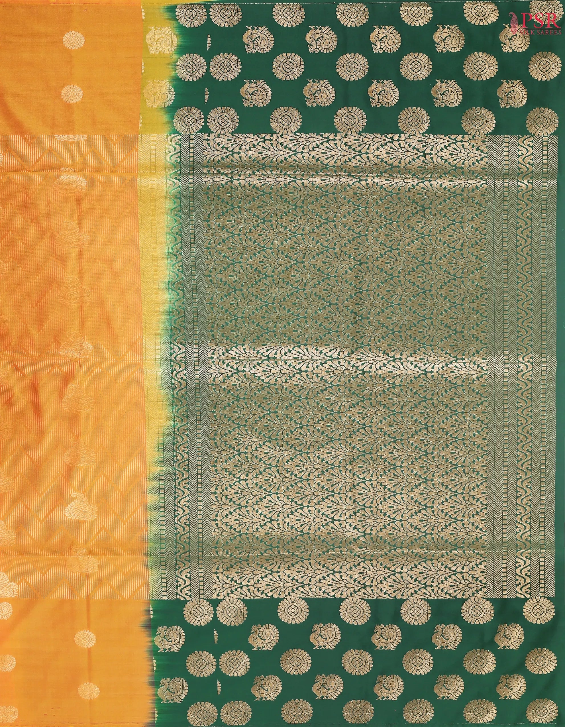 PSR Silk Sarees presents a Mustard Yellow Soft Art Silk Saree with combination of Dark Green color.