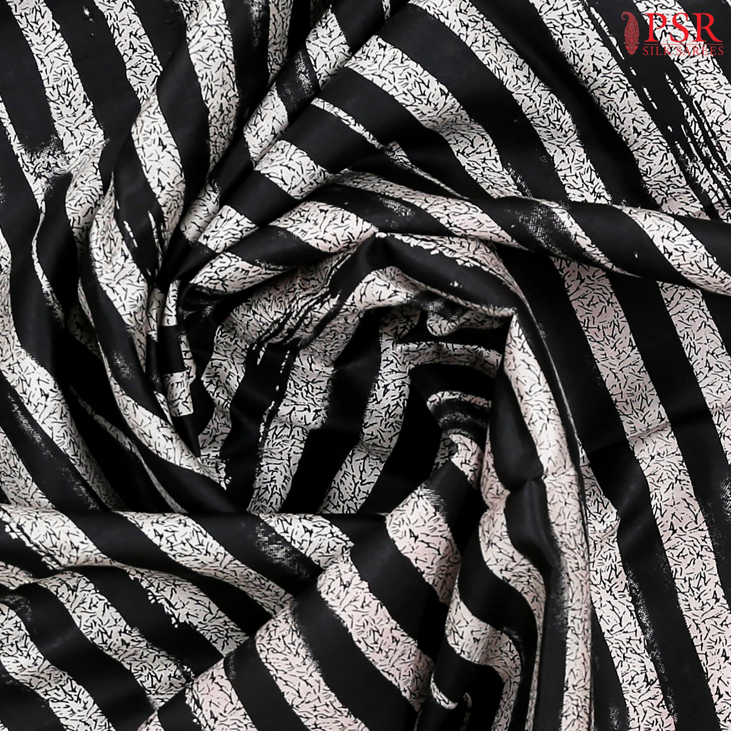 The saree features a designer printed stripe pattern that adds a touch of modern flair to its traditional base. An elegantly printed pallu enhances its visual appeal, making it a versatile choice for both festive and casual occasions.