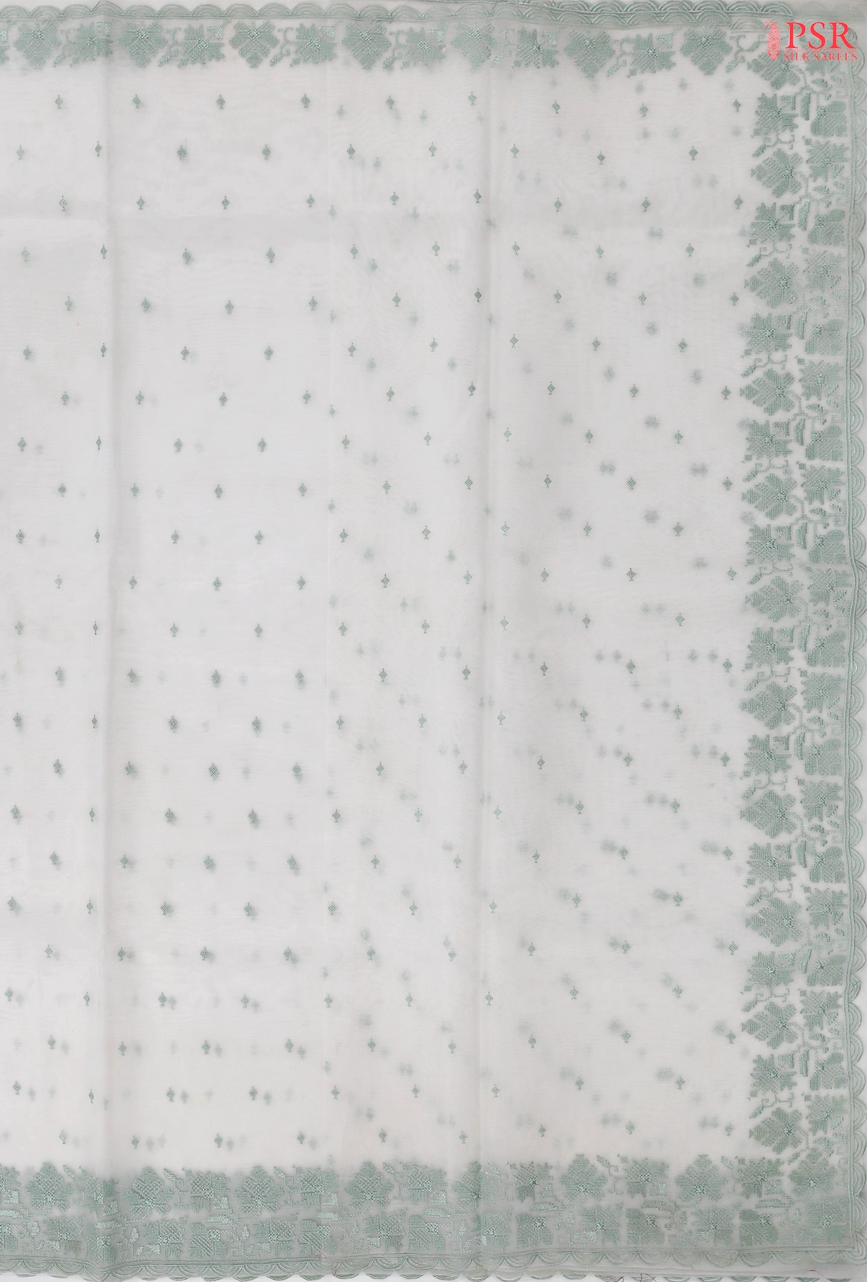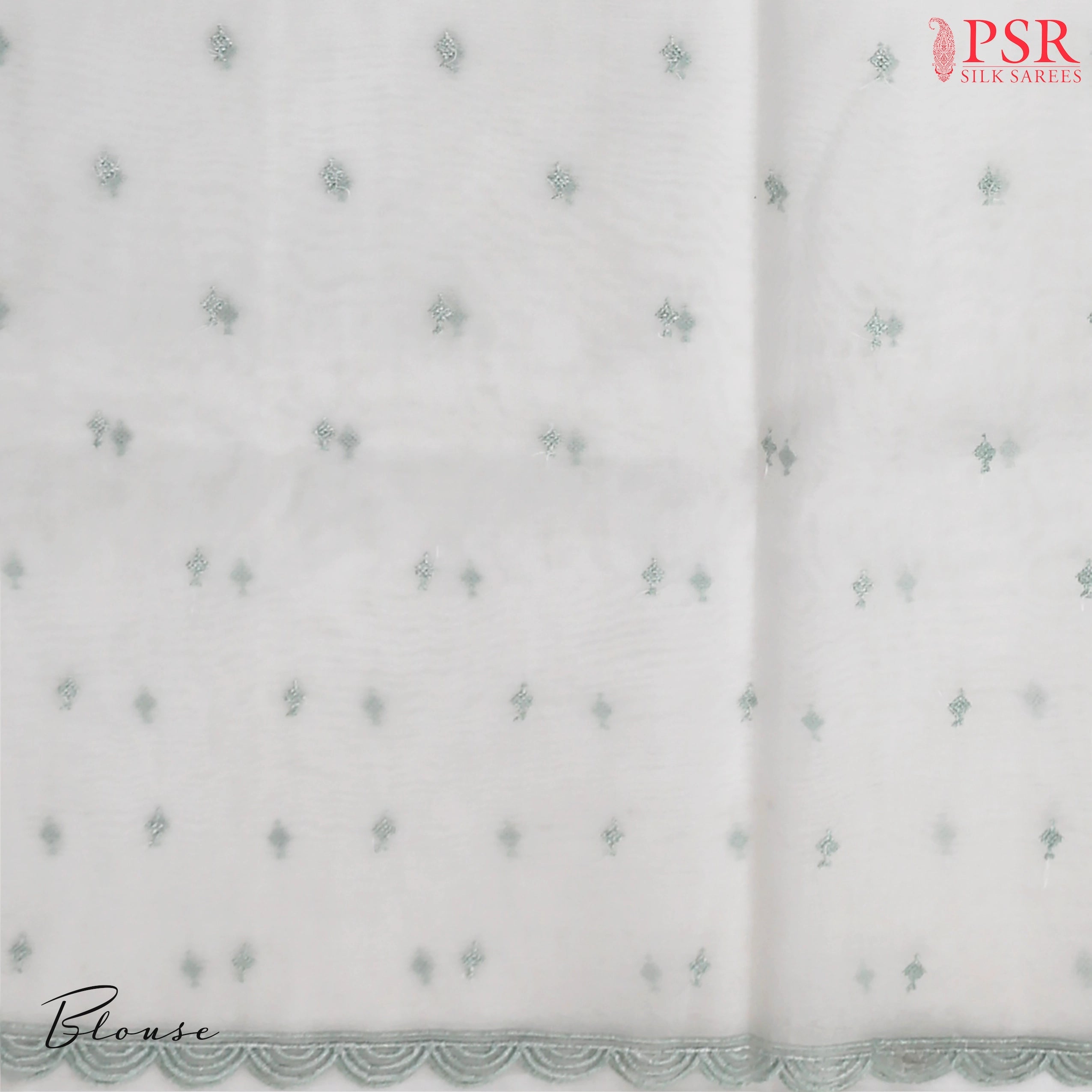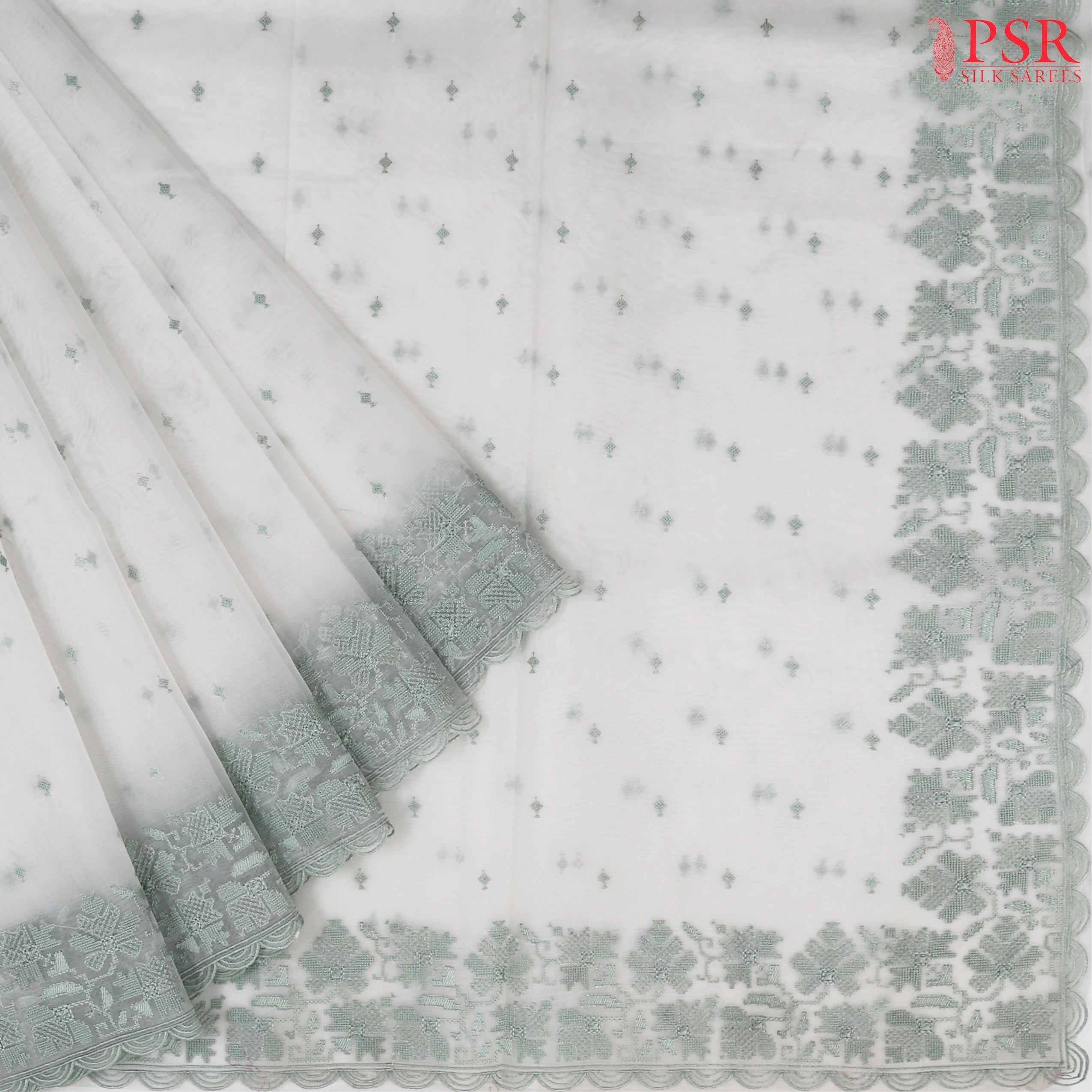 PSR Silk Sarees presents an Off White colored Organza saree with combination of Fresh Mint color.