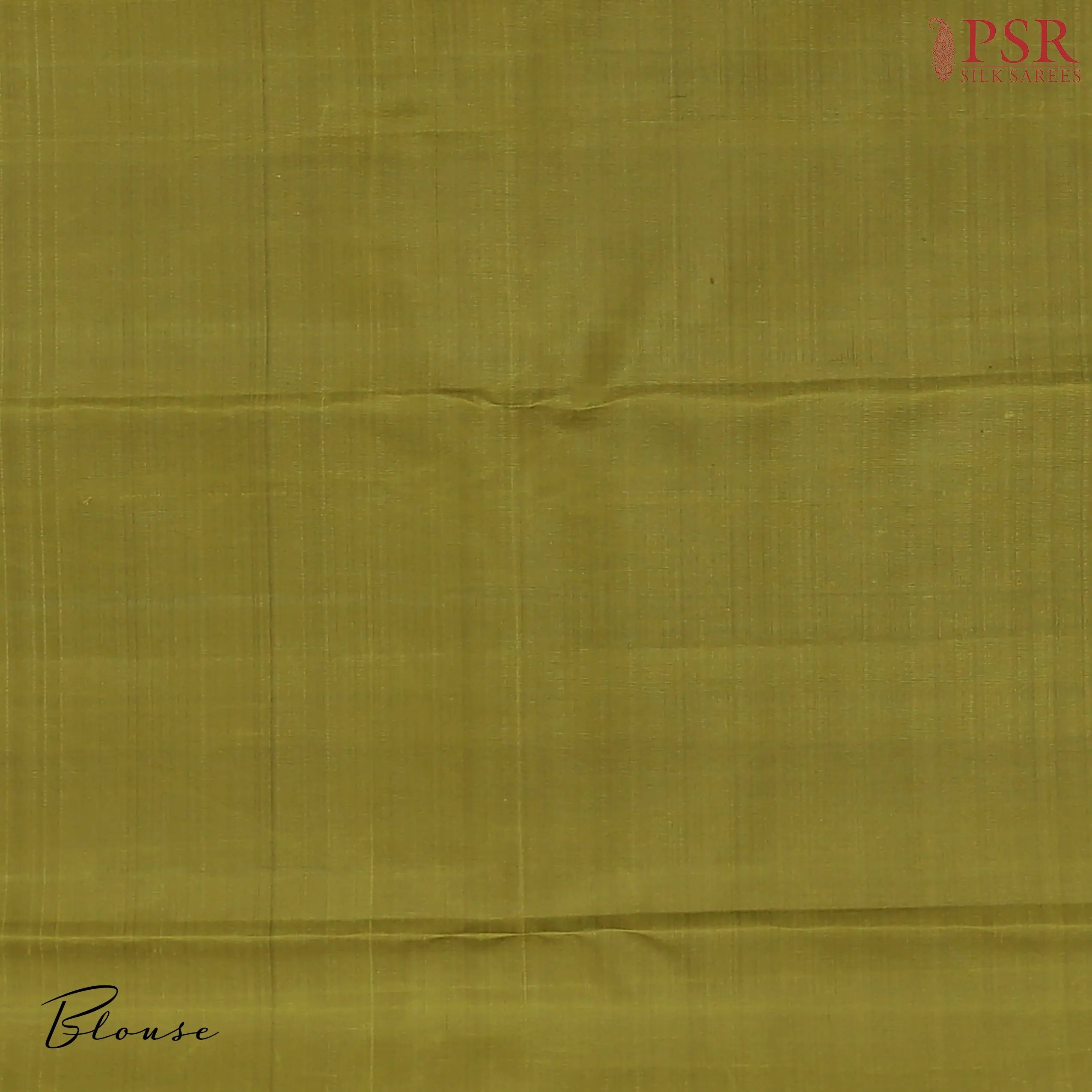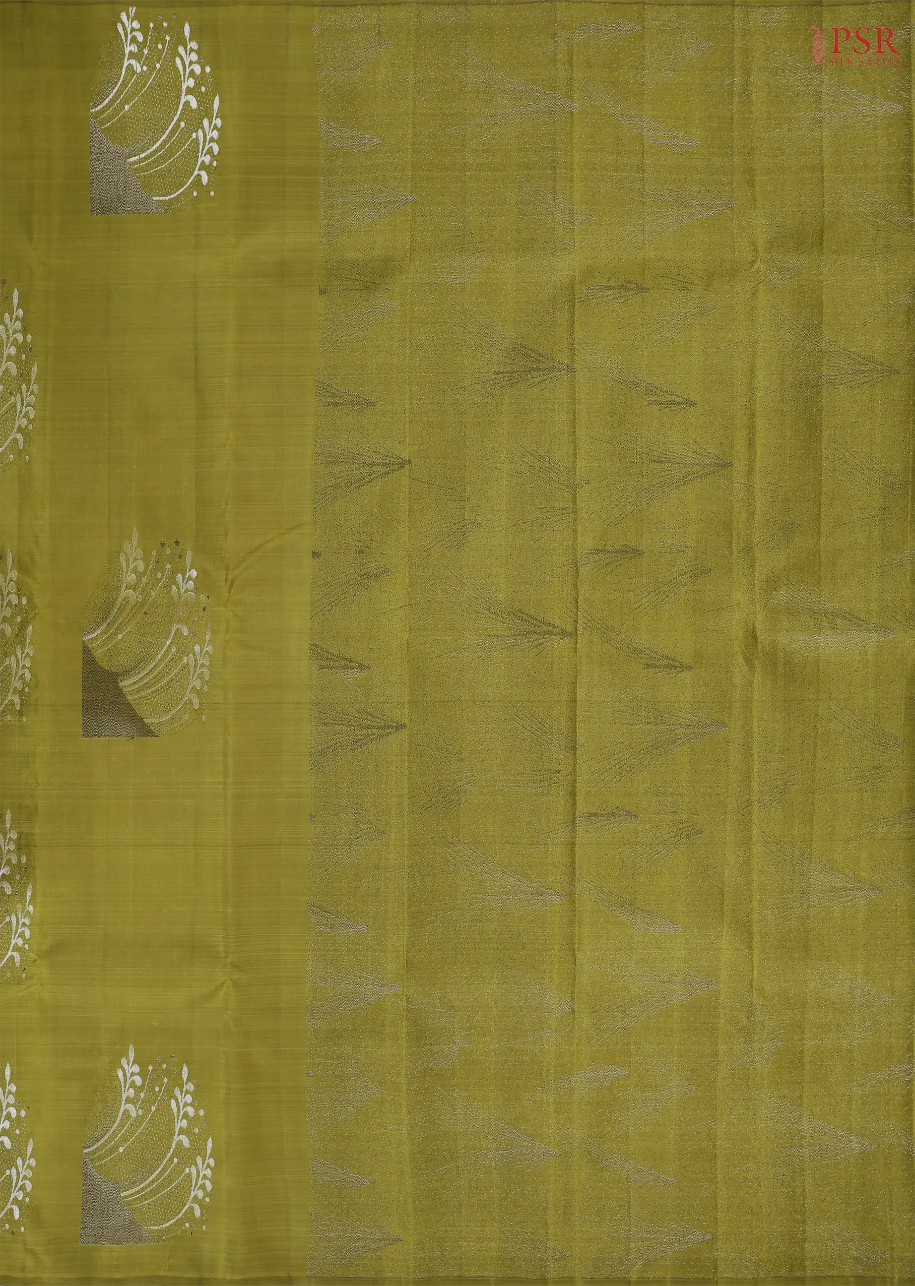 Turn heads with this vibrant Olive Green Kanchipuram Silk Saree from the Smartika Kanjivaram collection by PSR Silk Sarees. The saree showcases elegant mixed zari floral motifs weaves across the body, adding a timeless charm to its vivid hue.