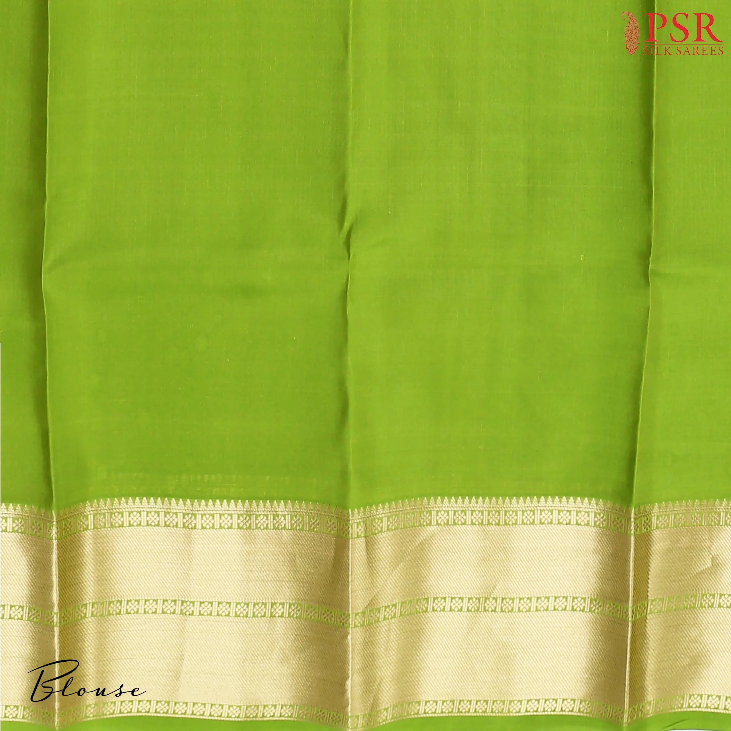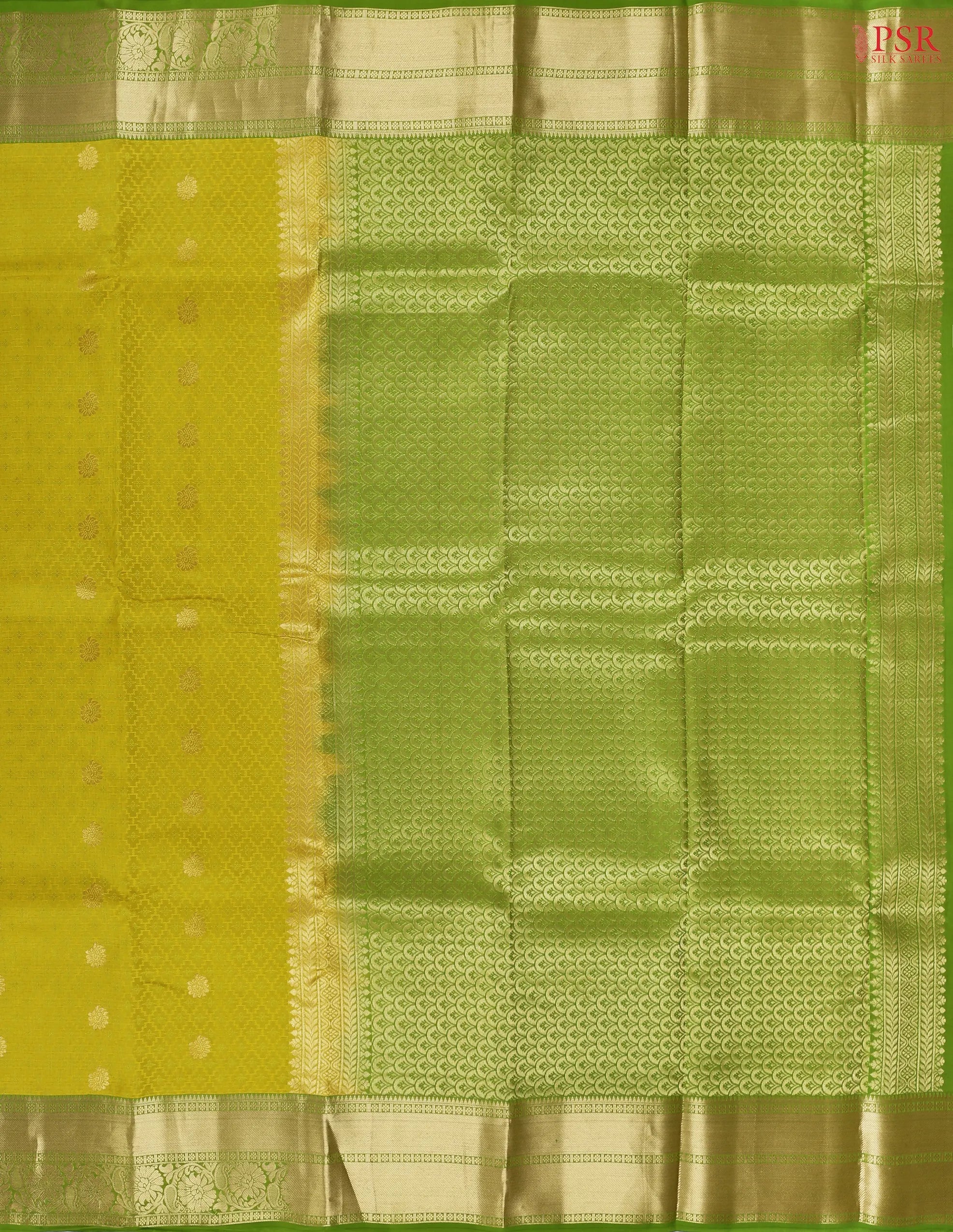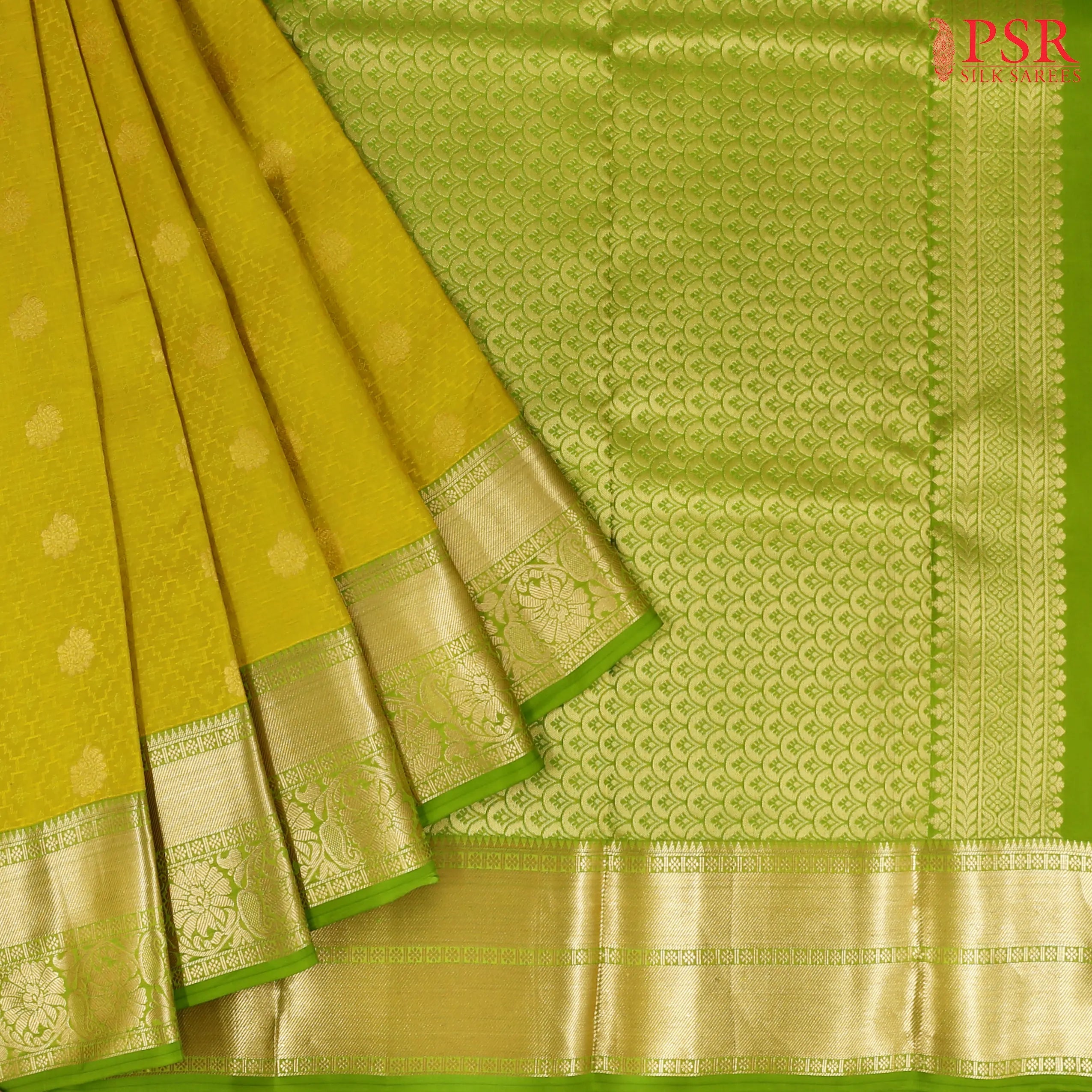 PSR Silk Sarees presents an Olive Yellow colored Fancy Kanchipuram Silk with combinaion of Parrot Green color.
