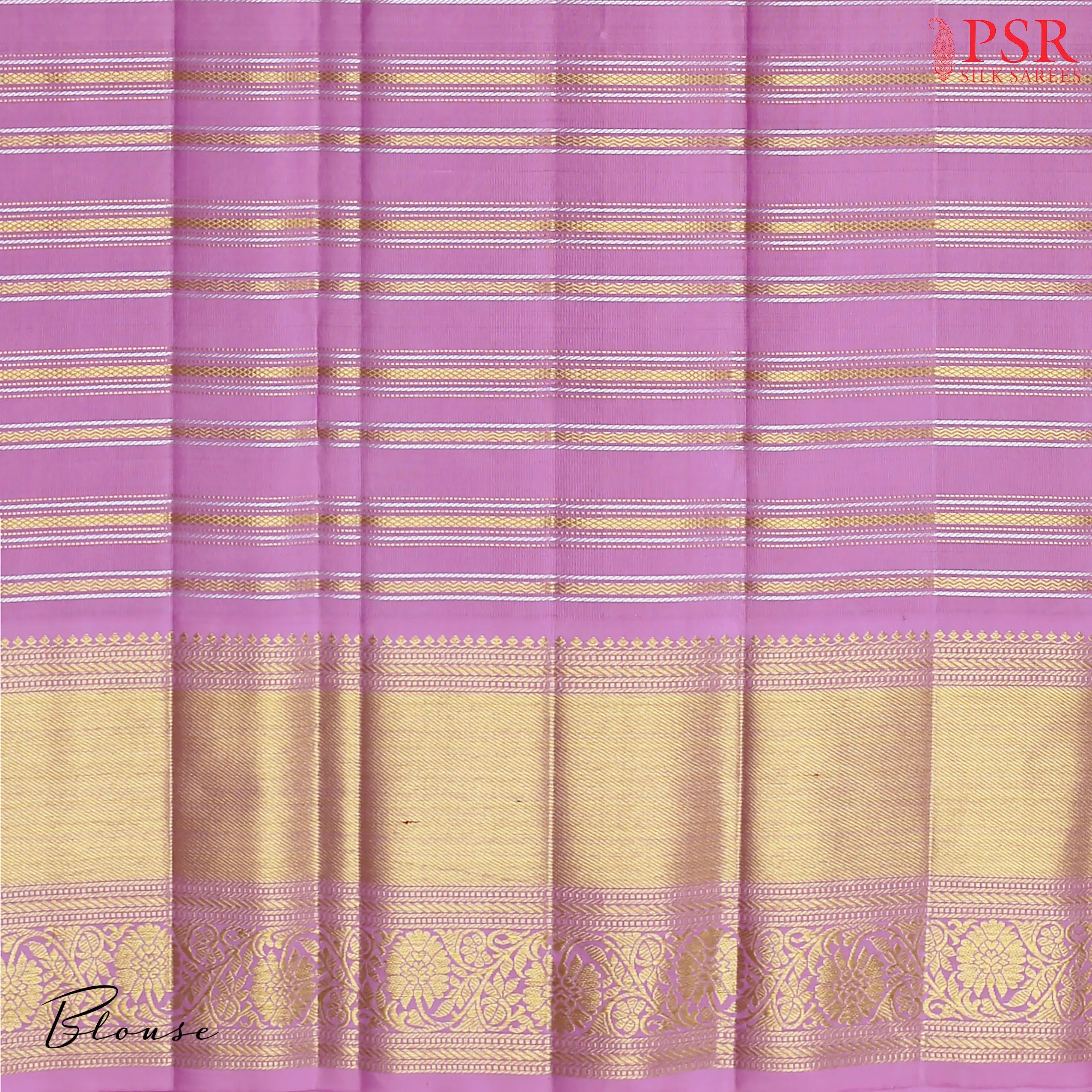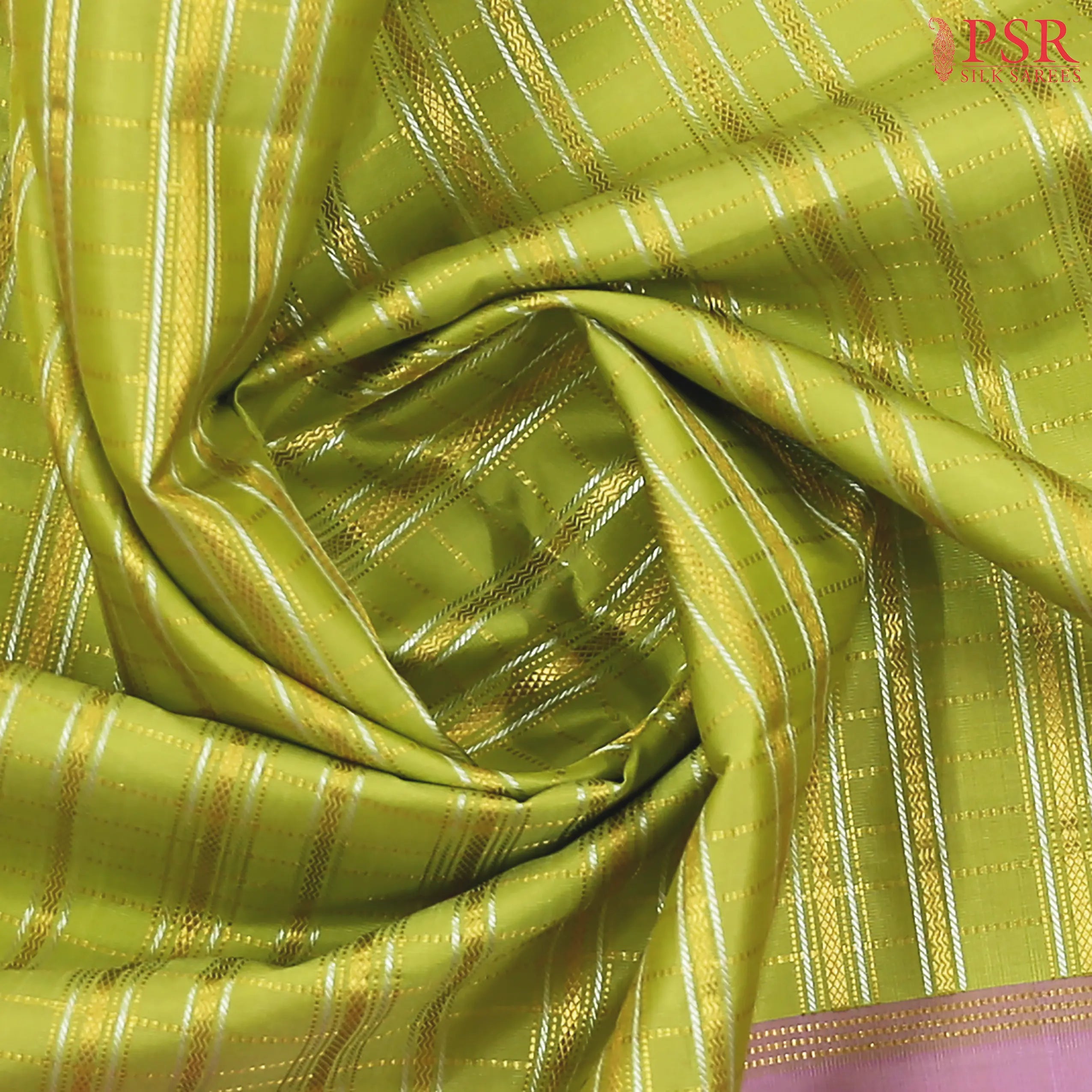 PSR Silk Sarees unveils a vibrant Chartreuse Green Kanchipuram Silk Saree from its prestigious Shrestha Kanjivaram collection, paired elegantly with Light Pink accents. This exquisite saree features delicate zari plaids pattern beautifully enhanced by silver and golden zari weaves, creating a graceful interplay of textures. The look is completed with a Light Pink-colored rich & traditional zari work pallu and border, adding subtle sophistication. A zari striped Light Pink blouse adds balance and elegance to this timeless ensemble.